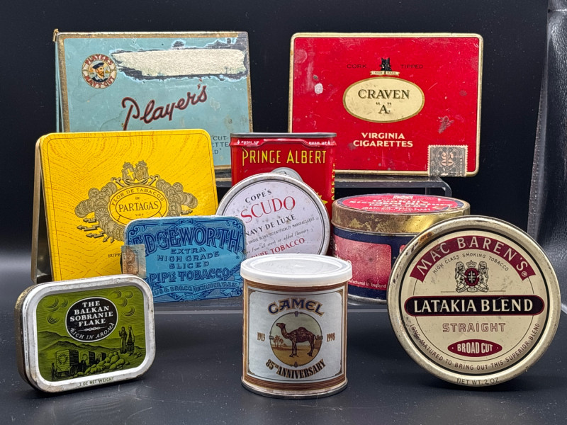 Great collection of vintage tobacco and cigarette tins featuring several well-known historic brands. This nostalgic lot includes colorful advertising tins from classic tobacco companies and makes a fantastic display group for collectors. The lot includes multiple brands that were staples of early to mid-20th century tobacco advertising. These tins are popular among collectors because of their bold graphics, iconic brand names, and nostalgic packaging designs. Visible brands in the lot include: • Prince Albert tobacco tin The variety of shapes, colors, and brands makes this a great instant display collection for tobacco memorabilia enthusiasts. • Lot includes multiple vintage tobacco and cigarette tins Vintage condition with wear, scratches, and age-related patina consistent with use and storage. 📦 Shipping available. Tobacco tins became highly collectible because companies invested heavily in colorful lithographed advertising designs to stand out on store shelves. Many collectors today enjoy displaying these tins as examples of early advertising and packaging history.