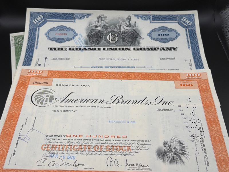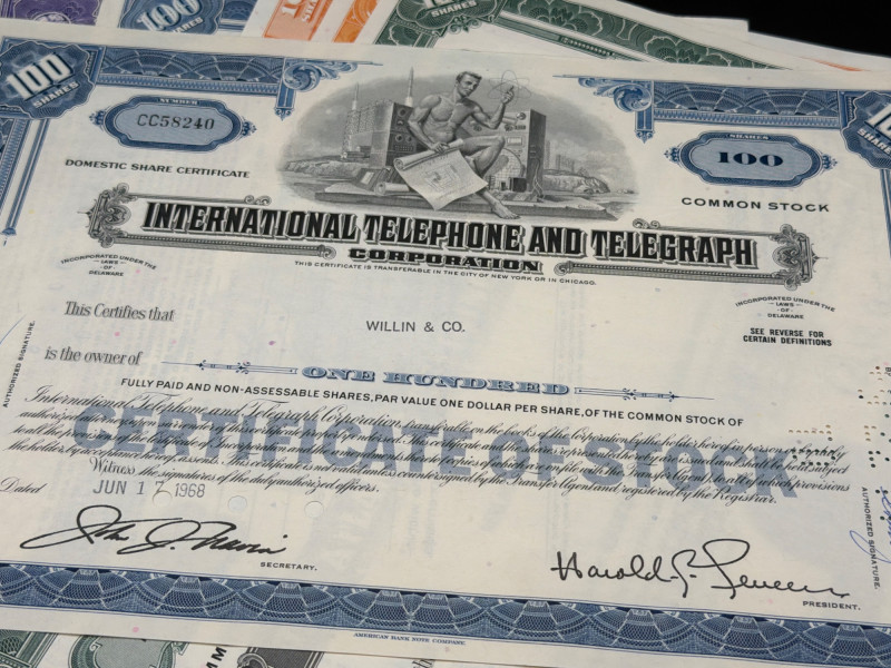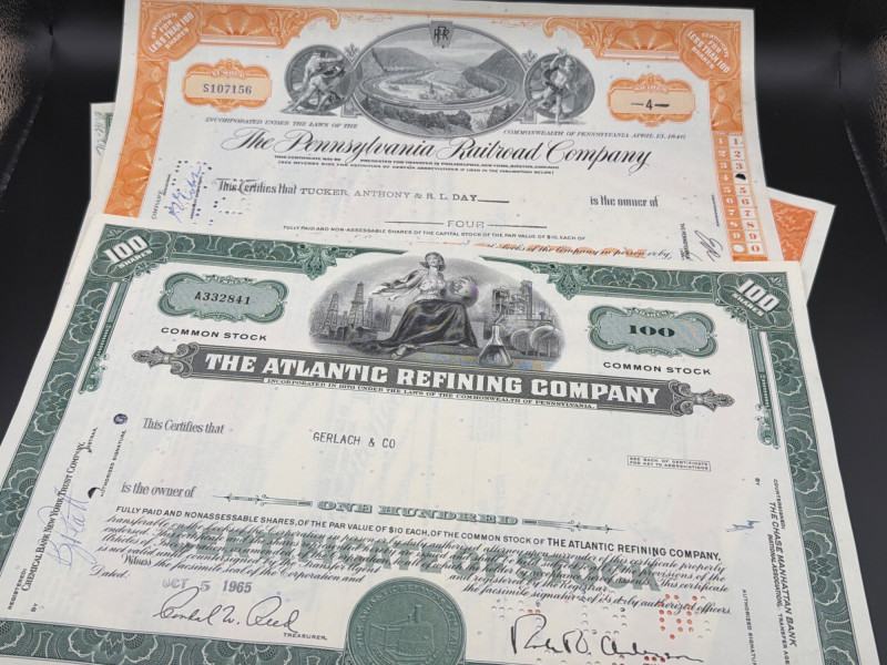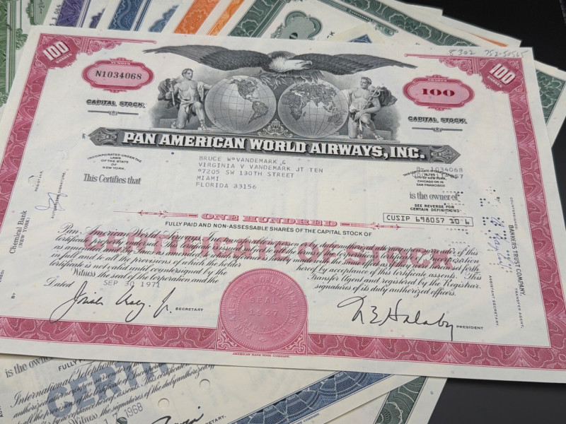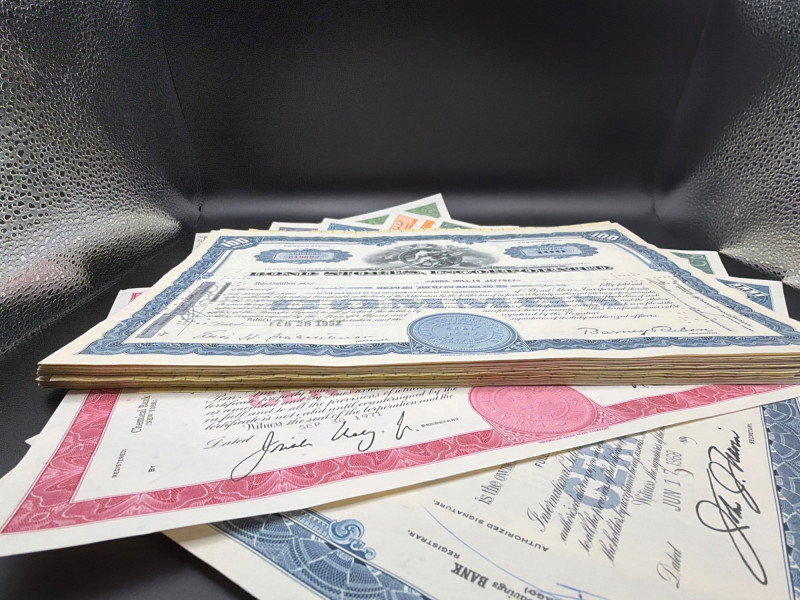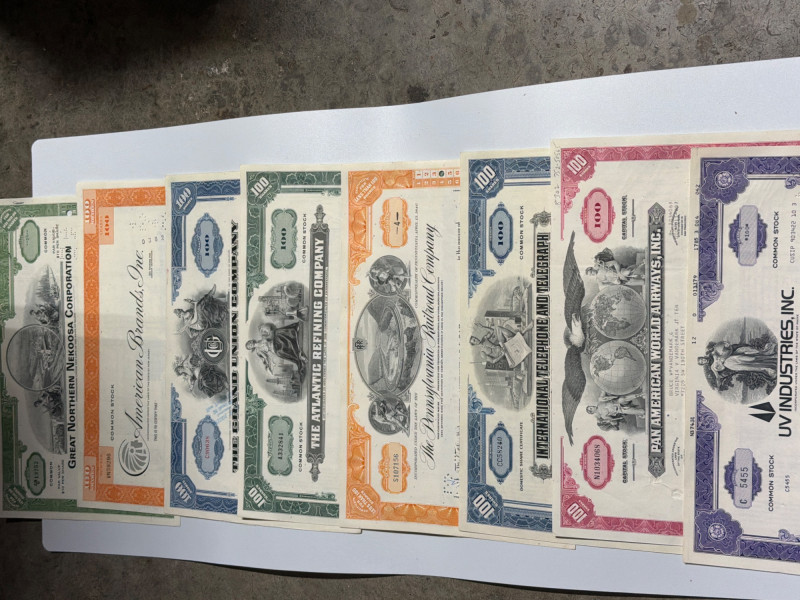 Large lot of vintage stock and bond certificates from a variety of historic companies and industries. These beautifully engraved financial documents are popular with collectors of scripophily, the hobby of collecting antique stocks and bonds. Many certificates feature intricate engraved artwork, decorative borders, corporate seals, and historical company names, making them appealing both for collecting and display. Examples visible in this lot include certificates from companies such as: These certificates represent a fascinating snapshot of American corporate and financial history, with many dating to the mid-20th century era when printed certificates were commonly issued to shareholders. Large mixed lots like this are especially popular with scripophily collectors, history enthusiasts, investors interested in financial history, and decorators who frame these certificates as wall art. With Easter approaching, collectible items like these can also make fun additions to Easter baskets, egg hunt prizes, or gifts for history buffs and collectors. Please review photos carefully for the exact certificates included in this auction lot. Pre-owned vintage certificates showing normal age-related wear such as light folds, edge wear, and storage marks. Overall good collectible condition for vintage financial documents. Please review photos for details. Shipping available. Combined shipping offered for multiple auction wins whenever possible. Antique stock and bond certificates have become collectible because of their engraved artwork, historical company connections, and decorative printing techniques. This hobby, known as scripophily, attracts collectors who enjoy researching historic companies and preserving pieces of financial history. Many collectors also frame certificates due to their elaborate designs and historical significance. Companies represented in these certificates often span industries such as airlines, railroads, insurance, telecommunications, manufacturing, and energy, reflecting the growth of American industry throughout the 19th and 20th centuries.