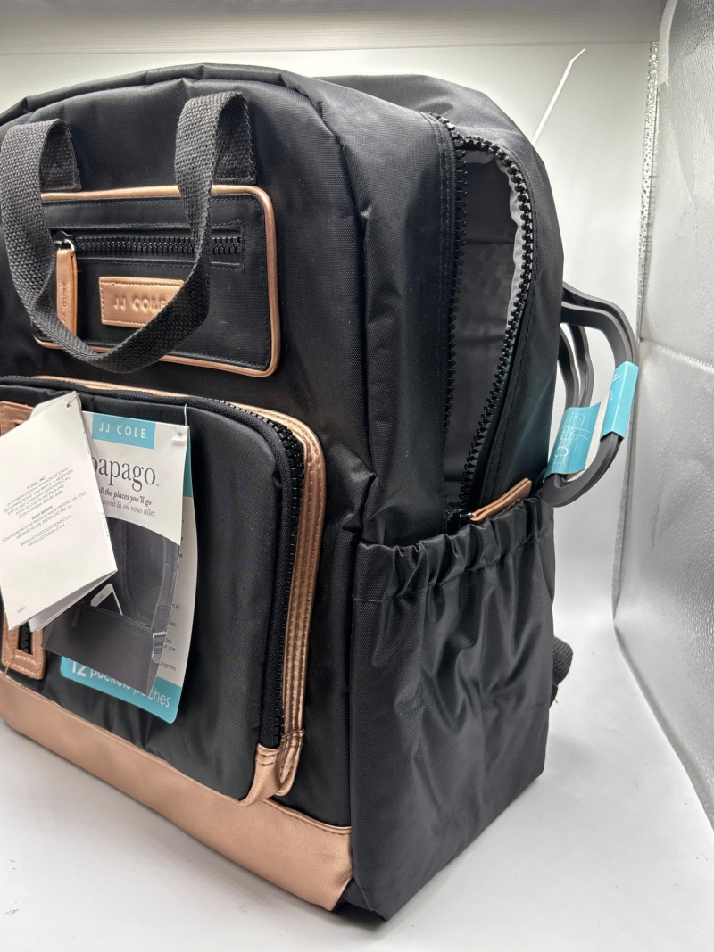 A new JJ Cole Papago diaper backpack designed to keep parents organized while on the go. This modern backpack combines practical storage with stylish black fabric and copper-tone accents, creating a sleek bag that works just as well for everyday use as it does for outings with baby. The Papago bag is designed with 12 pockets and pouches, making it easy to separate bottles, wipes, diapers, and personal items. The structured shape helps the bag stand upright while packing or accessing items, and the multiple zip compartments keep everything secure and easy to find. Backpack-style diaper bags like this are especially popular because they keep your hands free while carrying baby gear, making trips to the park, travel, or everyday errands much easier. With Easter approaching, items like this can also make great gifts for expecting parents, baby showers, or Easter baskets for growing families. Please review photos to see the exact item included in this lot. New with tags. Appears unused and includes original packaging tags. Please review photos for details. Shipping available. Combined shipping offered for multiple auction wins whenever possible. JJ Cole is known for producing functional and thoughtfully designed baby gear, including diaper bags that balance style with organization. The Papago line is especially popular for its multi-pocket layout and durable materials, making it a practical choice for daily parenting needs.
