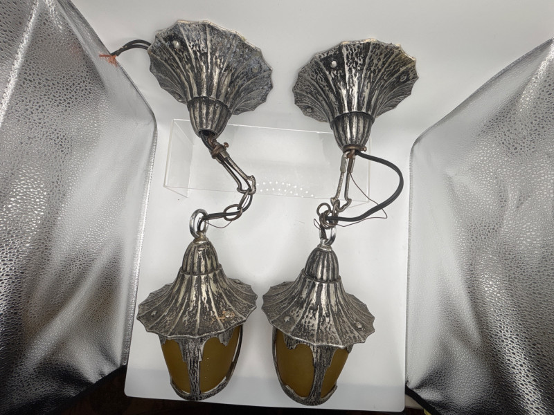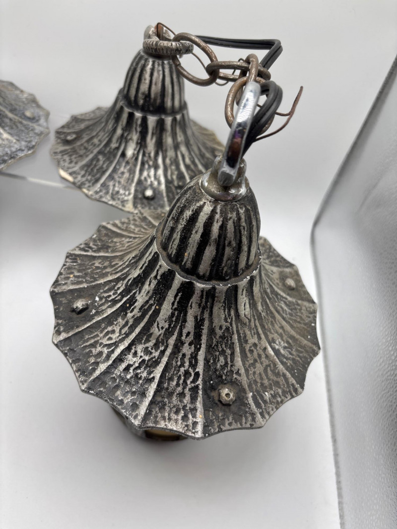 lot features a pair of vintage aluminum hanging lights with beautifully