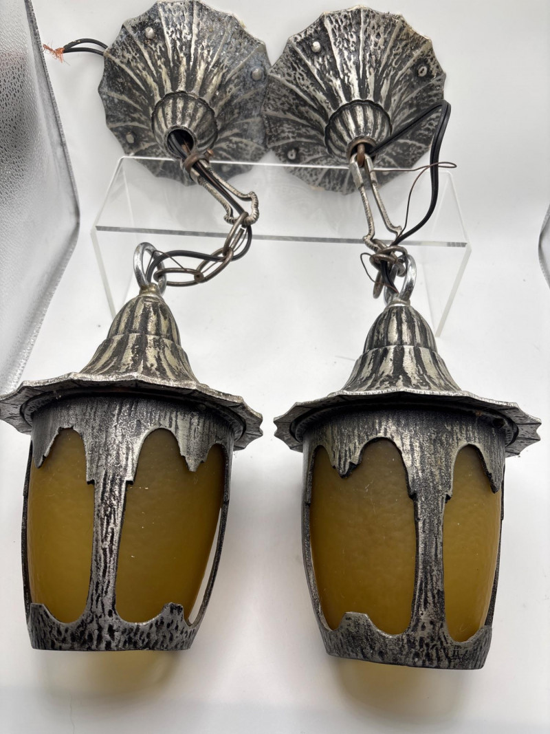 Lot # 7 - Vintage Aluminum Hanging Lights Pair Amber Glass Mid Century