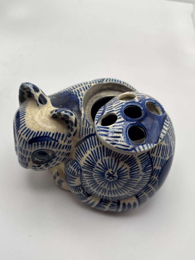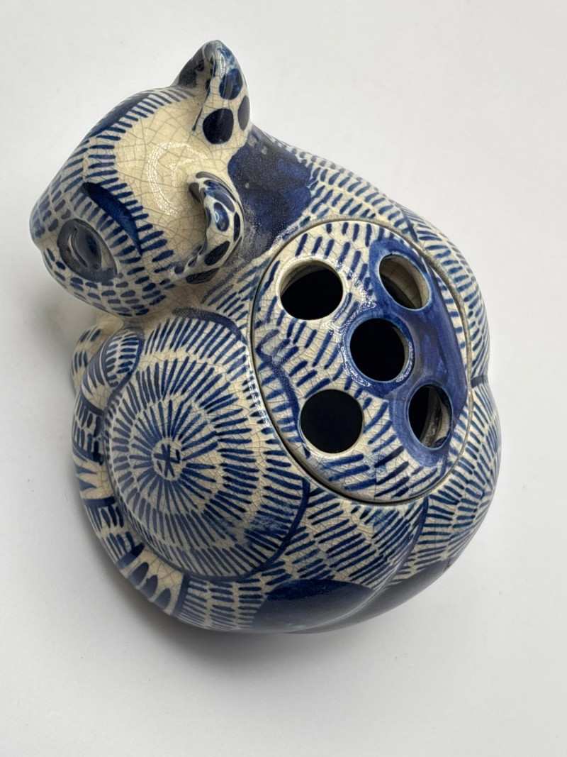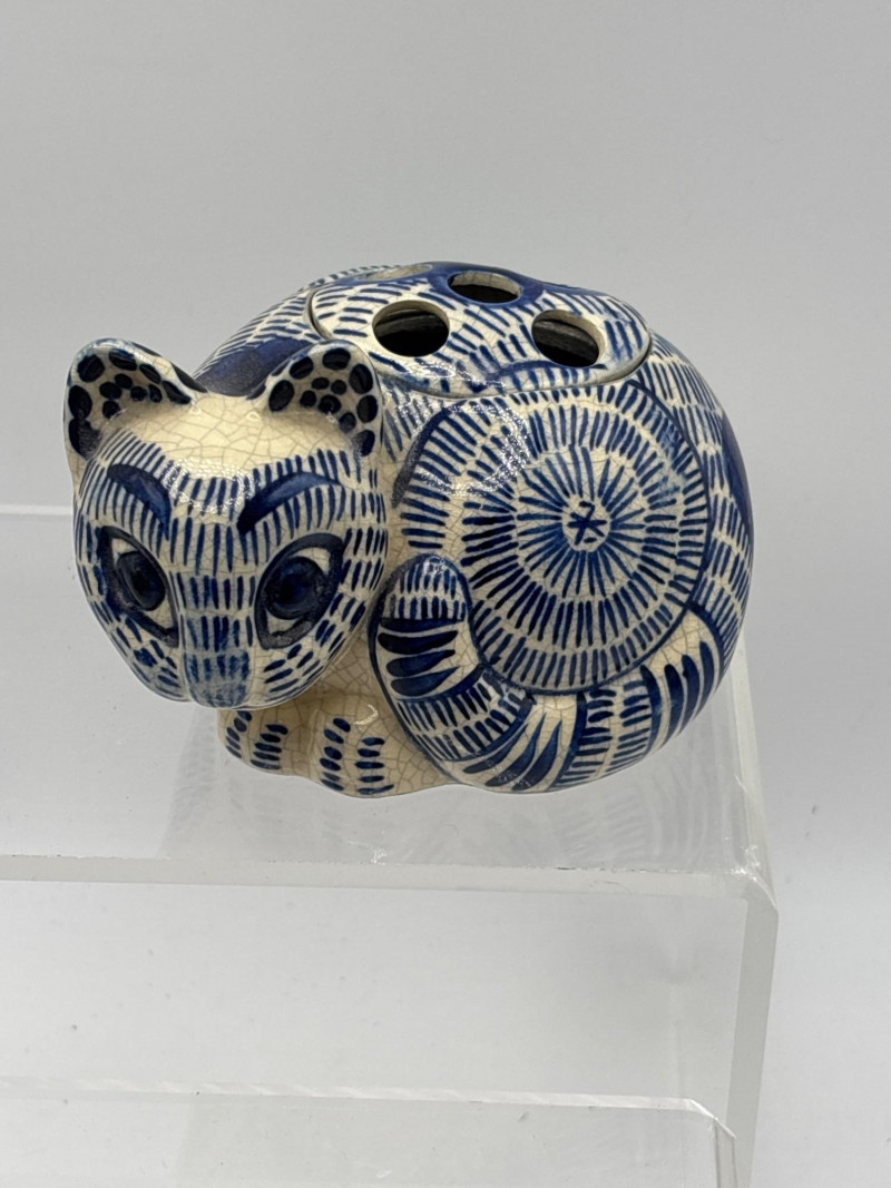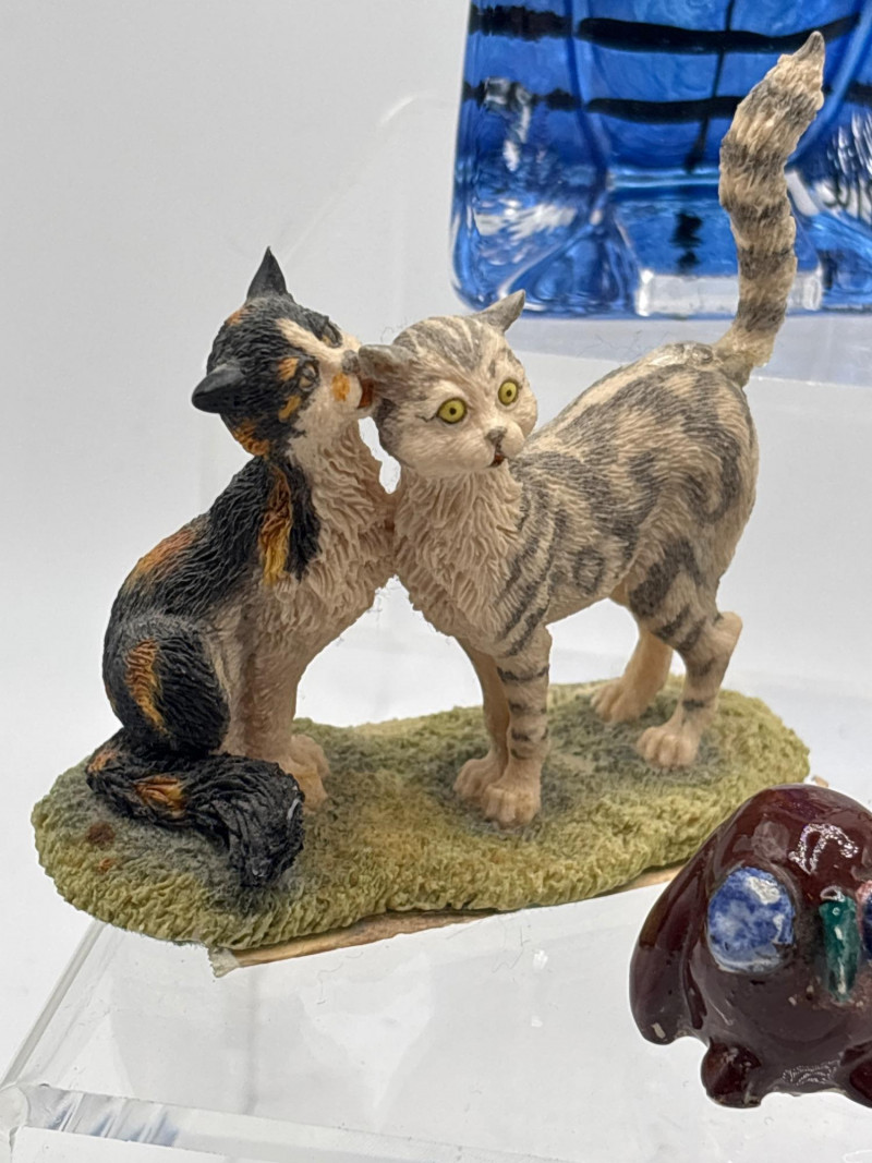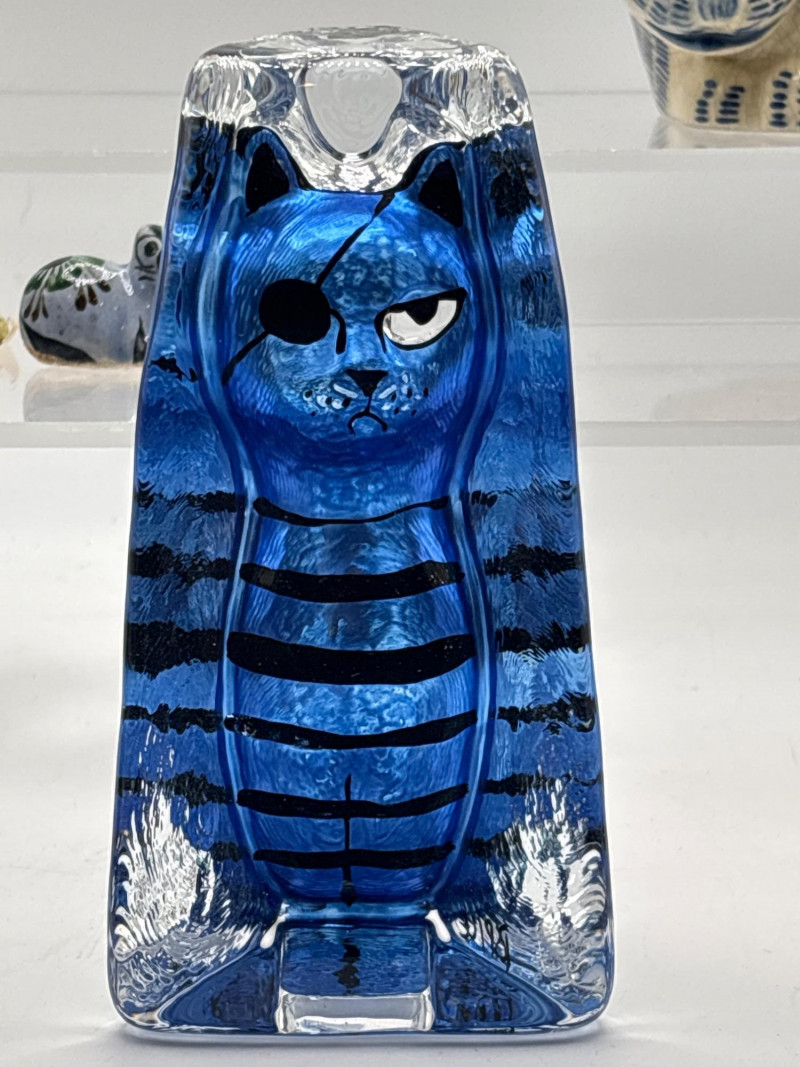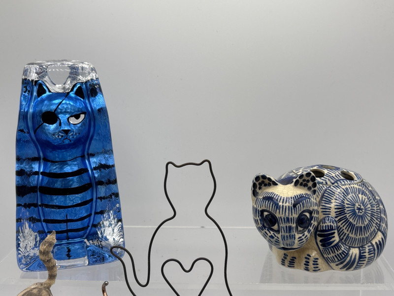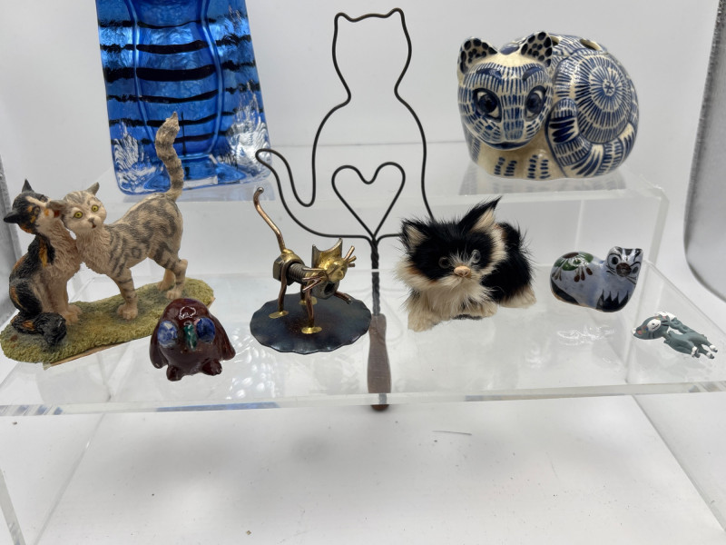 & Co. ceramic cat (1978), a striking blue art glass cat, and a variety of