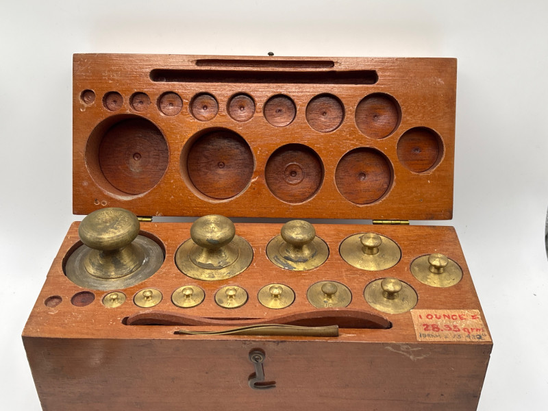 complete vintage apothecary-style brass weight set housed in its original