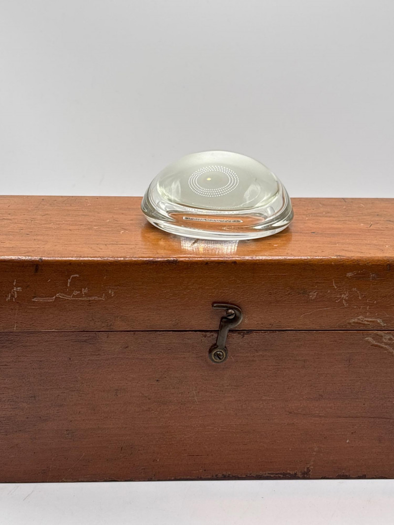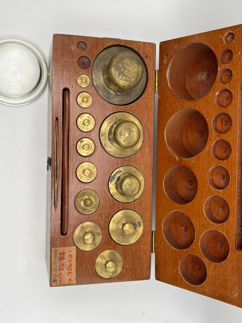 interior, along with a glass magnifying lens. The weights show stamped markings