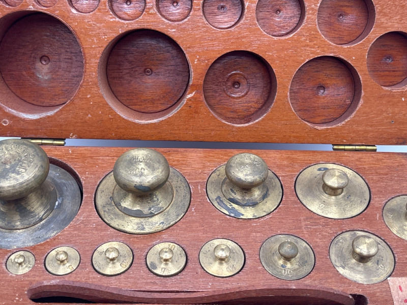 lot includes multiple graduated brass weights, each fitted into a custom wood