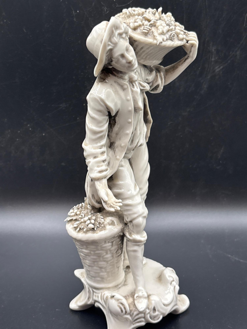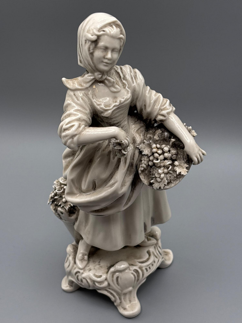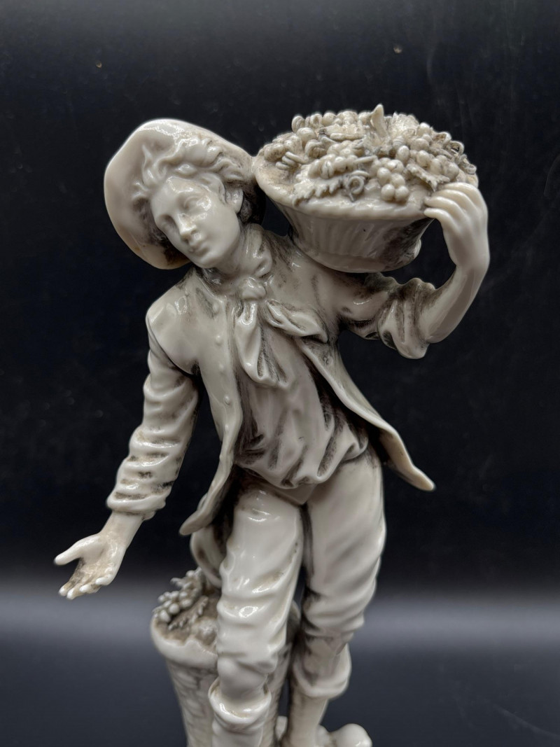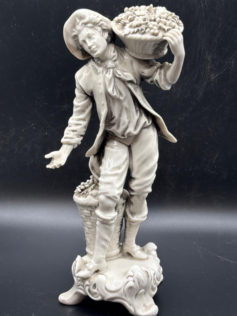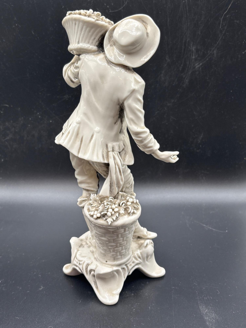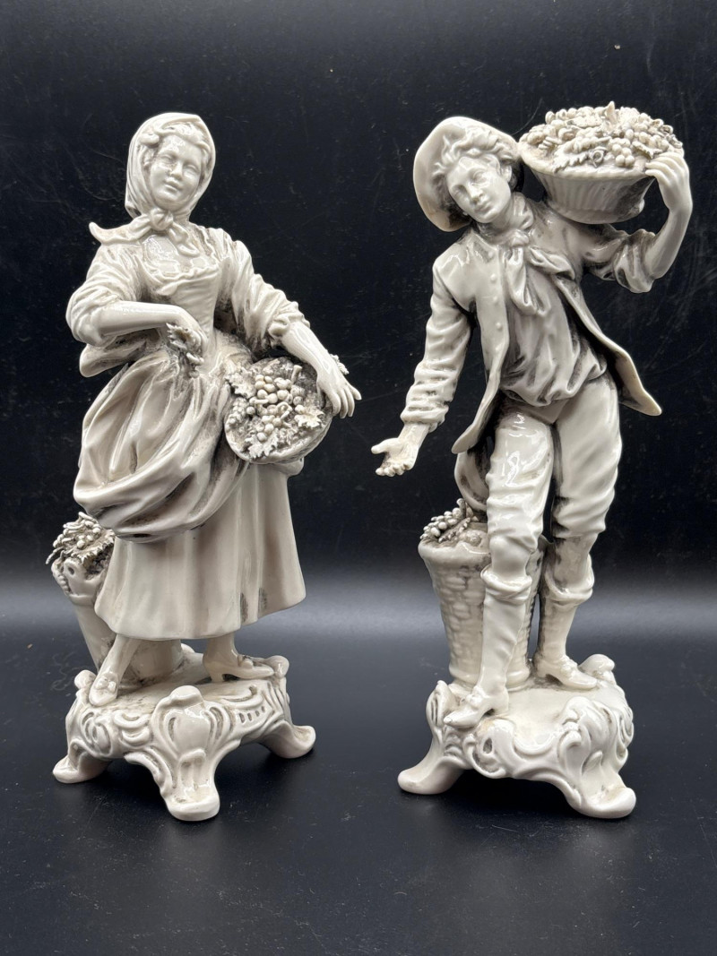 Own a rare, dated mid-century treasure featuring the exquisite hand-painted detail and "Old World" artistry of the renowned Italian Capodimonte tradition. These remarkable 1963 figurines, individually signed by master decorators Pavia and Mortimer, represent the pinnacle of Neapolitan-style porcelain, capturing the romanticized spirit of 18th-century Italian street life with breathtaking realism. The lot includes a matching pair: a young man and woman, each carrying bountiful baskets of grapes and fruit. Standing on ornate Rococo-style scrolling bases, these pieces feature the iconic Blue Crowned "N" mark and are hand-inscribed with the production date of December 25, 1963. The soft matte finish and delicate pastel palette highlight the intricate textures of the woven baskets and the draped fabric of their attire. These are not merely decorations; they are documented snapshots of Italian ceramic history that command attention in any serious porcelain collection. Condition: Excellent vintage condition. The porcelain remains vibrant with no major chips, cracks, or repairs noted. Some light age-related shelf wear on the underside of the bases is consistent with their 60+ year history. Please refer to high-resolution photos for details on the artists' signatures and factory marks. ✔️ Shipping availableShipping
