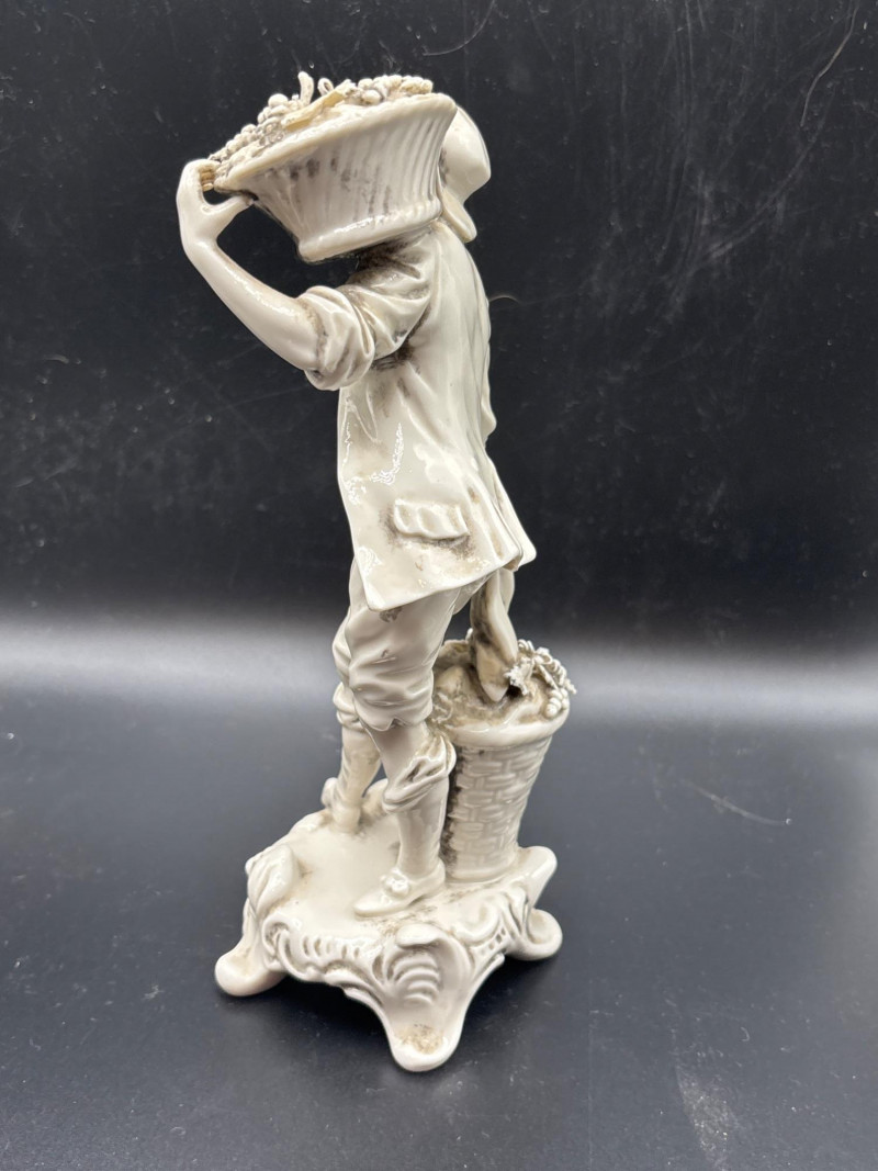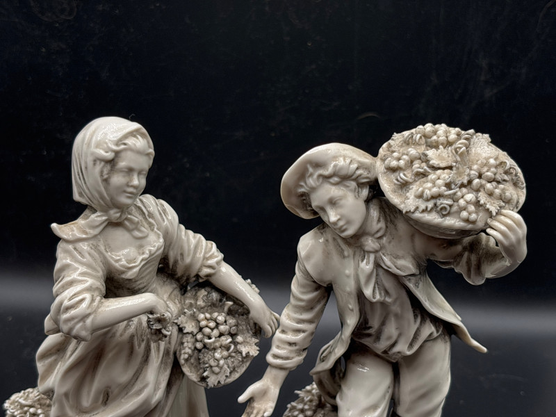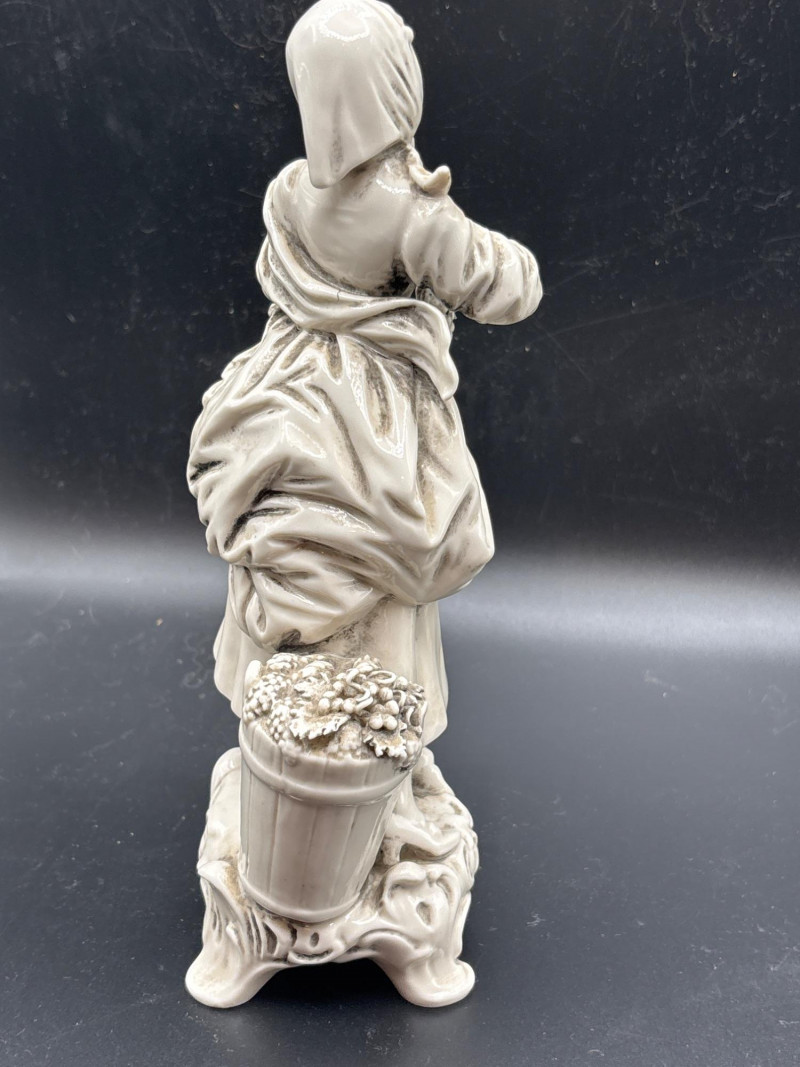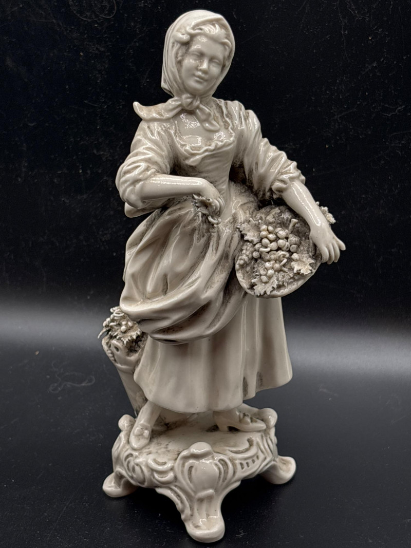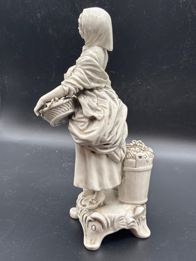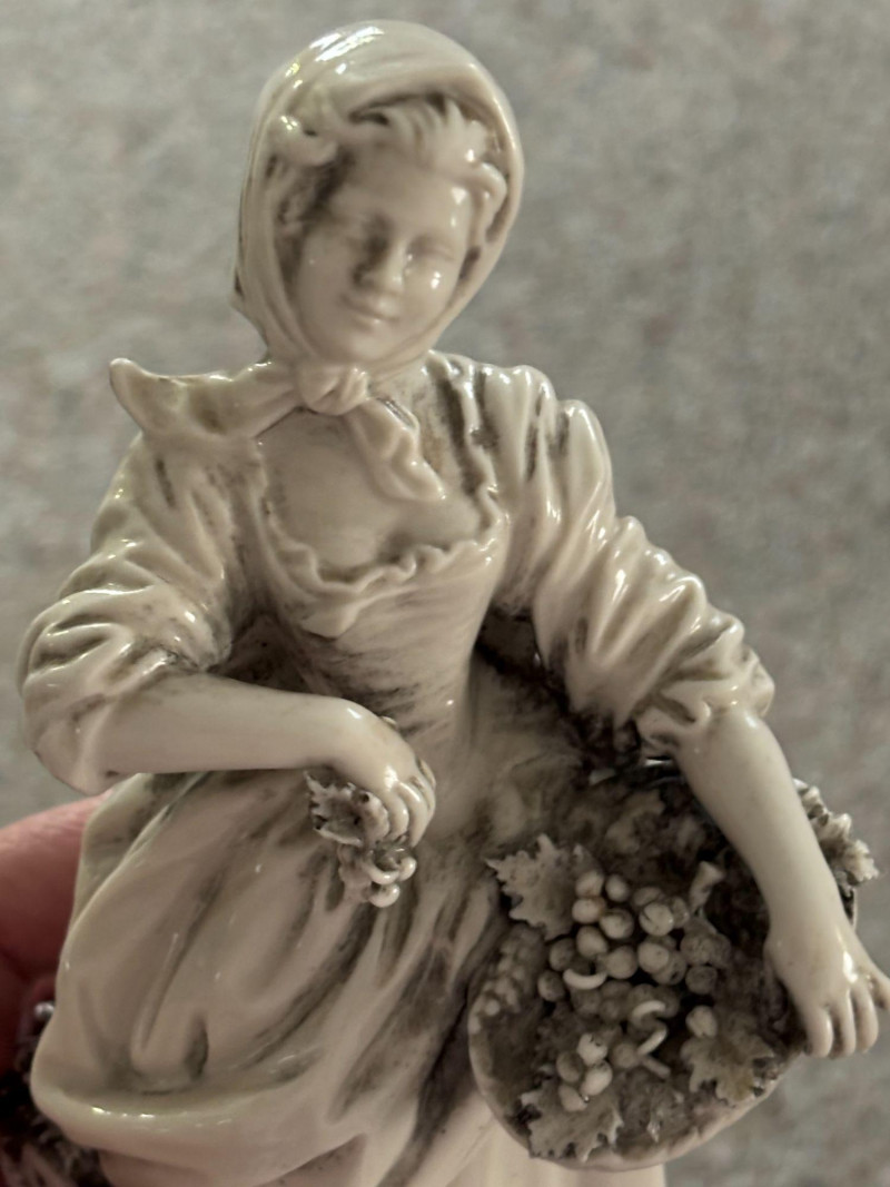 Own a rare, dated mid-century treasure featuring the exquisite hand-painted detail and "Old World" artistry of the renowned Italian Capodimonte tradition. These remarkable 1963 figurines, individually signed by master decorators Pavia and Mortimer, represent the pinnacle of Neapolitan-style porcelain, capturing the romanticized spirit of 18th-century Italian street life with breathtaking realism. The lot includes a matching pair: a young man and woman, each carrying bountiful baskets of grapes and fruit. Standing on ornate Rococo-style scrolling bases, these pieces feature the iconic Blue Crowned "N" mark and are hand-inscribed with the production date of December 25, 1963. The soft matte finish and delicate pastel palette highlight the intricate textures of the woven baskets and the draped fabric of their attire. These are not merely decorations; they are documented snapshots of Italian ceramic history that command attention in any serious porcelain collection. Condition: Excellent vintage condition. The porcelain remains vibrant with no major chips, cracks, or repairs noted. Some light age-related shelf wear on the underside of the bases is consistent with their 60+ year history. Please refer to high-resolution photos for details on the artists' signatures and factory marks. ✔️ Shipping availableShipping