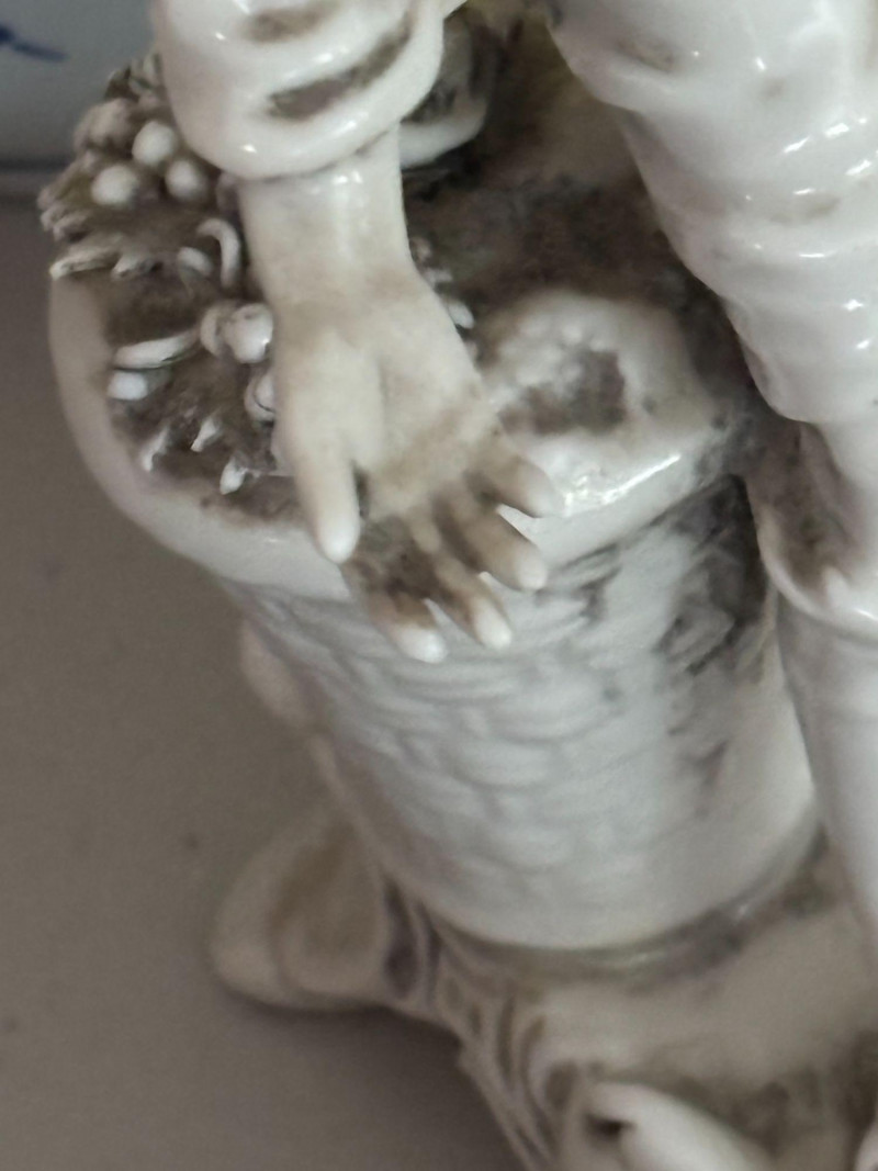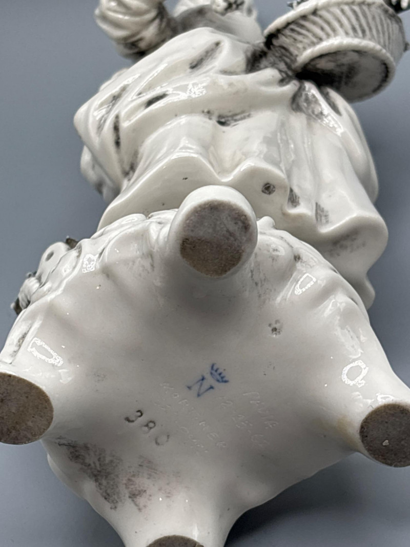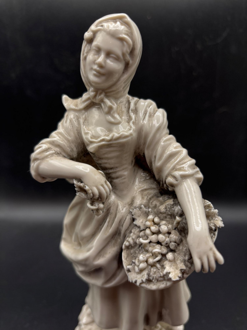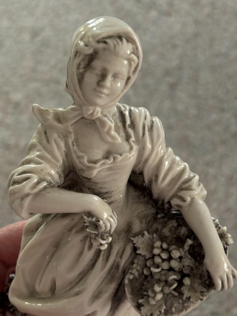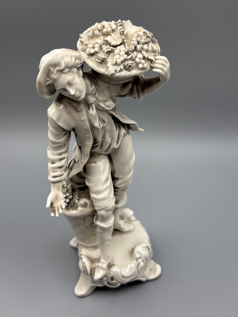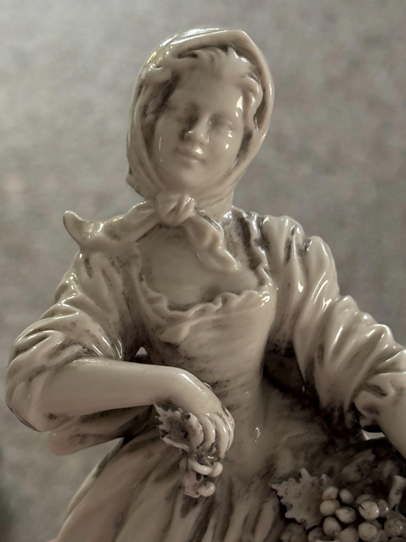 Own a rare, dated mid-century treasure featuring the exquisite hand-painted detail and "Old World" artistry of the renowned Italian Capodimonte tradition. These remarkable 1963 figurines, individually signed by master decorators Pavia and Mortimer, represent the pinnacle of Neapolitan-style porcelain, capturing the romanticized spirit of 18th-century Italian street life with breathtaking realism. The lot includes a matching pair: a young man and woman, each carrying bountiful baskets of grapes and fruit. Standing on ornate Rococo-style scrolling bases, these pieces feature the iconic Blue Crowned "N" mark and are hand-inscribed with the production date of December 25, 1963. The soft matte finish and delicate pastel palette highlight the intricate textures of the woven baskets and the draped fabric of their attire. These are not merely decorations; they are documented snapshots of Italian ceramic history that command attention in any serious porcelain collection. Condition: Excellent vintage condition. The porcelain remains vibrant with no major chips, cracks, or repairs noted. Some light age-related shelf wear on the underside of the bases is consistent with their 60+ year history. Please refer to high-resolution photos for details on the artists' signatures and factory marks. ✔️ Shipping availableShipping