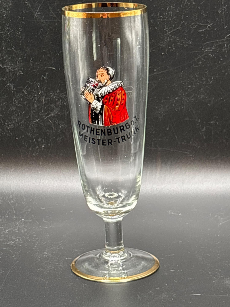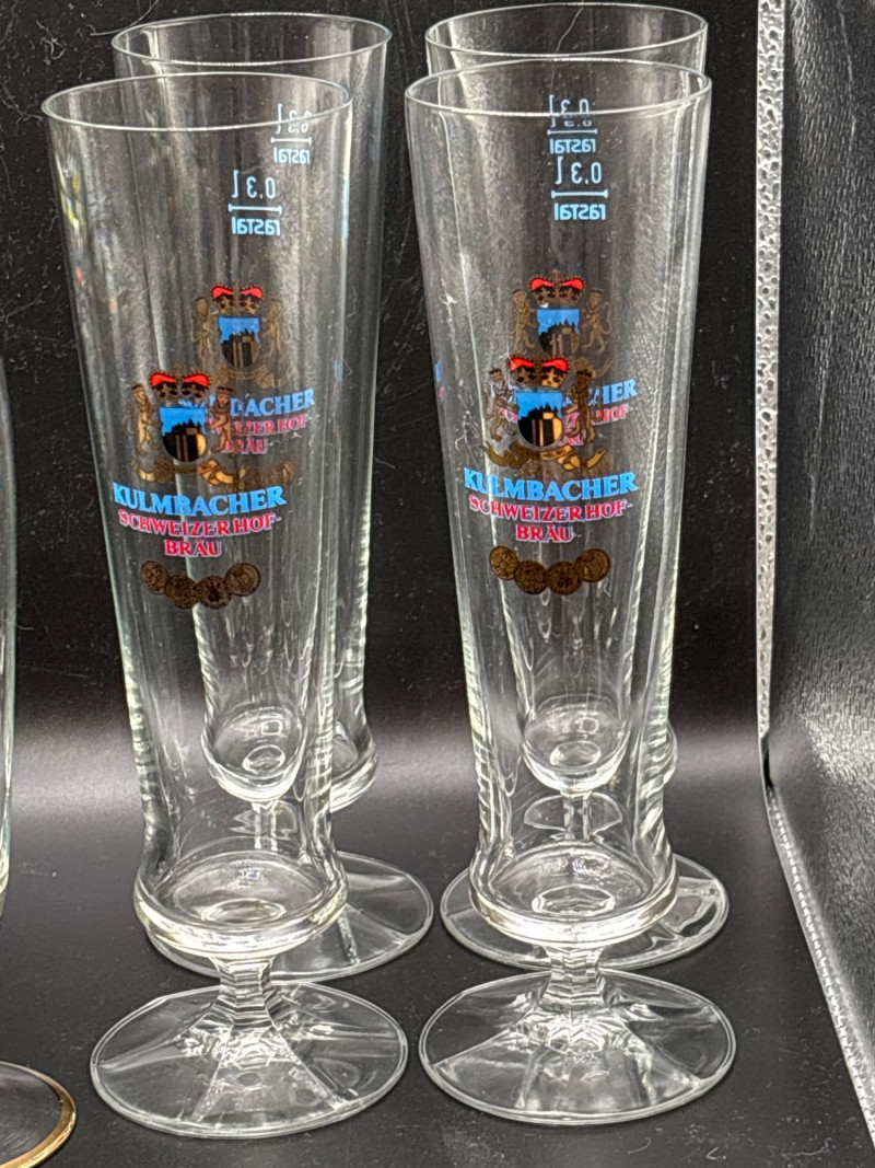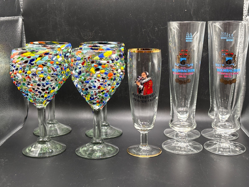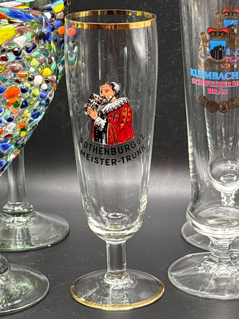 Elevate your barware collection with this diverse 7-piece set of vintage German glassware, blending mid-century art glass with classic European brewing tradition. This curated lot features a striking contrast between colorful, textured "Confetti" stemware and elegant, gilded brewery flutes. The set includes: 4 Murano-Style Confetti Goblets: These vibrant wine glasses feature a heavy "pebbled" texture with multi-colored glass inclusions fused onto a clear stem. The handcrafted nature of the confetti glass ensures that no two pieces are exactly alike. 4 Kulmbacher Schweizerhof Brau Pilsner Flutes: Traditional tall German pilsner glasses featuring the colorful armorial crest of the historic Kulmbacher brewery. 1 Rothenburg o.d.T. "Meistertrunk" Gilded Flute: A souvenir glass depicting the legendary "Master Draught" of Rothenburg ob der Tauber, finished with a delicate gold-rimmed edge. Whether you are looking for a pop of color for a summer table or authentic pieces for a German-inspired home bar, this set offers both artistic flair and historical charm. Condition: Excellent vintage condition. All seven pieces are free of chips, cracks, or clouding. The colorful enamels on the brewery glasses and the gold gilding on the Rothenburg glass remain bright and intact. ✔️ Shipping available