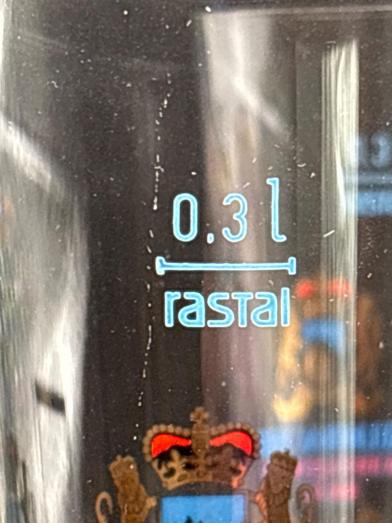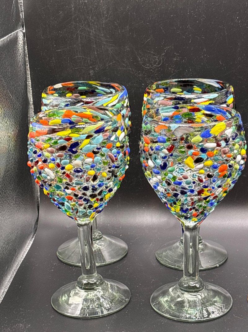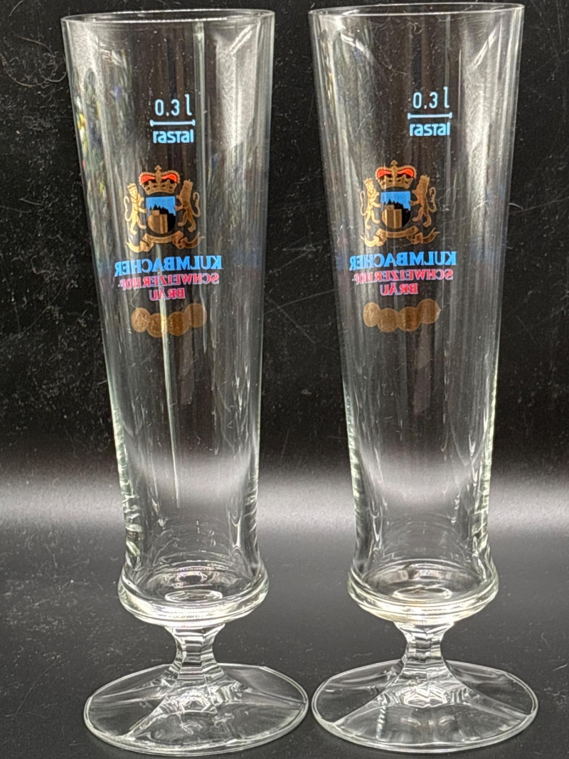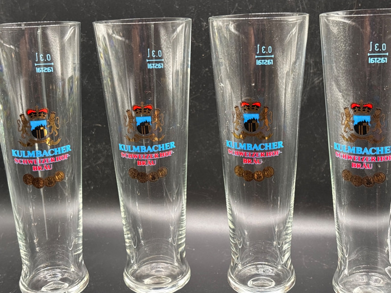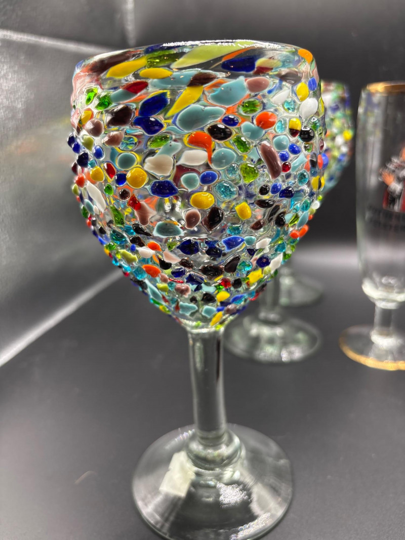 Elevate your barware collection with this diverse 7-piece set of vintage German glassware, blending mid-century art glass with classic European brewing tradition. This curated lot features a striking contrast between colorful, textured "Confetti" stemware and elegant, gilded brewery flutes. The set includes: 4 Murano-Style Confetti Goblets: These vibrant wine glasses feature a heavy "pebbled" texture with multi-colored glass inclusions fused onto a clear stem. The handcrafted nature of the confetti glass ensures that no two pieces are exactly alike. 4 Kulmbacher Schweizerhof Brau Pilsner Flutes: Traditional tall German pilsner glasses featuring the colorful armorial crest of the historic Kulmbacher brewery. 1 Rothenburg o.d.T. "Meistertrunk" Gilded Flute: A souvenir glass depicting the legendary "Master Draught" of Rothenburg ob der Tauber, finished with a delicate gold-rimmed edge. Whether you are looking for a pop of color for a summer table or authentic pieces for a German-inspired home bar, this set offers both artistic flair and historical charm. Condition: Excellent vintage condition. All seven pieces are free of chips, cracks, or clouding. The colorful enamels on the brewery glasses and the gold gilding on the Rothenburg glass remain bright and intact. ✔️ Shipping available