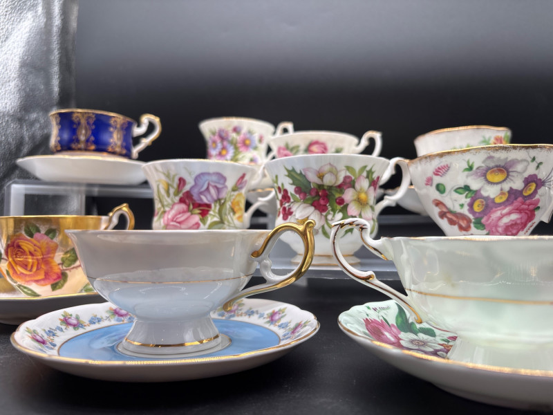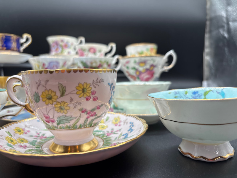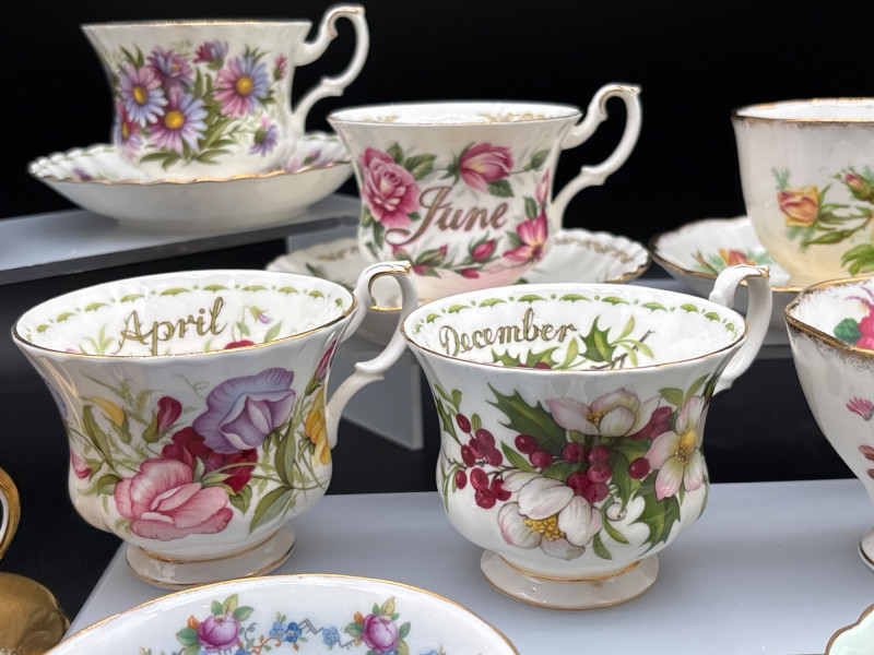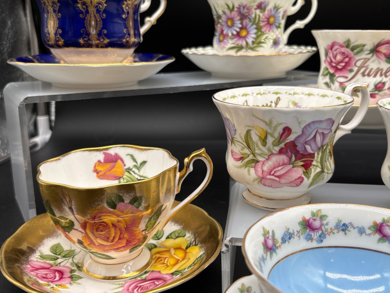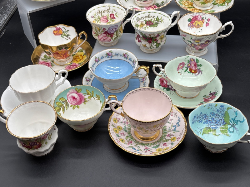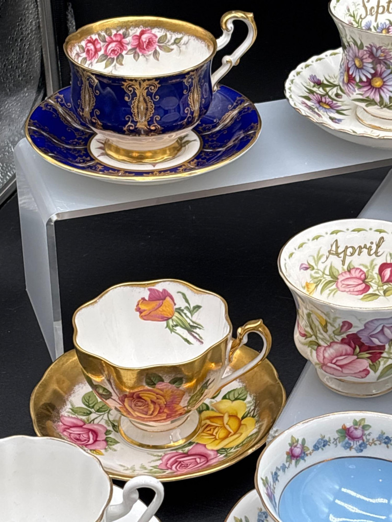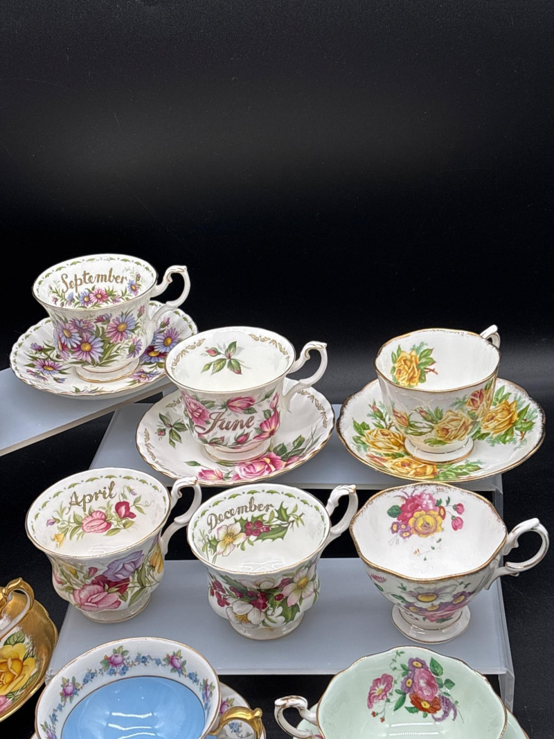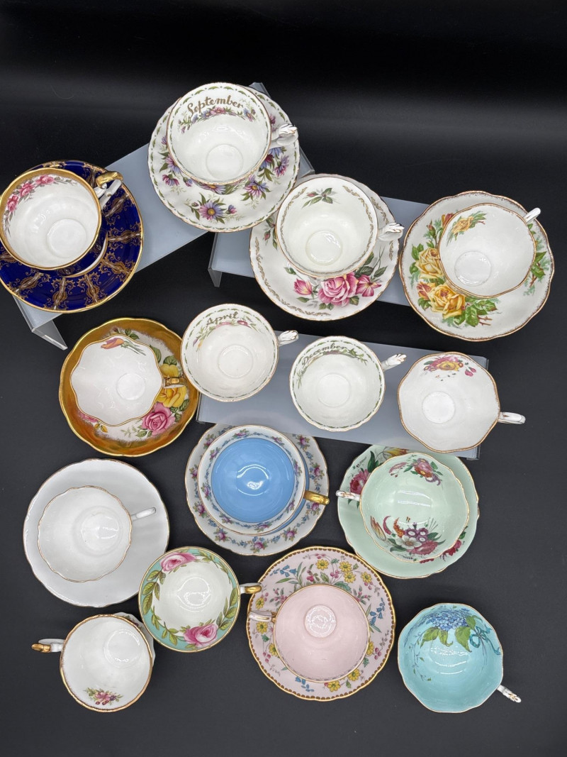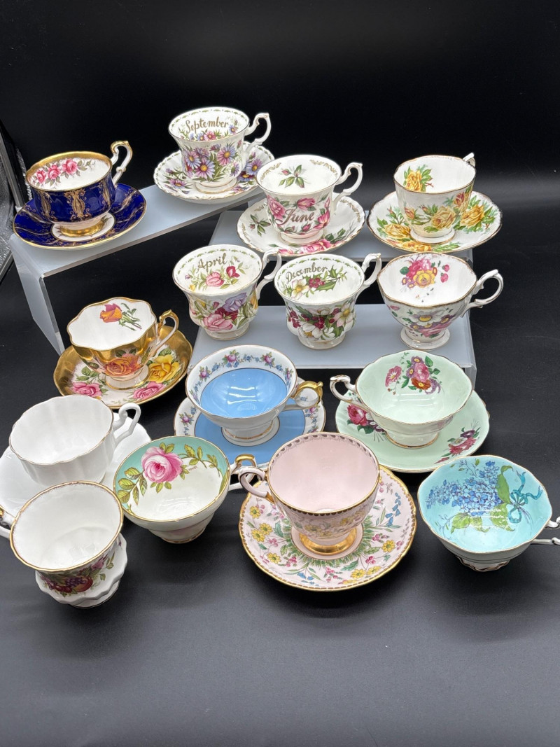 Elevate your tea service with this stunning 15-piece collection of fine English Bone China, featuring world-renowned makers Royal Albert and Paragon. This curated lot is a dream for "Month of the Year" collectors, showcasing several sought-after floral patterns that celebrate the changing seasons with delicate artistry and 22k gold-trimmed rims. The collection includes: Royal Albert "Flower of the Month" Series: Featuring "September" (Aster), "April" (Sweet Pea), "June" (Roses), and "December" (Christmas Rose). Royal Albert "Confetti" & "Rose" Patterns: Multiple cups and saucers featuring the iconic vibrant pink rose motifs and "Old Country Roses" style aesthetics. Paragon "Crowned" Commemorative Style: A standout cobalt blue and gold-filigree set, representing the pinnacle of British porcelain craftsmanship. Assorted Floral Accents: Including soft pastel "Forget-Me-Not" blue and delicate wildflower patterns. Each piece is crafted from translucent bone china and finished with hand-applied gold luster. These are perfect for a traditional afternoon tea, a bridal shower display, or for completing a "Month" series collection. Condition: Excellent vintage condition. Most pieces appear to have been cabinet-displayed only. The gold gilding is bright and intact across the collection. No chips, cracks, or crazing noted upon inspection. Standard Cup: ~3" Height | ~3.5" Diameter Standard Saucer: ~5.5" Diameter