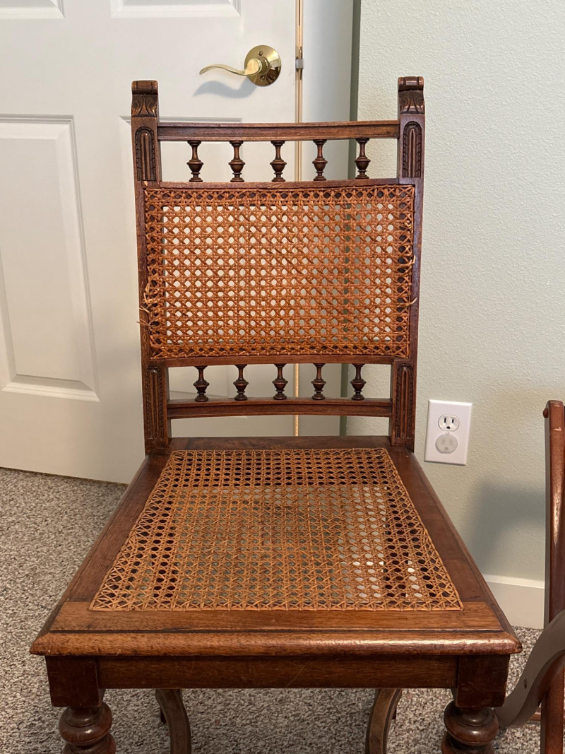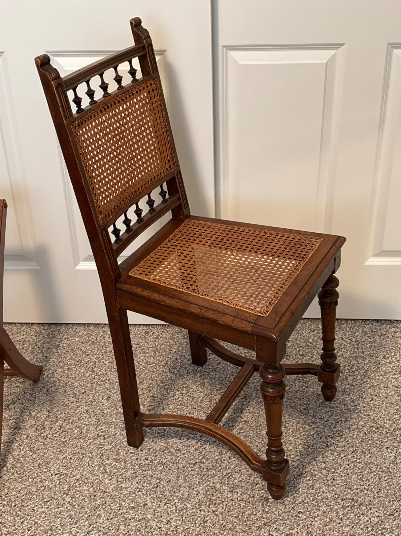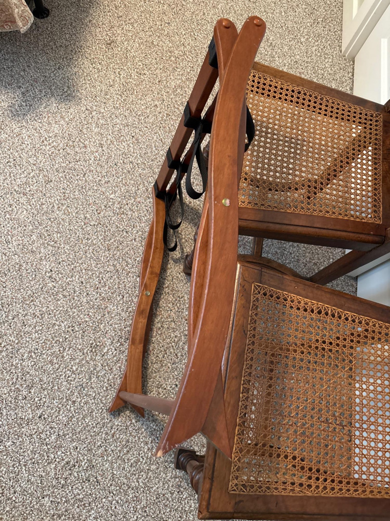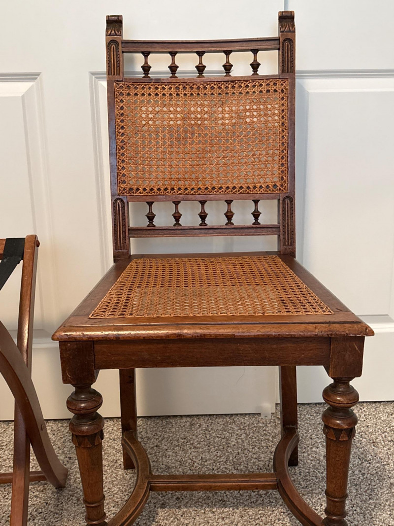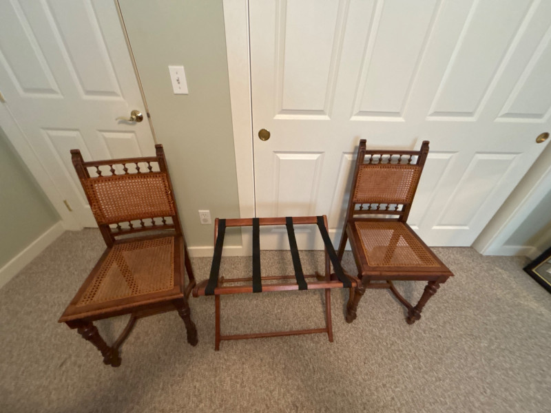 Bring a touch of classic European elegance to your entryway or guest suite with this coordinated 3-piece furniture set. Featuring a pair of high-back accent chairs and a matching folding luggage rack, this set blends historical "Spanish Revival" aesthetics with practical utility. The set includes: Pair of Carved Wood Accent Chairs: These chairs feature impressive turned-bobbin front legs and decorative finials. The backs and seats are finished with traditional woven cane/rattan. Dimensions: 18" W | 16" D | 38" H. Folding Wooden Luggage Rack: A sturdy, dark-wood frame with heavy-duty black nylon straps. Perfect for guest rooms. Dimensions (Open): 24" W | 15" D | 20" H. Condition: Good vintage condition. The dark wood frames are very sturdy. Note: One chair shows a small area of localized fraying to the rattan weave on the seat (see detail photos). This does not affect the structural integrity and can be easily covered with a cushion or repaired. LOCAL PICKUP ONLY. Due to the size and delicate nature of the woven cane, these items are not eligible for shipping. Please bring adequate packing materials to protect the rattan during transport.Special Instruction