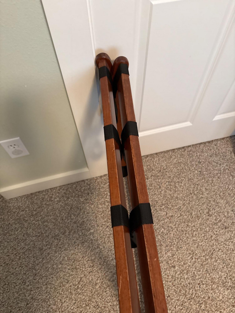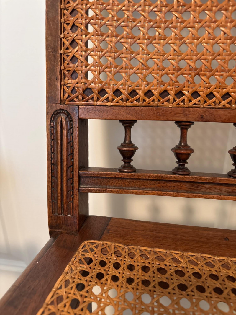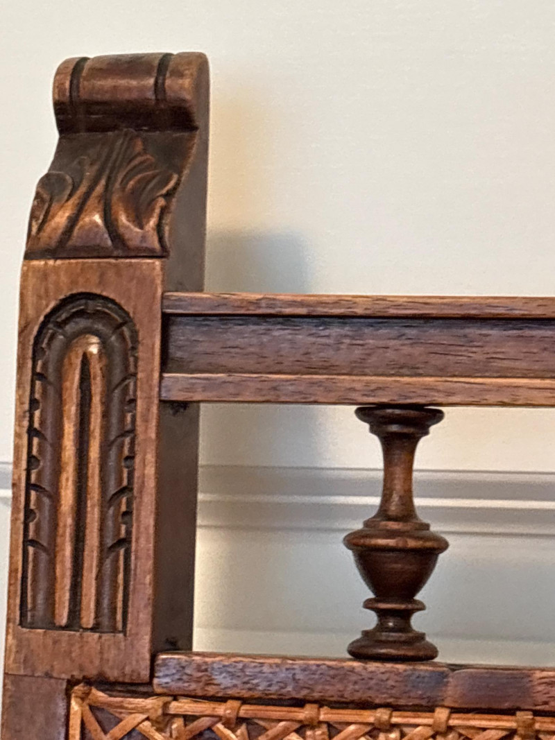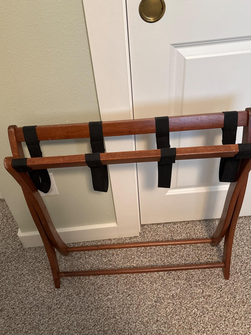 Bring a touch of classic European elegance to your entryway or guest suite with this coordinated 3-piece furniture set. Featuring a pair of high-back accent chairs and a matching folding luggage rack, this set blends historical "Spanish Revival" aesthetics with practical utility. The set includes: Pair of Carved Wood Accent Chairs: These chairs feature impressive turned-bobbin front legs and decorative finials. The backs and seats are finished with traditional woven cane/rattan. Dimensions: 18" W | 16" D | 38" H. Folding Wooden Luggage Rack: A sturdy, dark-wood frame with heavy-duty black nylon straps. Perfect for guest rooms. Dimensions (Open): 24" W | 15" D | 20" H. Condition: Good vintage condition. The dark wood frames are very sturdy. Note: One chair shows a small area of localized fraying to the rattan weave on the seat (see detail photos). This does not affect the structural integrity and can be easily covered with a cushion or repaired. LOCAL PICKUP ONLY. Due to the size and delicate nature of the woven cane, these items are not eligible for shipping. Please bring adequate packing materials to protect the rattan during transport.Special Instruction