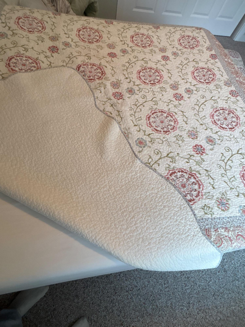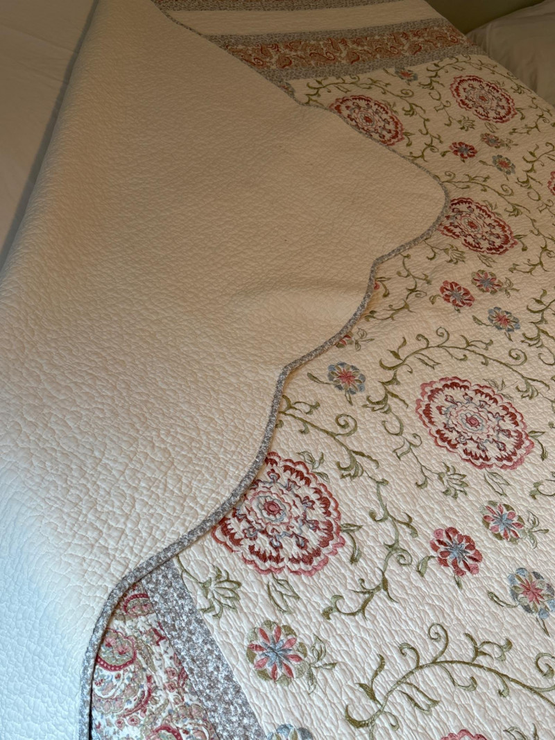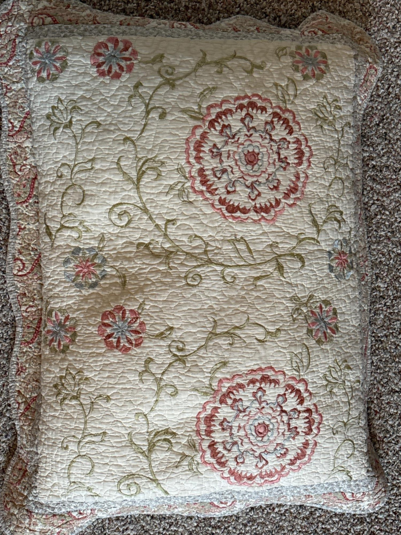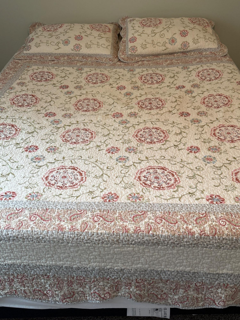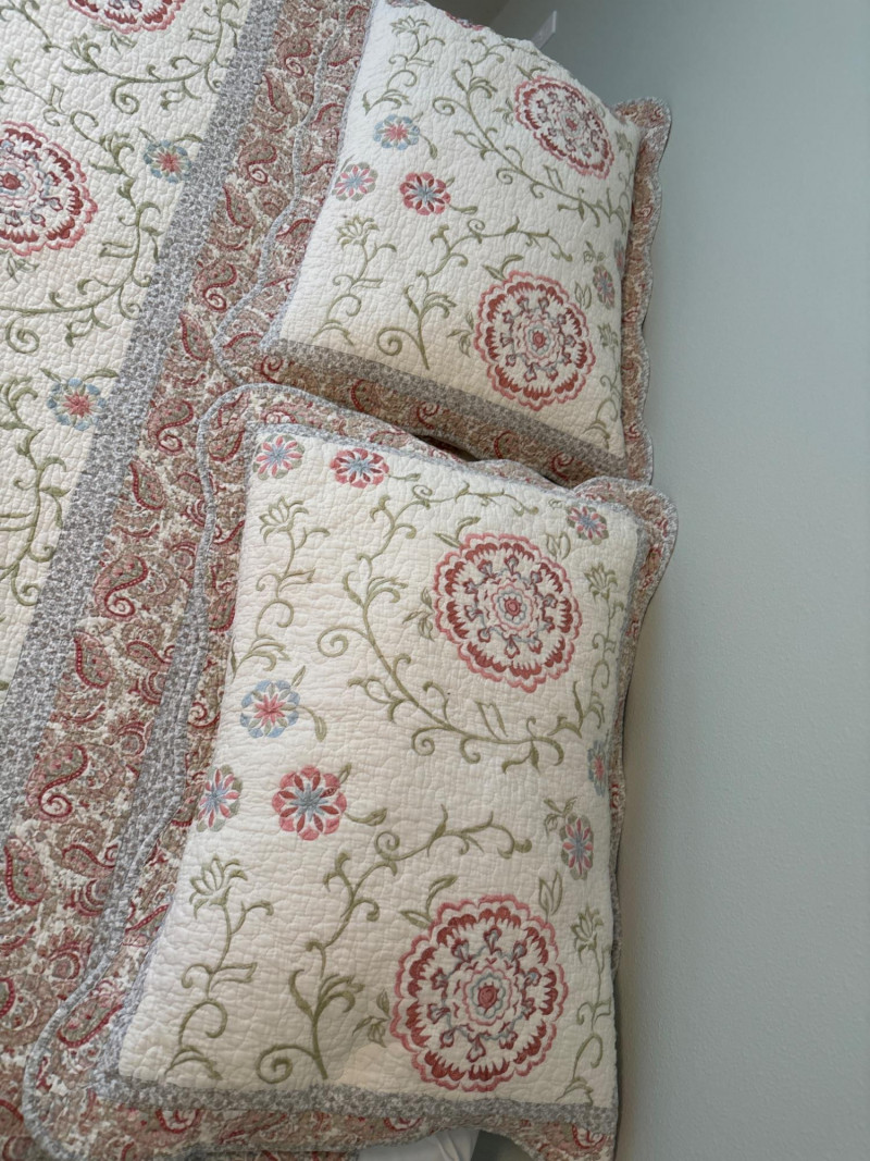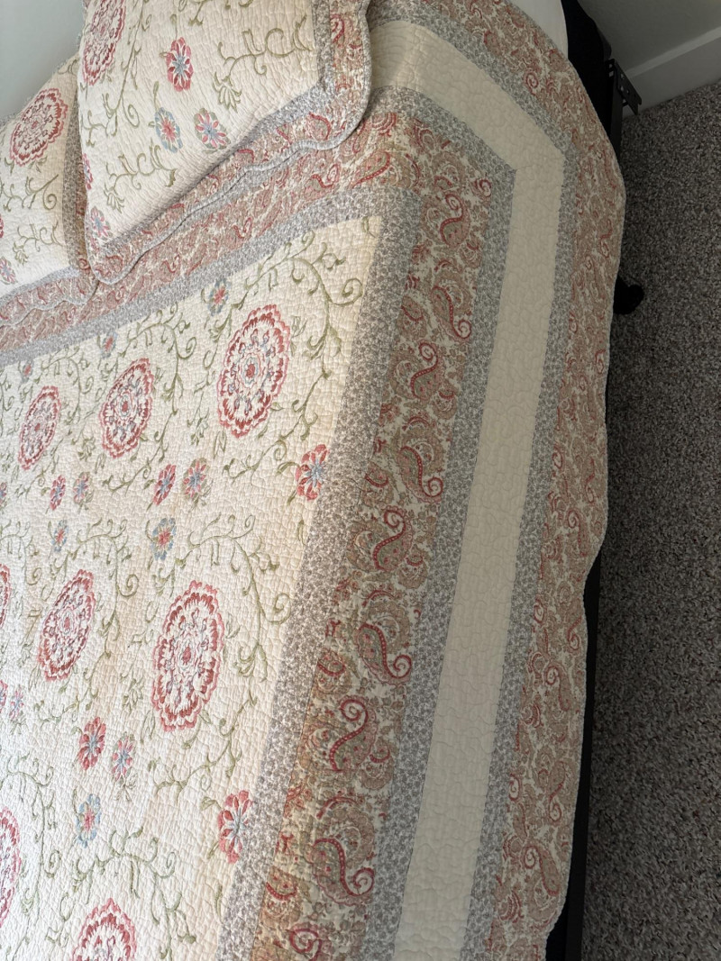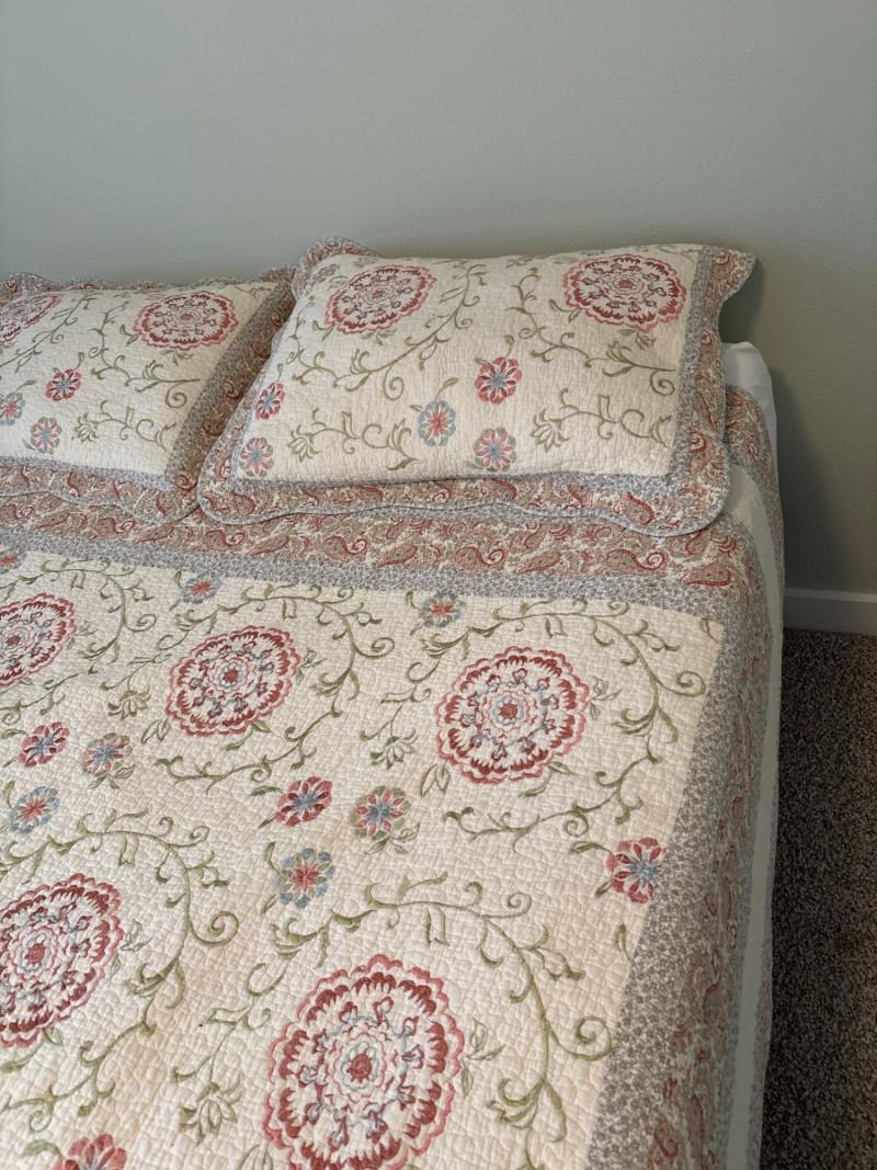 Refresh your bedroom with the warm, eclectic charm of this 3-piece quilted bedding set. Featuring a sophisticated Bohemian-inspired design, this set combines intricate floral medallions with classic paisley borders in a versatile palette of terracotta, dusty rose, and sage green. The set includes: One Queen Size Quilt: Features a soft, "pre-washed" textured feel with traditional vermicelli stitching that provides a classic crinkled look and prevents the fill from shifting. Two Matching Pillow Shams: Designed with a wide decorative flange and an envelope closure on the back to keep pillows secure. The quilt is lightweight yet cozy, making it an ideal choice for year-round use or as a decorative layering piece at the foot of the bed. Condition: Excellent pre-owned condition. The colors remain vibrant with no noticeable fading. No stains, tears, or fraying were found during inspection. Clean and ready for use. ✔️ Shipping available