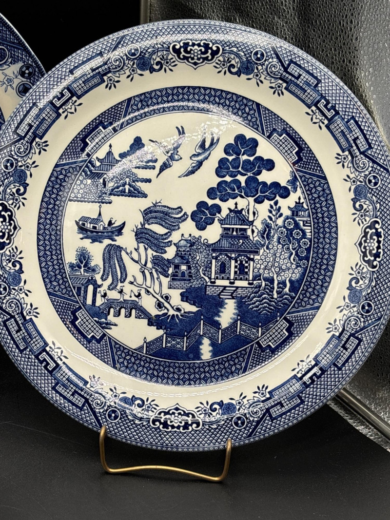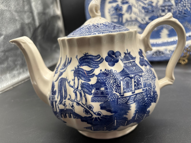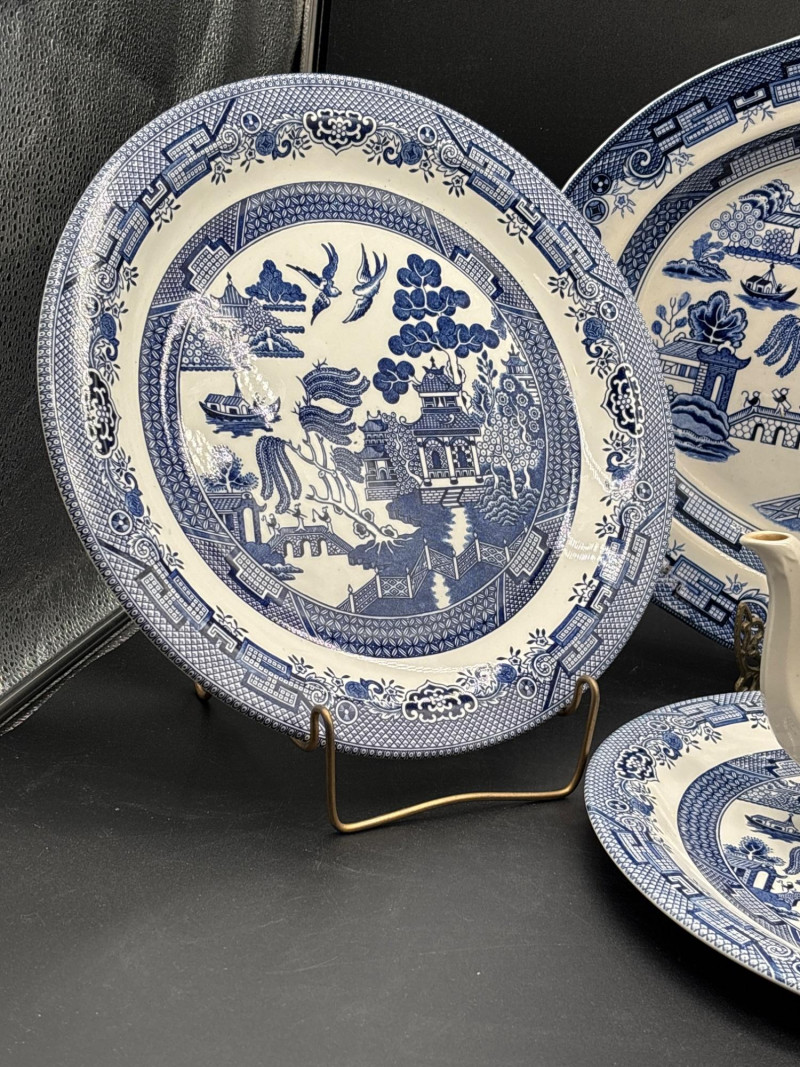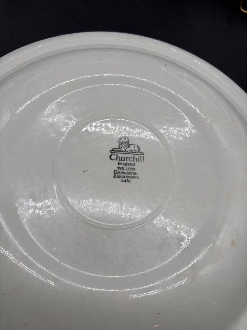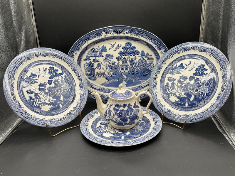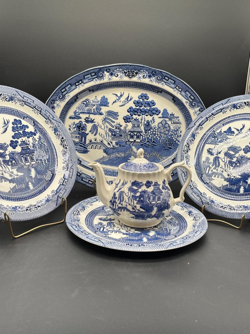 Capture the essence of traditional English tea service with this beautiful 6-piece "Blue Willow" collection by Churchill. Made in Staffordshire, England, these pieces feature the iconic cobalt blue transferwa The set includes 1 Large Oval Serving Pla 3 Large Plates: A matching trio of oversized plates. Dimensions: 12" Diameter. 1 Teapot with Lid: Featuring the classic scalloped rim and elegant handle. Dimensions: 7" Tall | 7" Wide. Condition: Excellent vintage condition. The glaze is bright and lustrous across all pieces with no noticeable crazing. No chips, cracks, or repairs were found. The Churchill England backstamps are clear on the underside. Please note: Shipping is charged separately from the auction. once auction invoice paid, A second invoice for exact shipping costs will be sent to the winner.Shipping