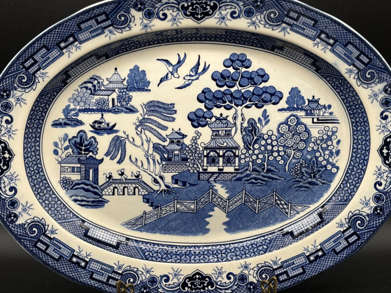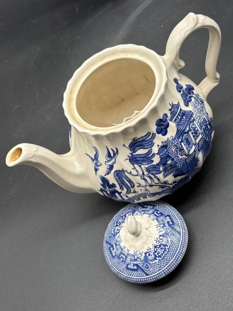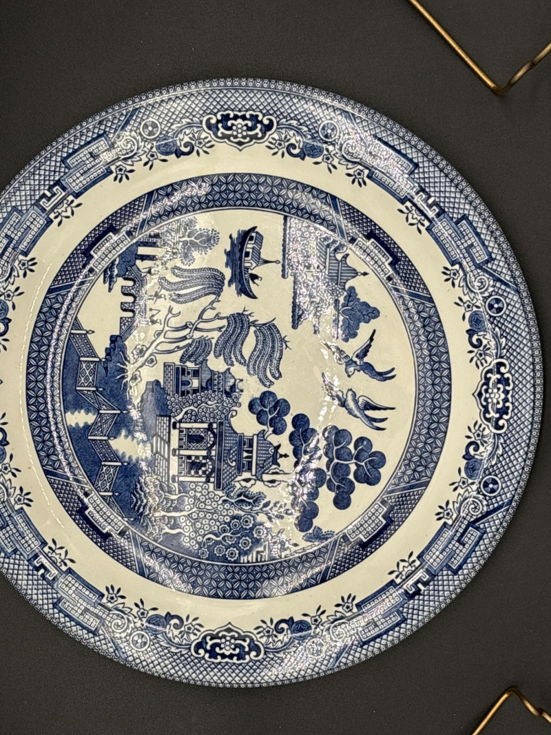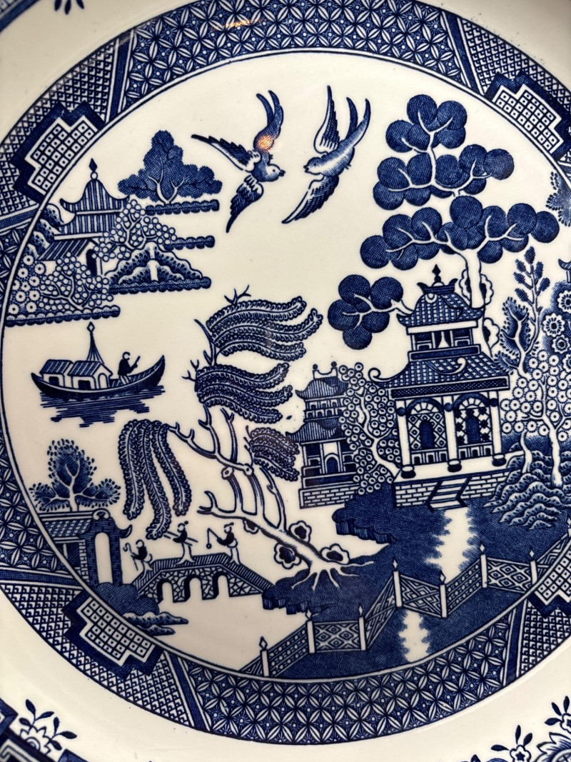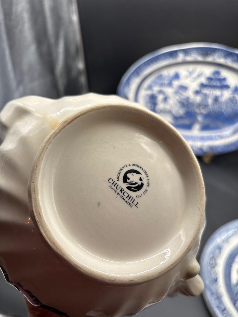 Capture the essence of traditional English tea service with this beautiful 6-piece "Blue Willow" collection by Churchill. Made in Staffordshire, England, these pieces feature the iconic cobalt blue transferwa The set includes 1 Large Oval Serving Pla 3 Large Plates: A matching trio of oversized plates. Dimensions: 12" Diameter. 1 Teapot with Lid: Featuring the classic scalloped rim and elegant handle. Dimensions: 7" Tall | 7" Wide. Condition: Excellent vintage condition. The glaze is bright and lustrous across all pieces with no noticeable crazing. No chips, cracks, or repairs were found. The Churchill England backstamps are clear on the underside. Please note: Shipping is charged separately from the auction. once auction invoice paid, A second invoice for exact shipping costs will be sent to the winner.Shipping