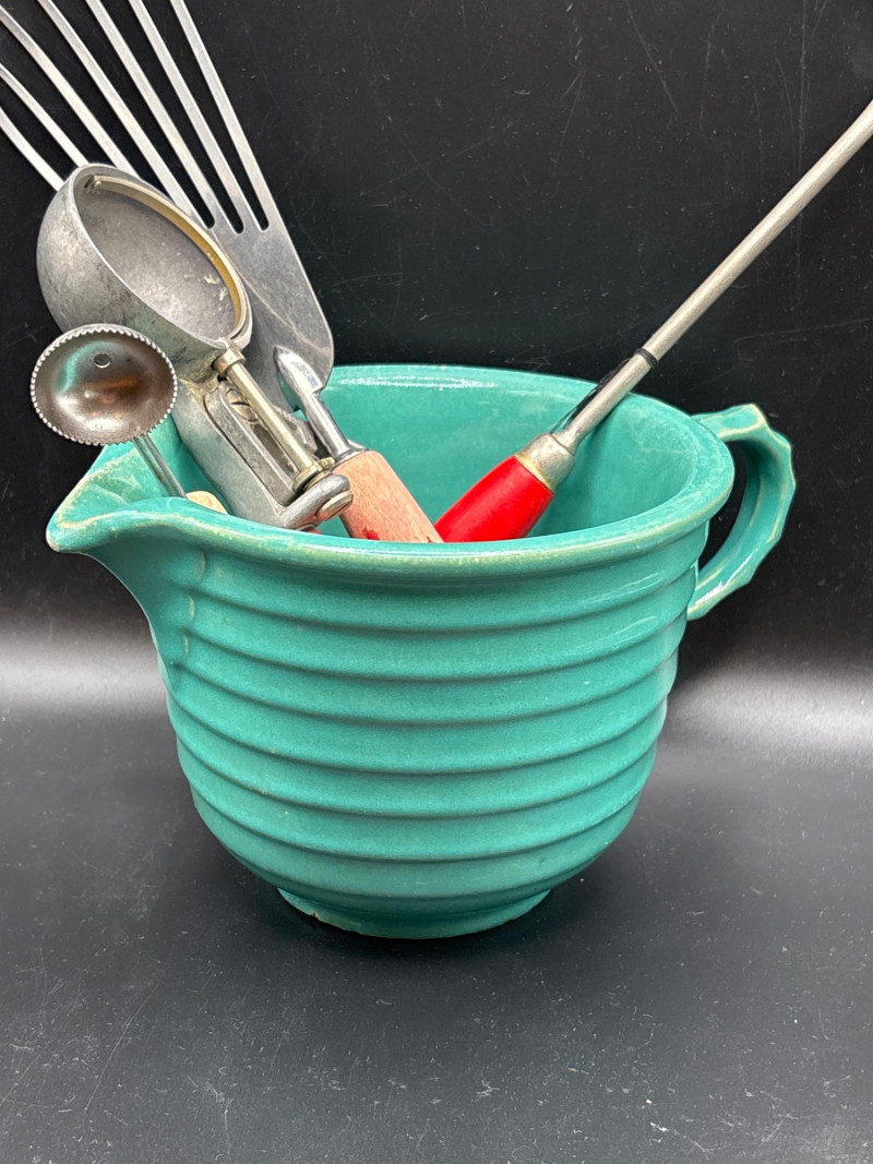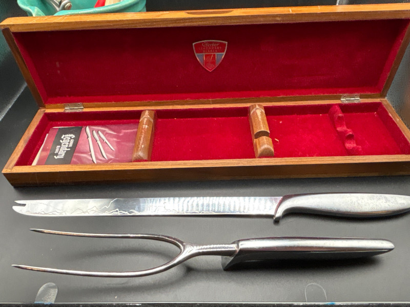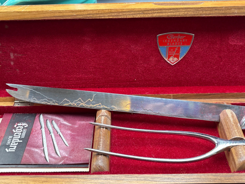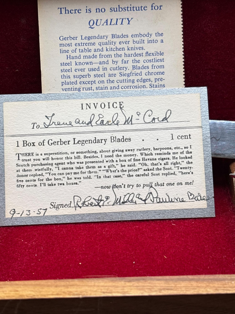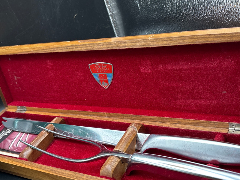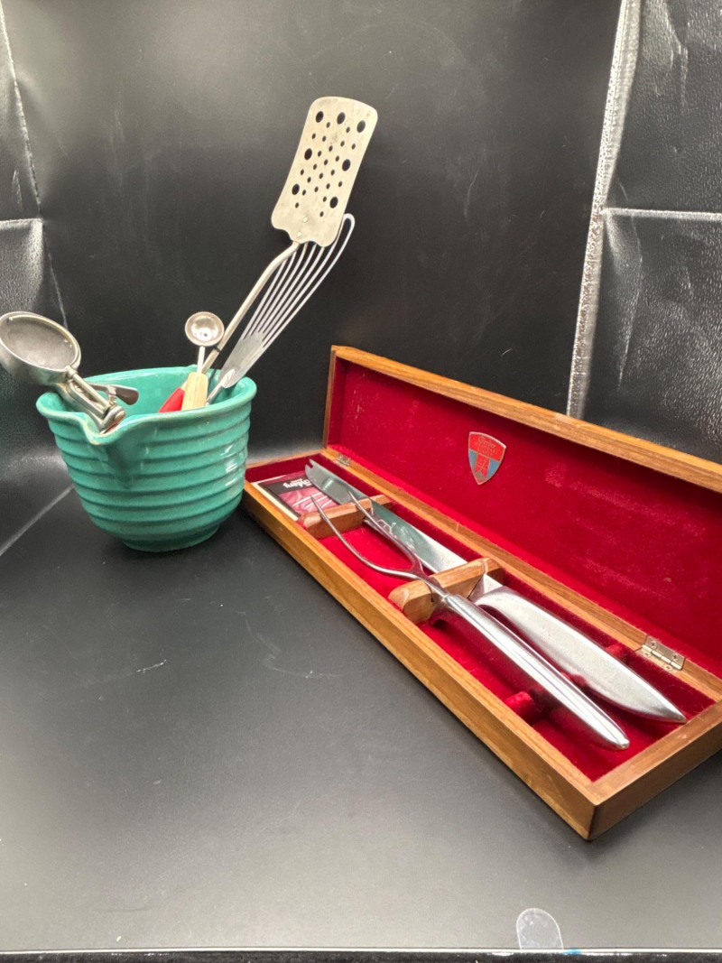 Own a piece of mid-century American craftsmanship with this vintage Gerber "Legendary Blades" service set. These knives were famously hand-made from high-carbon tool steel, known for holding an edge far better than standard stainless steel. The lot includes: Gerber Legendary Blades Set: Features the "Siegfried" chrome-plated serving fork and carving knife. Presented in the original Solid Walnut Case with a red felt-lined interior. Original Documentation: Includes a wonderful vintage invoice/letter dated September 13, 1957, adding significant provenance and collector appeal. Hall Pottery Kitchen Set: A 5-piece grouping of mid-century "Radiant" green Hall China, including: 1 Small nested mixing bowl/crock. 1 Individual creamer/pitcher. 3 Kitchen utensils (slotted turner, whisk, and scoop) housed in the crock. Condition: The Gerber blades are in excellent vintage condition with minimal signs of use; the walnut case shows light surface character marks. The Hall Pottery pieces are bright and free of chips or cracks. Utensils show standard vintage wear. SHIPPABLE: Yes. Please note: Shipping is charged separately from the auction. once auction invoice is paid, if you chose shipping, a second invoice for the exact shipping will be sent to the winner.Shipping