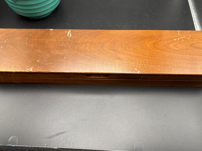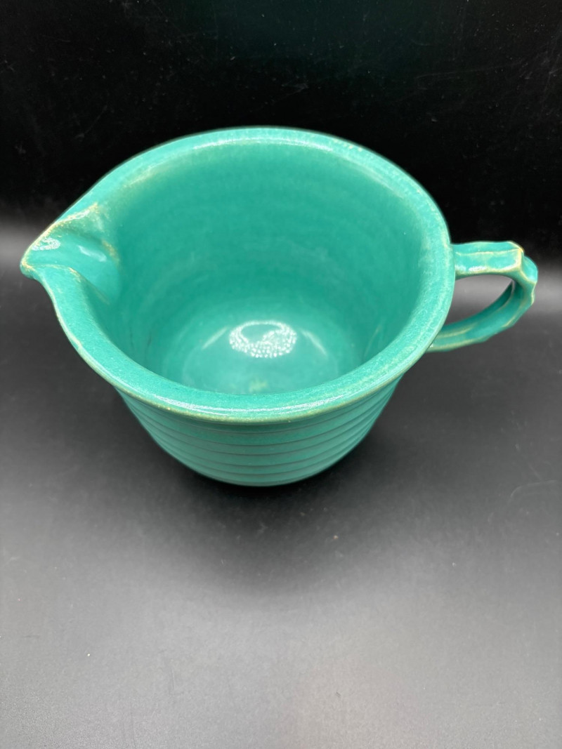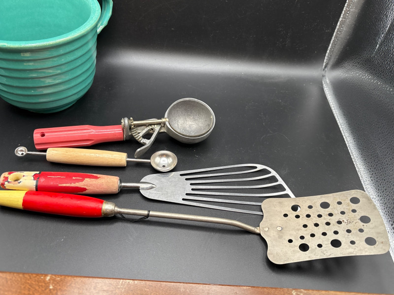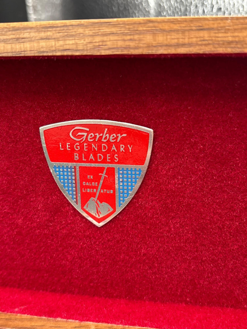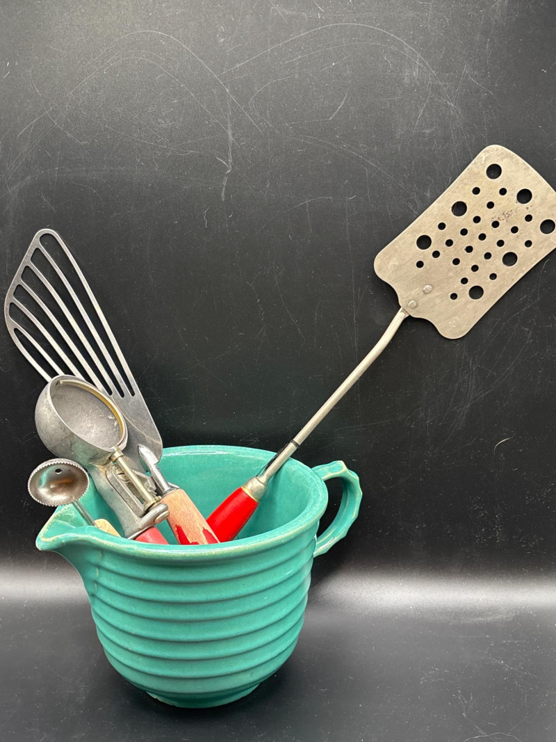 Own a piece of mid-century American craftsmanship with this vintage Gerber "Legendary Blades" service set. These knives were famously hand-made from high-carbon tool steel, known for holding an edge far better than standard stainless steel. The lot includes: Gerber Legendary Blades Set: Features the "Siegfried" chrome-plated serving fork and carving knife. Presented in the original Solid Walnut Case with a red felt-lined interior. Original Documentation: Includes a wonderful vintage invoice/letter dated September 13, 1957, adding significant provenance and collector appeal. Hall Pottery Kitchen Set: A 5-piece grouping of mid-century "Radiant" green Hall China, including: 1 Small nested mixing bowl/crock. 1 Individual creamer/pitcher. 3 Kitchen utensils (slotted turner, whisk, and scoop) housed in the crock. Condition: The Gerber blades are in excellent vintage condition with minimal signs of use; the walnut case shows light surface character marks. The Hall Pottery pieces are bright and free of chips or cracks. Utensils show standard vintage wear. SHIPPABLE: Yes. Please note: Shipping is charged separately from the auction. once auction invoice is paid, if you chose shipping, a second invoice for the exact shipping will be sent to the winner.Shipping
