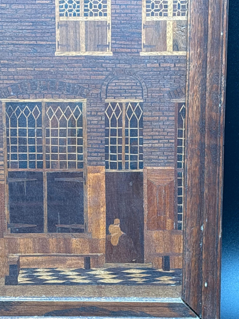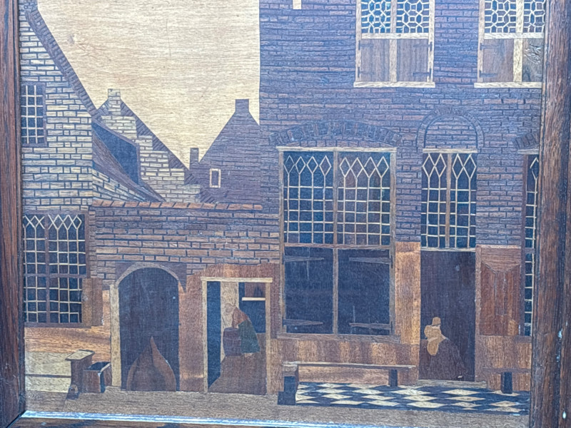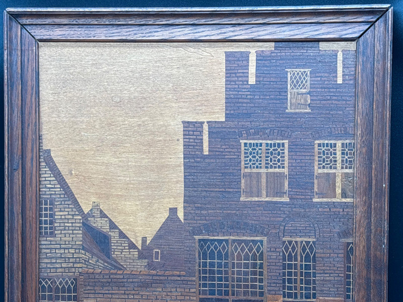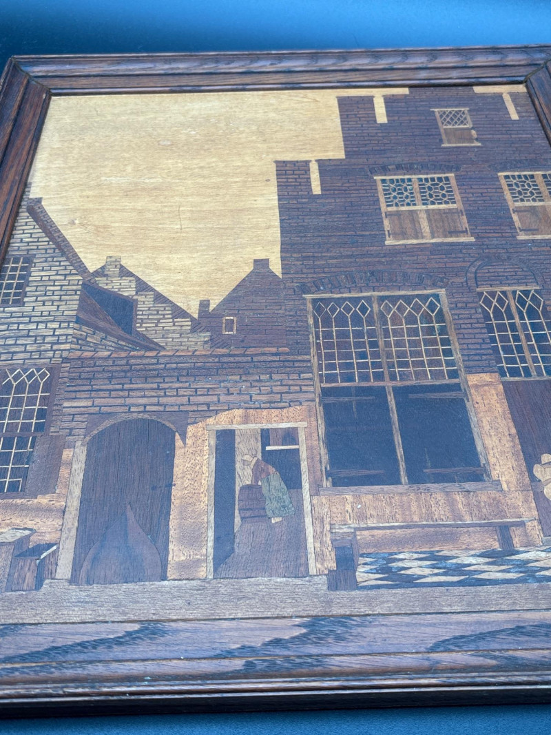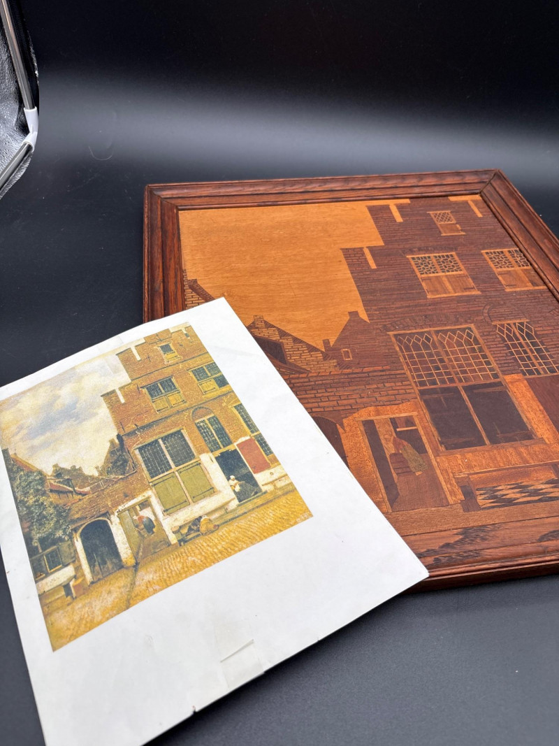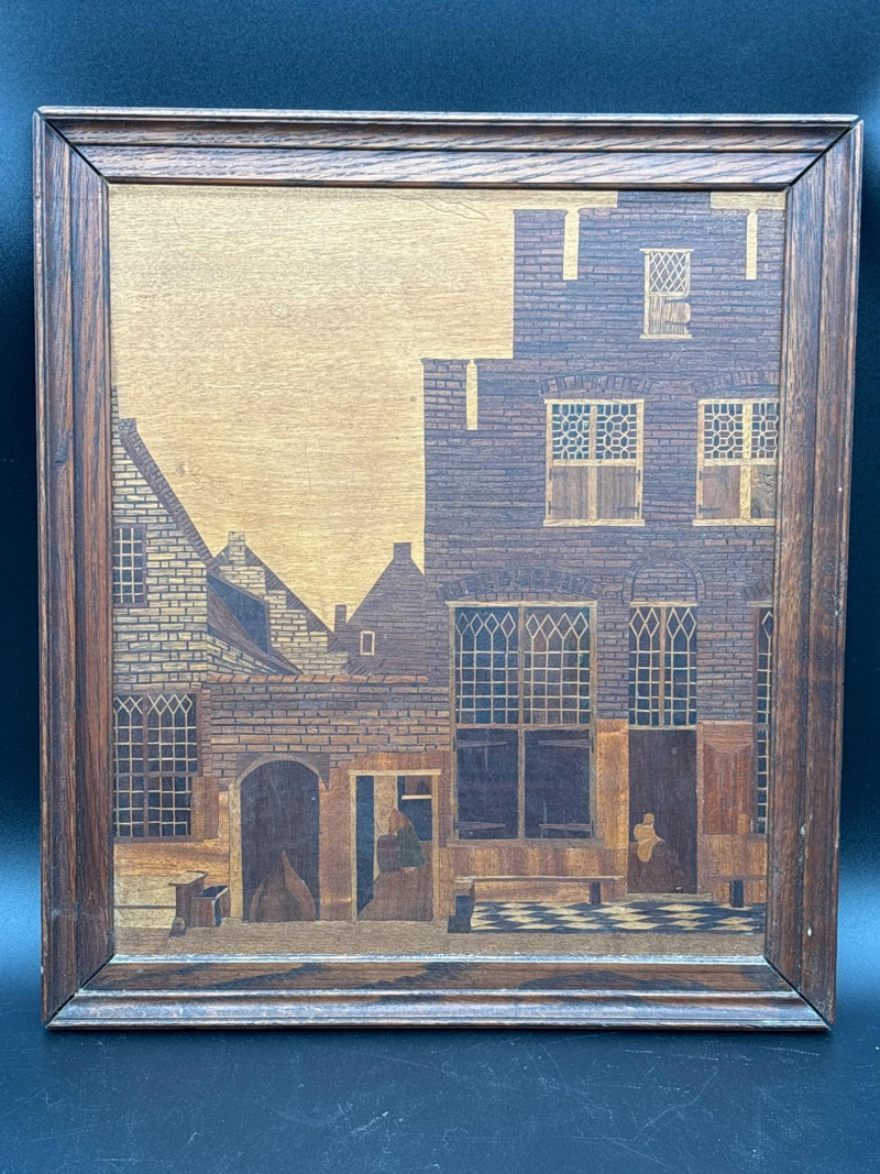 A stunning example of marquetry or wood inlay art. This piece recreates Johannes Vermeer’s 1657-58 masterpiece, The Little Street, using various tones and grains of natural wood to create depth, texture, and architectural detail. The lot includes: Inlaid Wood Panel: A detailed depiction of the quiet street in Delft, showing the intricate brickwork, arched doorways, and the woman working in the alley. Informational Insert: Comes with a descriptive page from a "Migration Heritage Centre" or similar educational source, detailing the history of the original painting (Vermeer's tavern, the Mechelen, etc.). Framing: Housed in a simple, dark wood frame that complements the natural tones of the inlay. Condition: Excellent vintage condition. The wood inlay is tight with no lifting or cracking. The frame shows minor surface wear consistent with age. SHIPPABLE: Yes