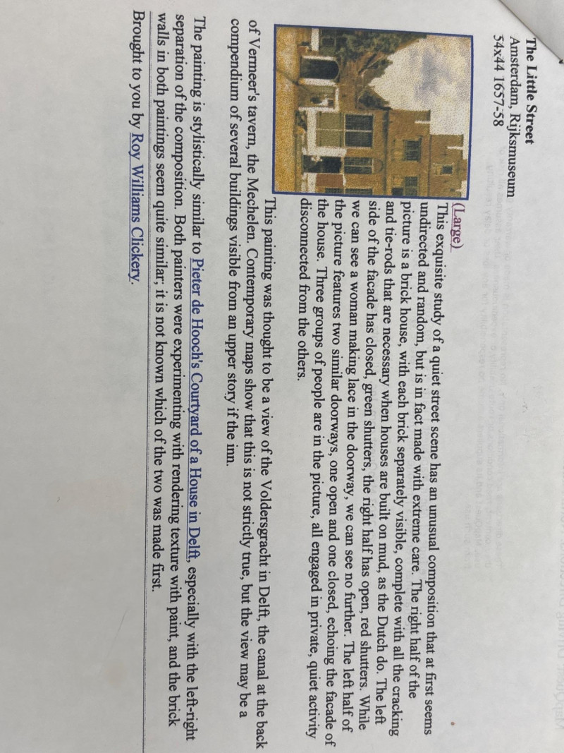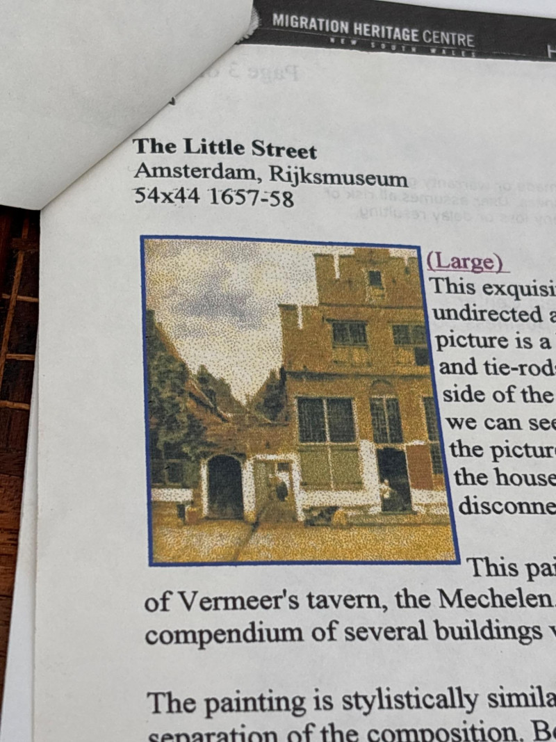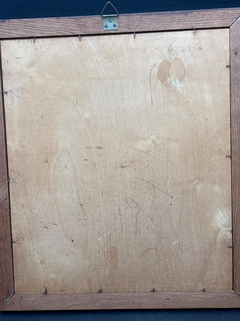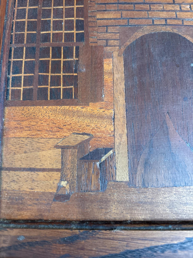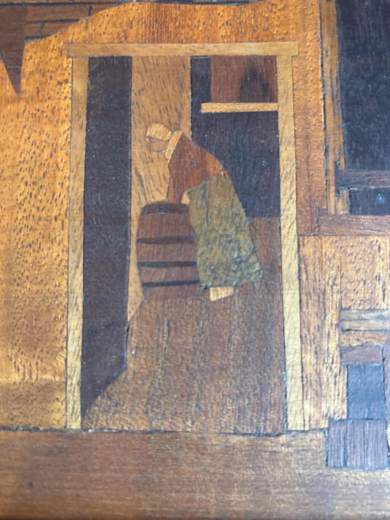 A stunning example of marquetry or wood inlay art. This piece recreates Johannes Vermeer’s 1657-58 masterpiece, The Little Street, using various tones and grains of natural wood to create depth, texture, and architectural detail. The lot includes: Inlaid Wood Panel: A detailed depiction of the quiet street in Delft, showing the intricate brickwork, arched doorways, and the woman working in the alley. Informational Insert: Comes with a descriptive page from a "Migration Heritage Centre" or similar educational source, detailing the history of the original painting (Vermeer's tavern, the Mechelen, etc.). Framing: Housed in a simple, dark wood frame that complements the natural tones of the inlay. Condition: Excellent vintage condition. The wood inlay is tight with no lifting or cracking. The frame shows minor surface wear consistent with age. SHIPPABLE: Yes