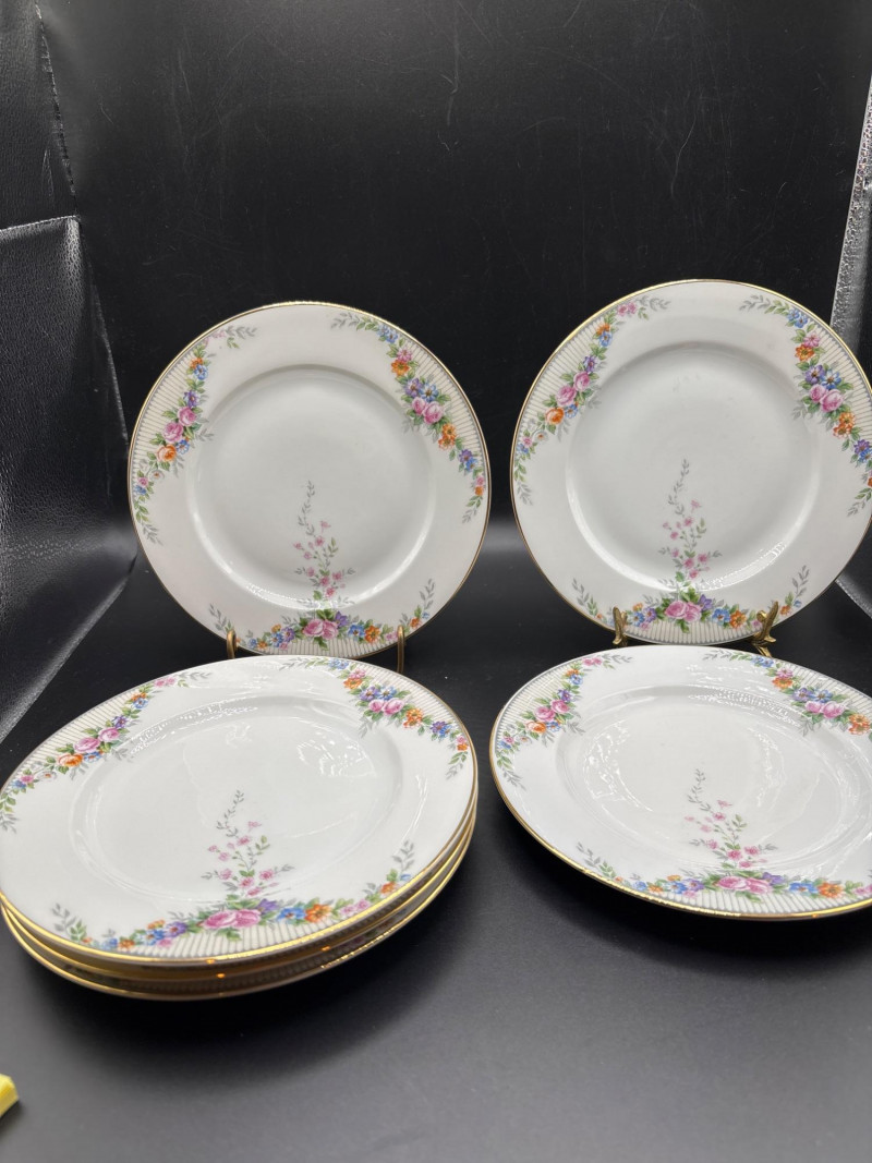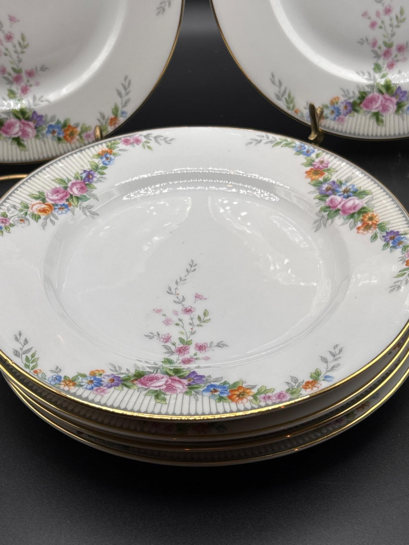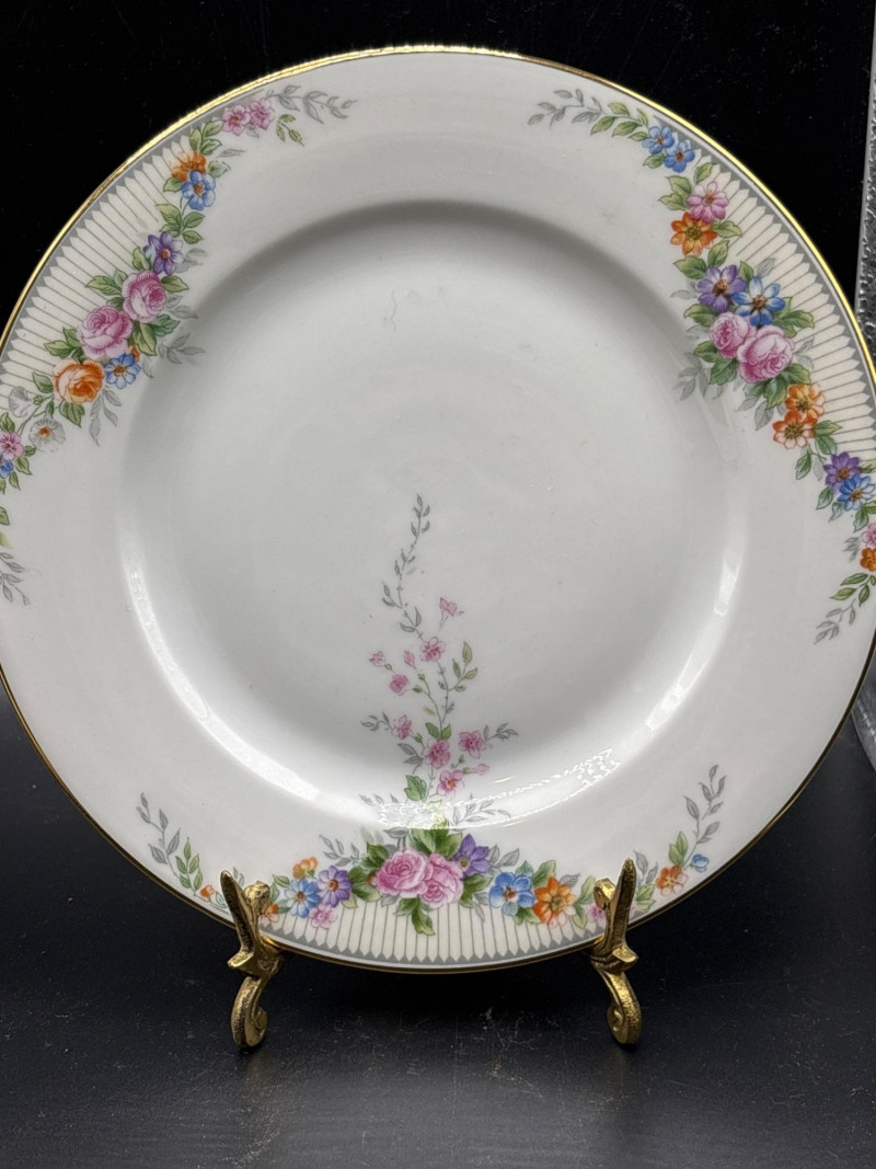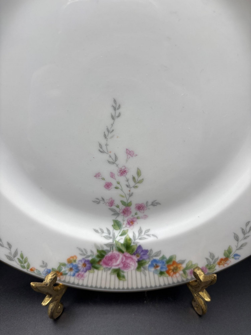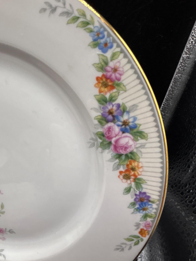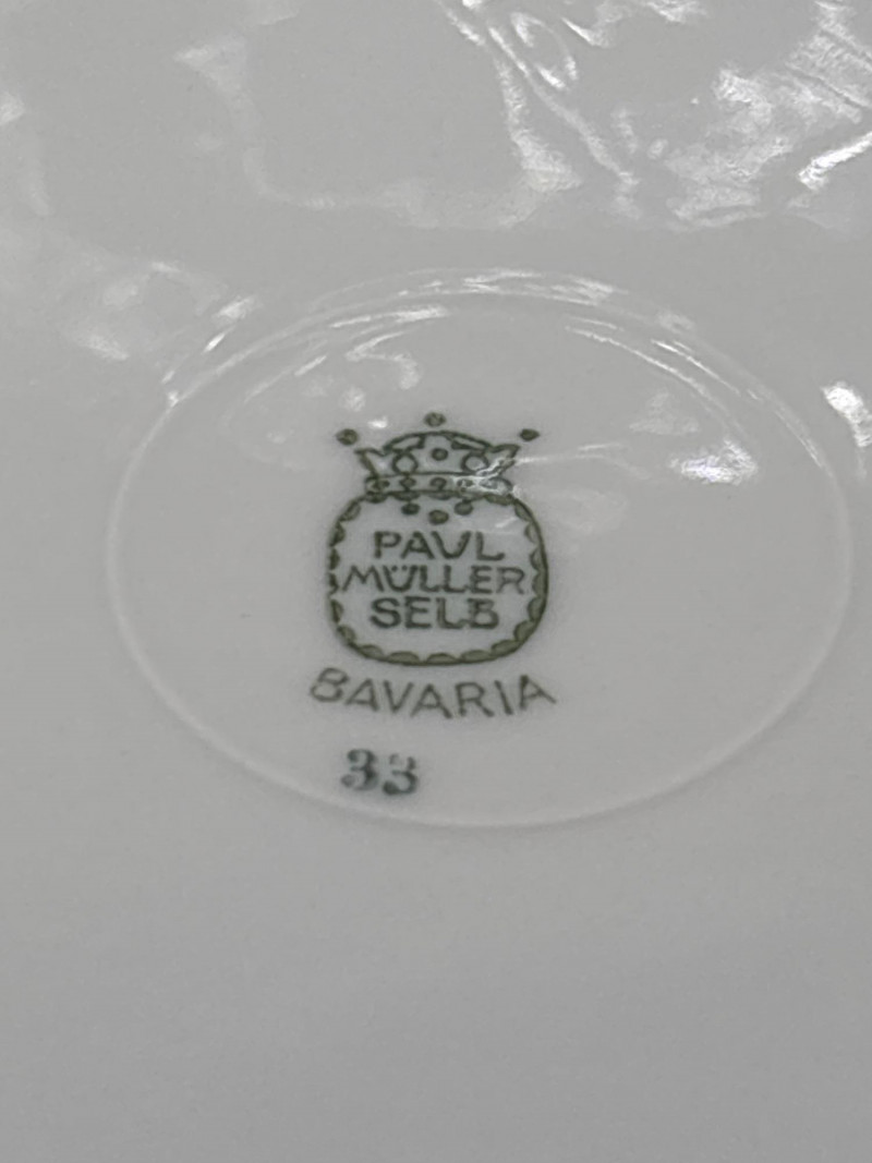 A beautiful matching set of 6 vintage porcelain dessert plates from the renowned Paul Muller Selb factory in Bavaria, Germany. This set features a crisp white porcelain body adorned with colorful floral sprays of roses, pansies, and forget-me-nots, finished with a sophisticated gold pinstripe and scalloped edge. The set includes: 6 Matching Dessert Plates: Featuring a multi-colored floral border and a central floral sprig. Dimensions: 7.5" Diameter. Markings: Each plate is clearly stamped on the underside with the "Paul Muller Selb, Bavaria" hallmark and the number "33". Condition: Excellent vintage condition. The floral transfers are bright and intact. No chips, cracks, or crazing noted. The gold-tone rims show very minimal wear, consistent with careful cabinet storage. SHIPPABLE: Yes