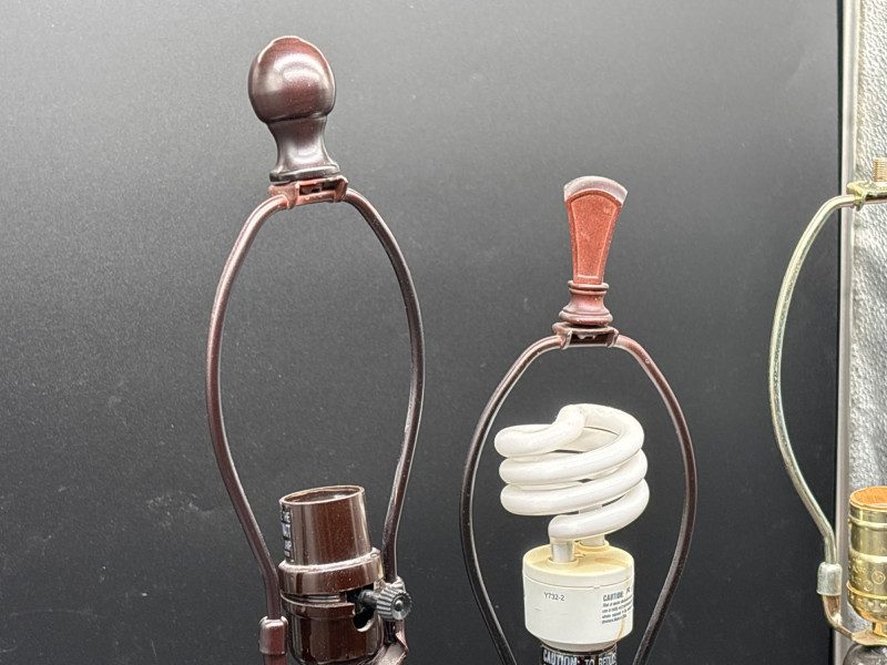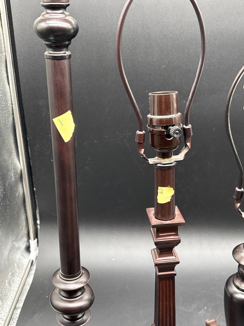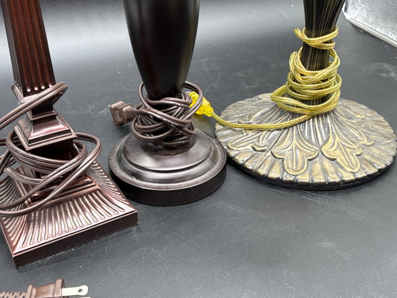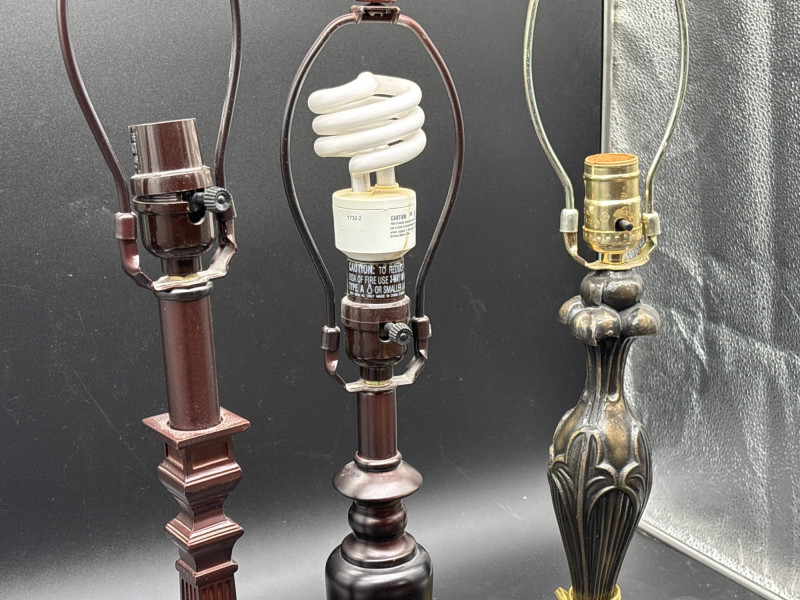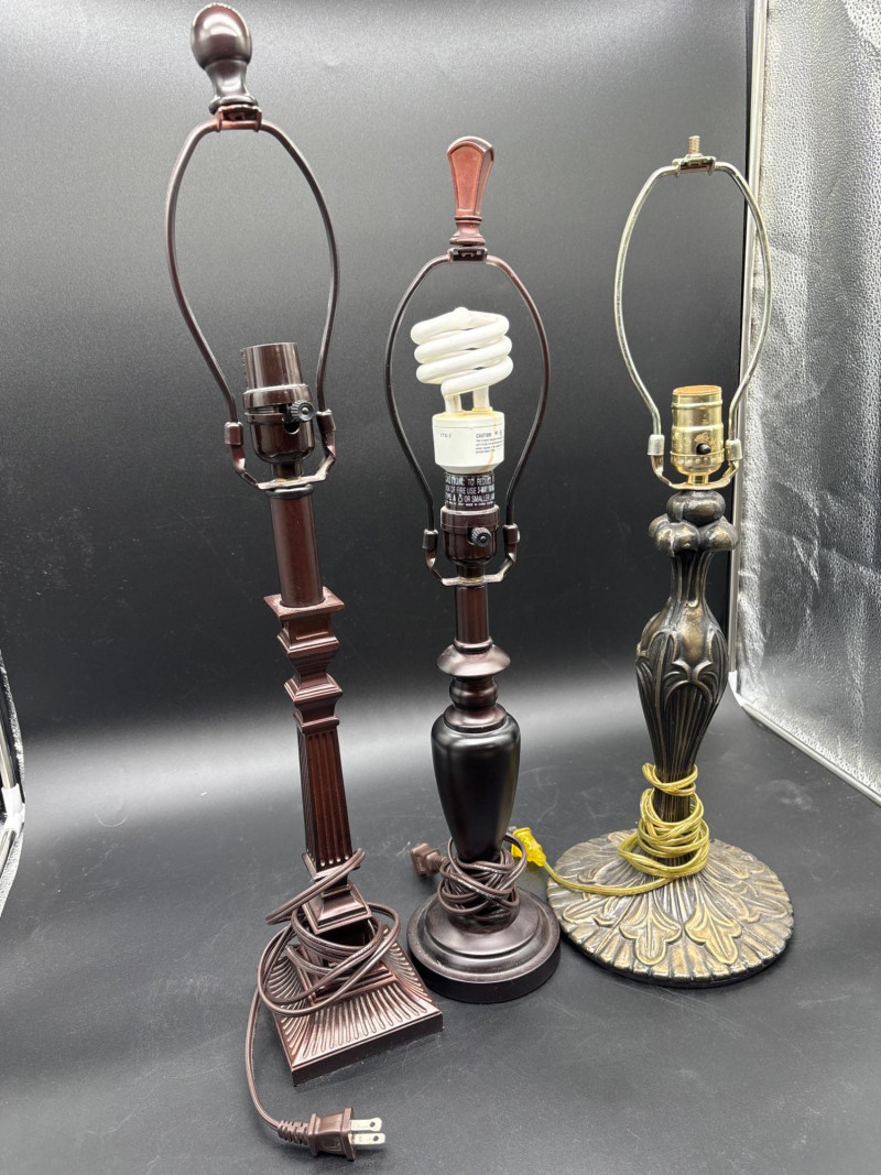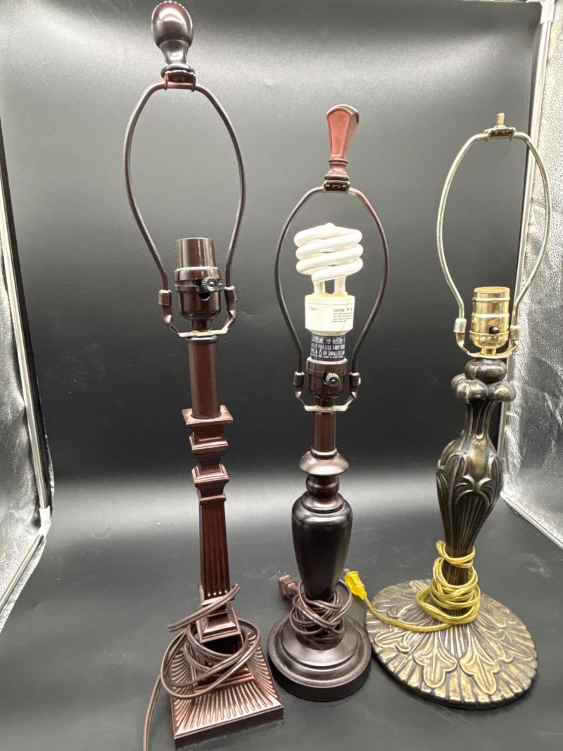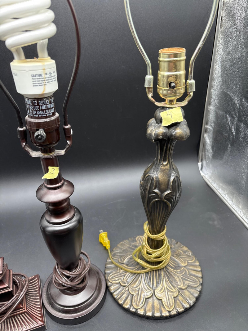 A versatile 4-piece lot of vintage metal lamps in various heights and finishes. Whether you are looking for a DIY restoration project or high-quality metal bases to pair with custom shades, this collection offers several classic silhouettes. The collection includes: Extra Tall Black Column Lamp: A sleek, modern-meets-traditional matte black pillar lamp. Height: 33". Bronze-Tone Trophy Lamp: A classic urn-style base with a rich dark finish. Height: 24". Ornate Brass-Finish Lamp: Features a decorative fluted body and a wide, detailed base. Height: 22". Traditional Bronze-Finish Lamp: A slim, elegant tapered design. Height: 22". Condition: Good vintage condition. The metal bases show light surface wear and patina consistent with age. All lamps feature standard sockets; wiring appears intact, but as with all vintage electronics, professional inspection is recommended before use. Bulbs and shades are not included unless pictured. SHIPPABLE: No (Local Pick-up Only)