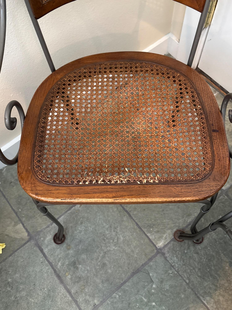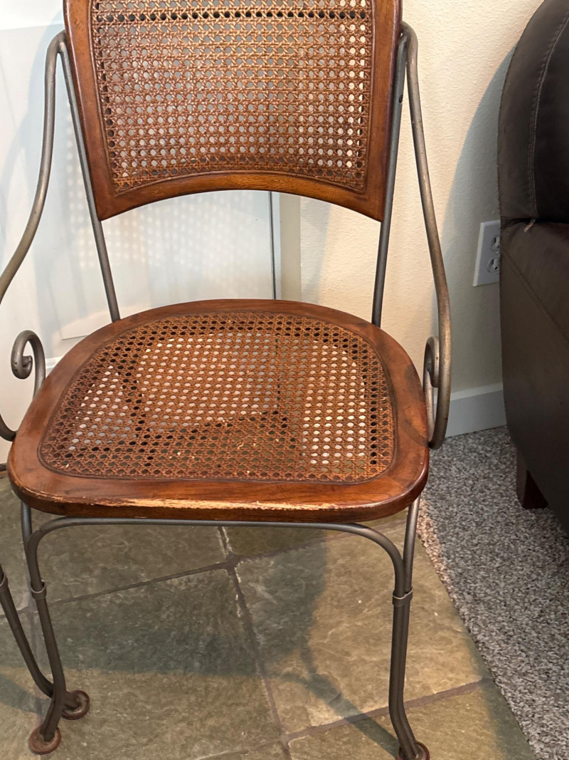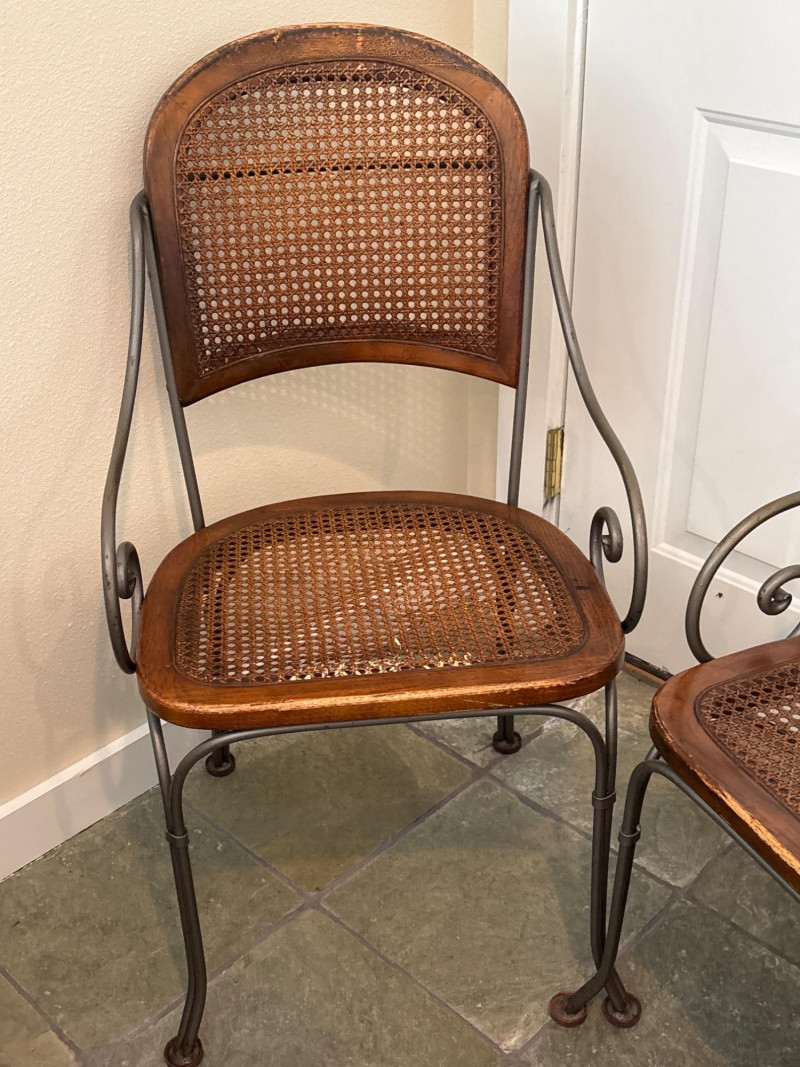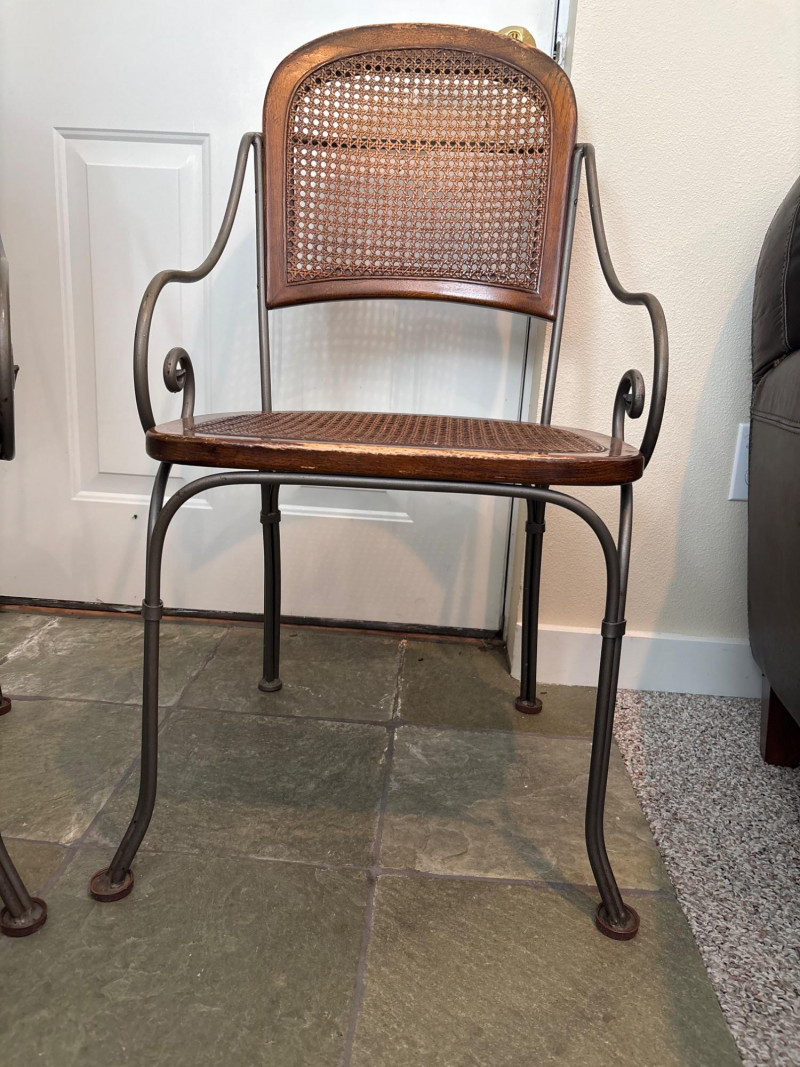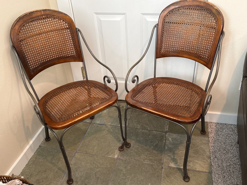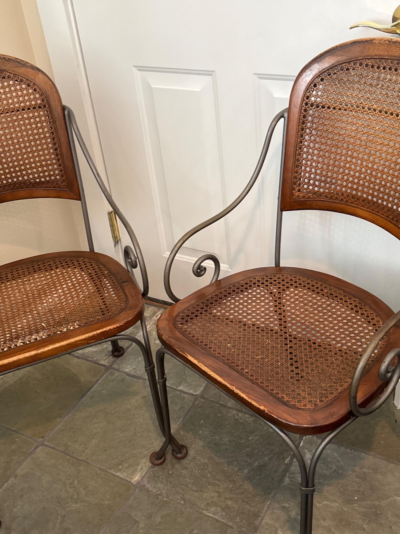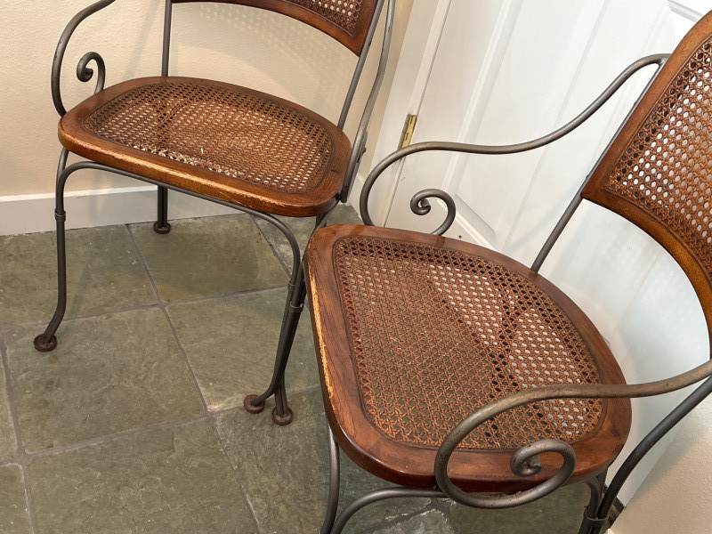 A charming pair of mixed-material accent chairs. This set features elegant, slender metal frames with curved "scroll" armrests and a warm, honey-toned wood and cane seat assembly. The lot features: Woven Cane Back & Seat: Each chair has a classic hexagonal cane weave inset into a finished wooden frame. Woven Details: The metal backrests are accented with additional decorative cane-wrapped detailing for a cohesive look. Scrollwork Design: Features graceful curved metal legs and circular side-scroll accents. Sturdy Construction: The dark-finished metal frames are durable while maintaining a lightweight, airy silhouette. Dimensions: Standard side chair height. (Please see photos for scale). Condition: Good vintage condition. The woven cane is largely intact and tight on both chairs. The wood frames show minor scuffing and the metal has a light, natural patina consistent with age and use. SHIPPABLE: No (Local Pick-up Only)