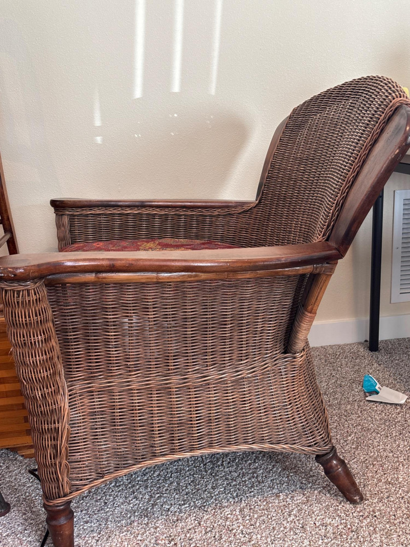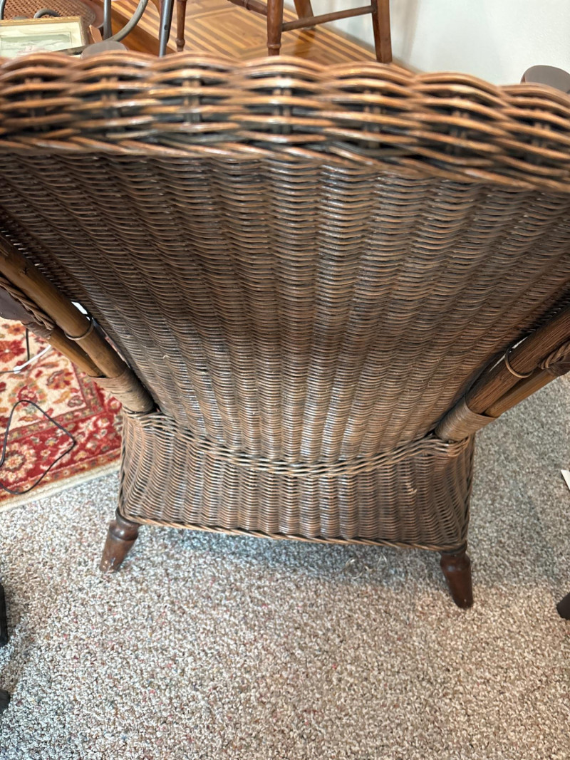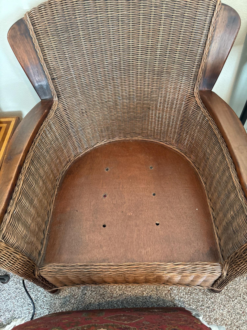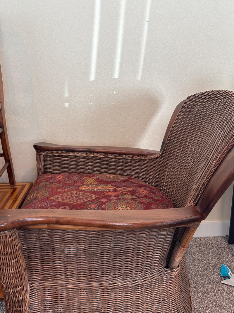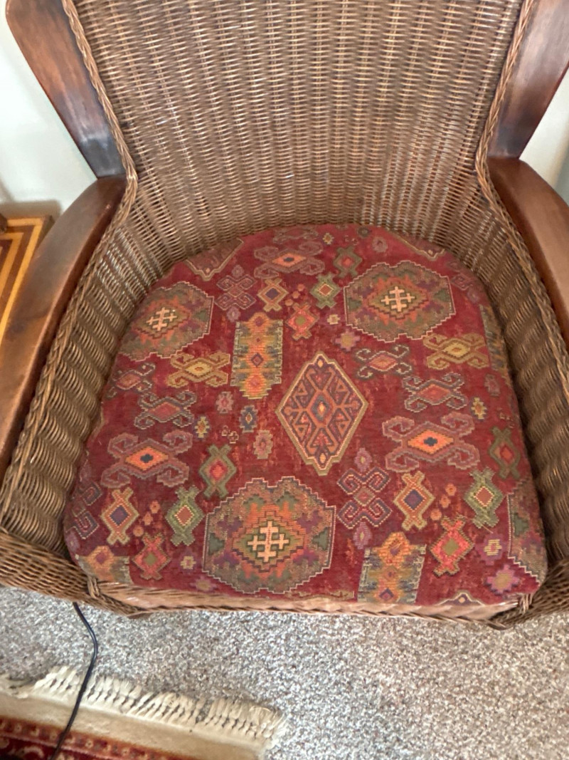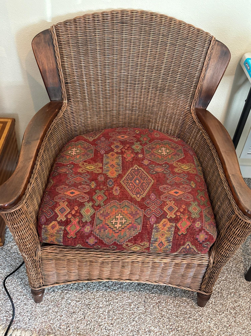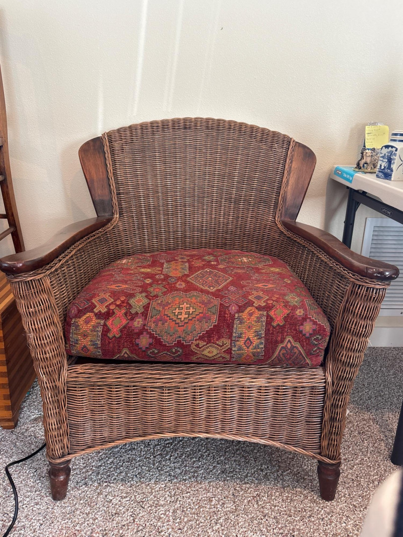 A cozy and stylish addition to any sunroom or living space. This armchair is crafted from natural woven wicker with a deep, supportive back and curved armrests. The dark wood feet provide a sturdy base and a nice contrast to the natural texture of the weave. The lot includes: Wicker Frame: Tight, durable weave with a high-back "tub" style design. Removable Cushion: Features a thick, comfortable foam insert with a multi-colored bohemian or southwestern-style fabric cover. Under-Seat Detail: The chair features a solid wooden seat base beneath the cushion for added durability. Dimensions: * Height: 34" Width: 31" Depth: 23.5" Condition: Good vintage condition. The wicker is largely intact with only minor surface wear consistent with age. The cushion is clean and the structural frame is solid. SHIPPABLE: No (Local Pick-up Only) Shipping