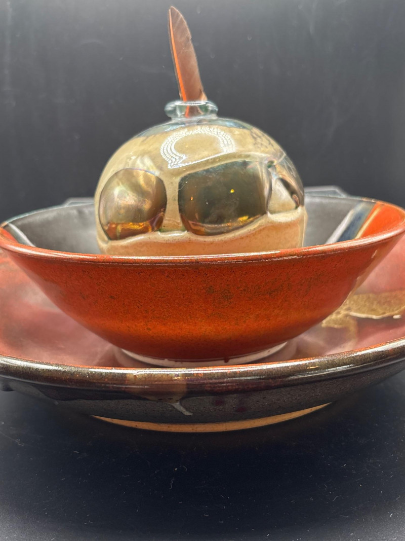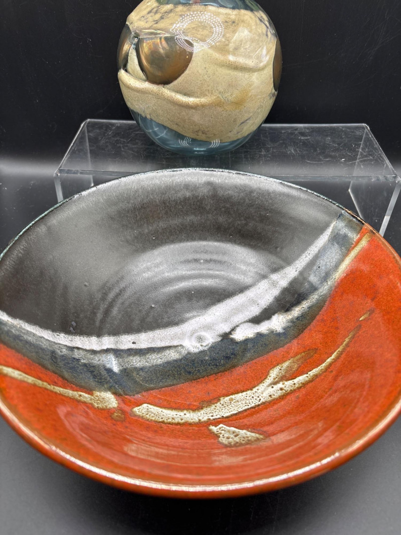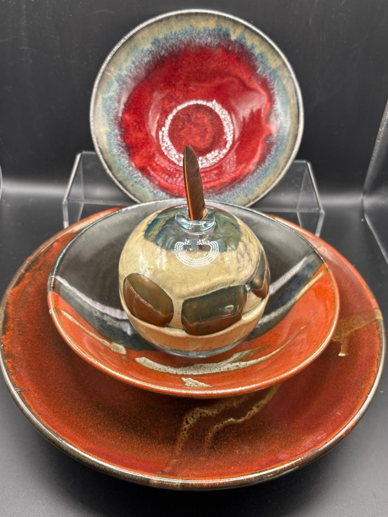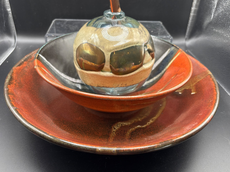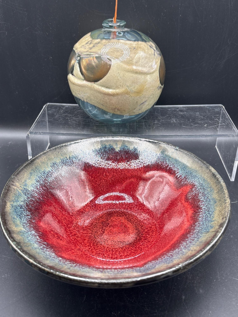Lot # 75 - 3pc Artisan Pottery Bowl Set & Hand-Blown Glass Orb