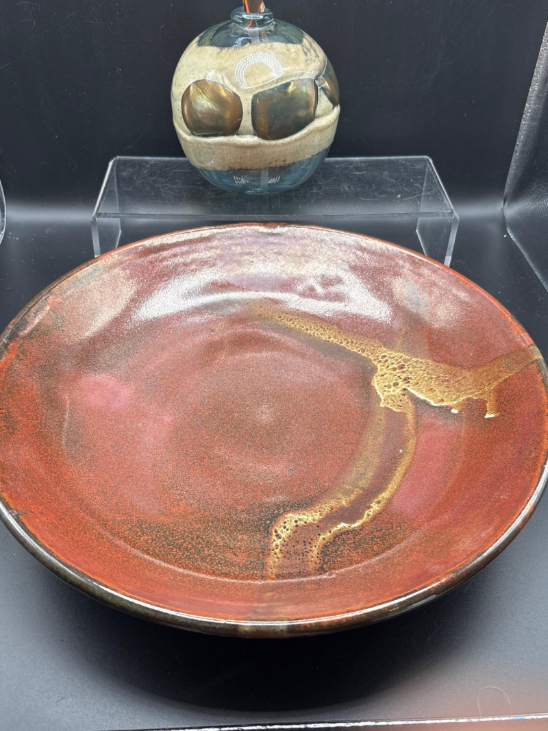 A beautiful four-piece collection of handmade decor. This lot features three distinct pottery bowls, each showcasing unique dimensions and handcrafted character, paired with a vibrant hand-blown glass decorative orb. The lot includes: Large Shallow Pottery Bowl: 13" Diameter x 2.5" Height. Perfect as a low-profile centerpiece or bread bowl. Deep Mid-Size Pottery Bowl: 10" Diameter x 3.3" Height. Features a slightly taller profile with a tapered base. Small Accent Pottery Bowl: 9" Diameter x 3" Height. A versatile size for side displays or smaller items. Hand-Blown Glass Orb: A decorative glass sphere (approximately 4" diameter) designed to sit within the bowls or as a standalone accent. Condition: Excellent condition. No chips, cracks, or repairs found on any of the ceramic pieces or the glass orb. The glazes are well-preserved, and the glass maintains high clarity. SHIPPABLE: Yes