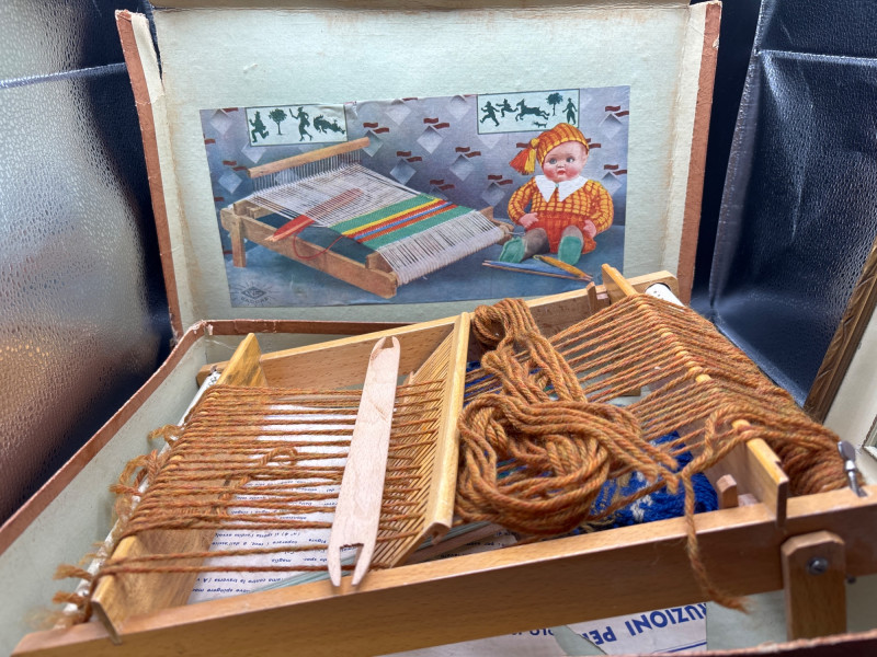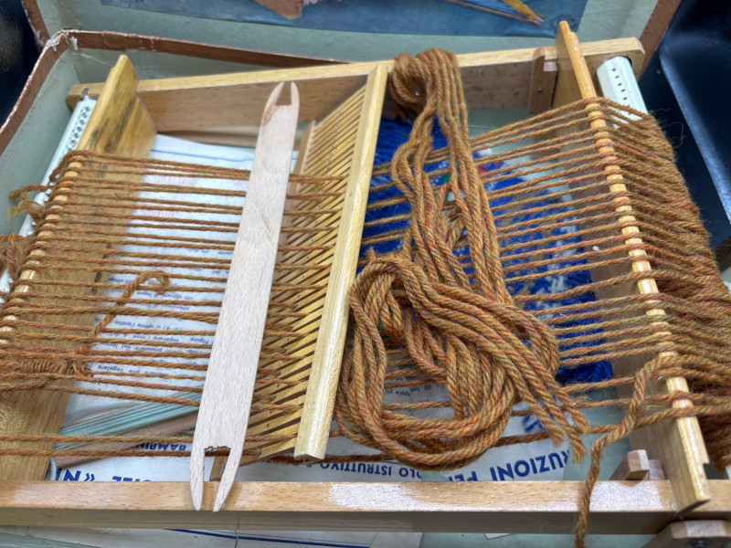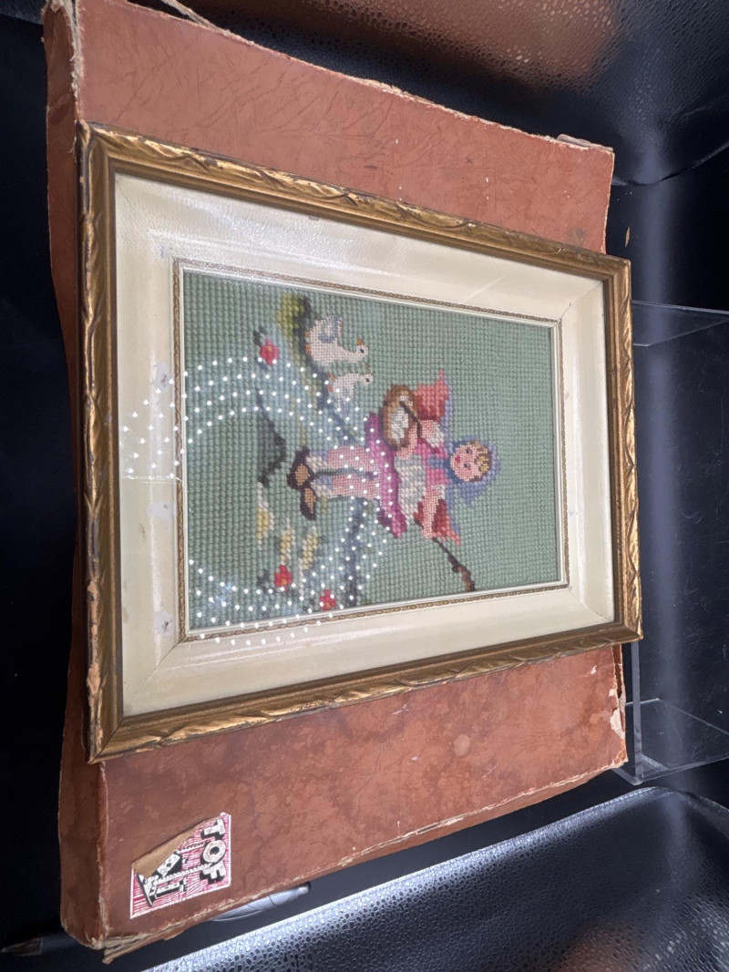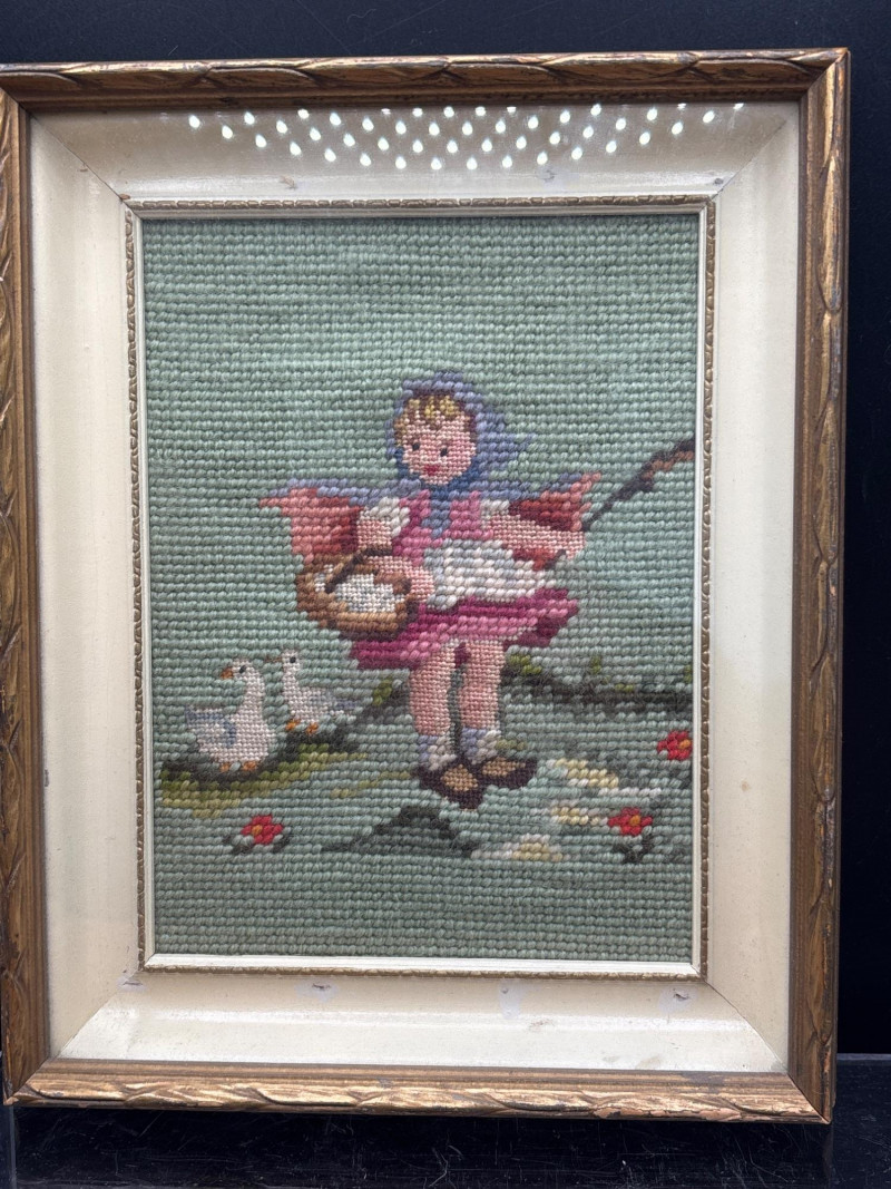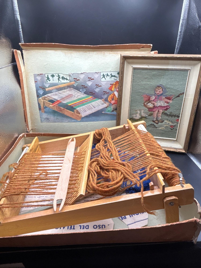 A nostalgic pairing of classic fiber art tools. This lot features a functional tabletop hand loom and a beautifully framed mid-century needlepoint piece. The lot includes: Vintage Tabletop Loom: A compact, wood-frame loom ideal for small weaving projects like coasters or bookmarks. It retains a lovely aged patina and is a great display piece for a craft room. Mid-Century Needlepoint: A hand-stitched needlepoint. The vibrant colors and tight stitching are characteristic of 1960s-70s home decor projects. Framing: The needlepoint comes in a frame, ready to hang. Condition: Good Vintage Condition. The loom is structurally sound and appears functional. The needlepoint is well-preserved behind glass with no visible fading or pulled threads. SHIPPABLE: Yes. Please note: Shipping is charged separately from the auction. Once the auction invoice is paid, if you chose shipping, a second invoice for the exact shipping cost will be sent to the winner.Shipping