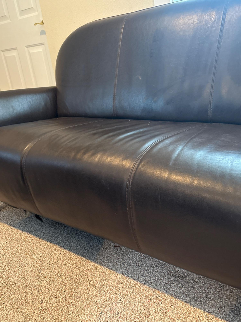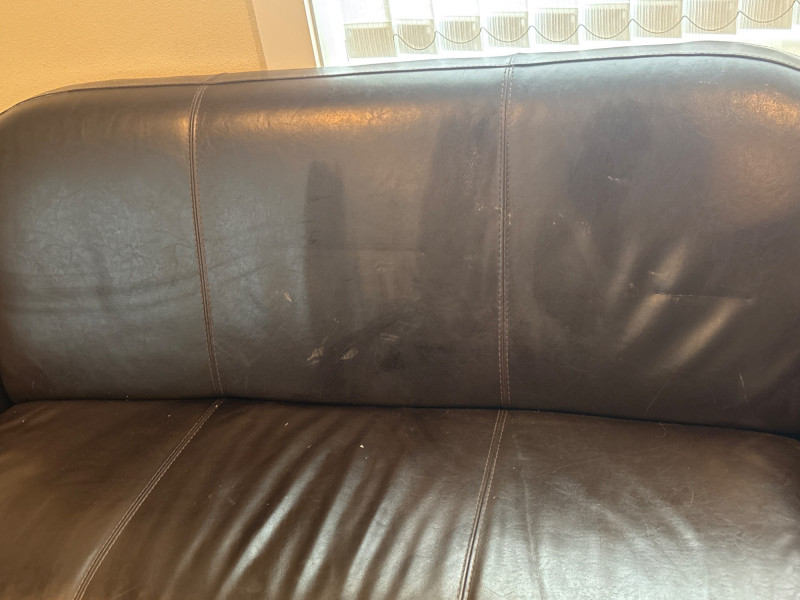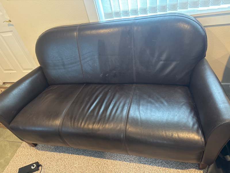 A space-saving seating solution with a classic look. This small-scale sofa features a streamlined design and a durable faux leather finish. Its compact 67-inch length makes it ideal for smaller living rooms, home offices, or apartments. Dimensions: Height: 30" Length: 67" Depth: 30" The lot features: Upholstery: Brown synthetic faux leather designed for durability and low maintenance. Design: Two-cushion style with a low profile that fits easily into tight spaces or under windows. Condition: Fair Condition. The sofa shows signs of regular household use. There is visible surface wear and creasing in the faux leather, but the frame is sturdy and the cushions remain supportive. SHIPPABLE: No (Local Pick-up Only)