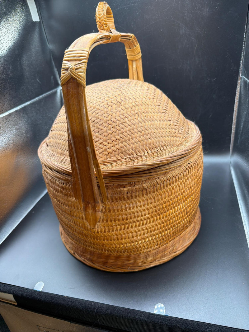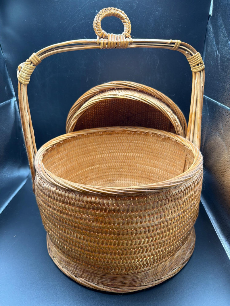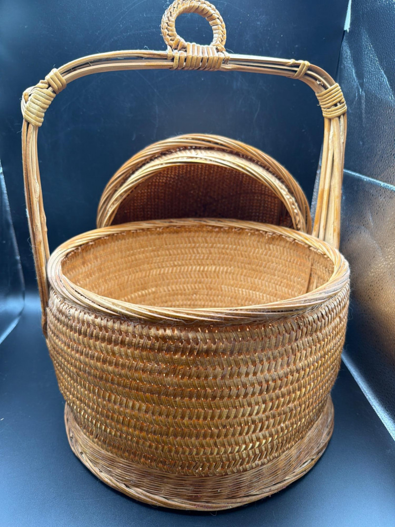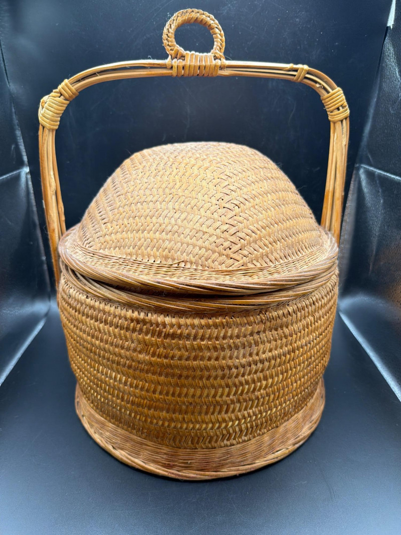 An authentic piece of traditional Chinese ceremonial craft. This vintage wedding basket, also known as a betrothal basket, was historically used to carry gifts or food during marriage ceremonies. Unlike the tiered versions, this single-compartment design offers a deep, open space perfect for large decorative displays or unique storage. The lot features: Single-Chamber Design: A deep, spacious hand-woven basket, ideal for use as a centerpiece, a planter cover, or a high-end gift hamper. Intricate Weaving: Features detailed hand-woven patterns in natural bamboo or rattan, showcasing a high level of traditional craftsmanship. Arched Carrying Handle: A sturdy, reinforced handle designed for transport, providing a beautiful silhouette for any room. Symbolism: A traditional symbol of union and prosperity, making it a meaningful addition to any collection of Asian antiques. Condition: Good Vintage Condition. The weaving is structurally sound with a warm, aged patina. Shows minor surface wear consistent with its vintage origin, adding to its authentic character. SHIPPABLE: Yes. Please note: Shipping is charged separately from the auction. Once the auction invoice is paid, if you chose shipping, a second invoice for the exact shipping cost will be sent to the winner.Shipping