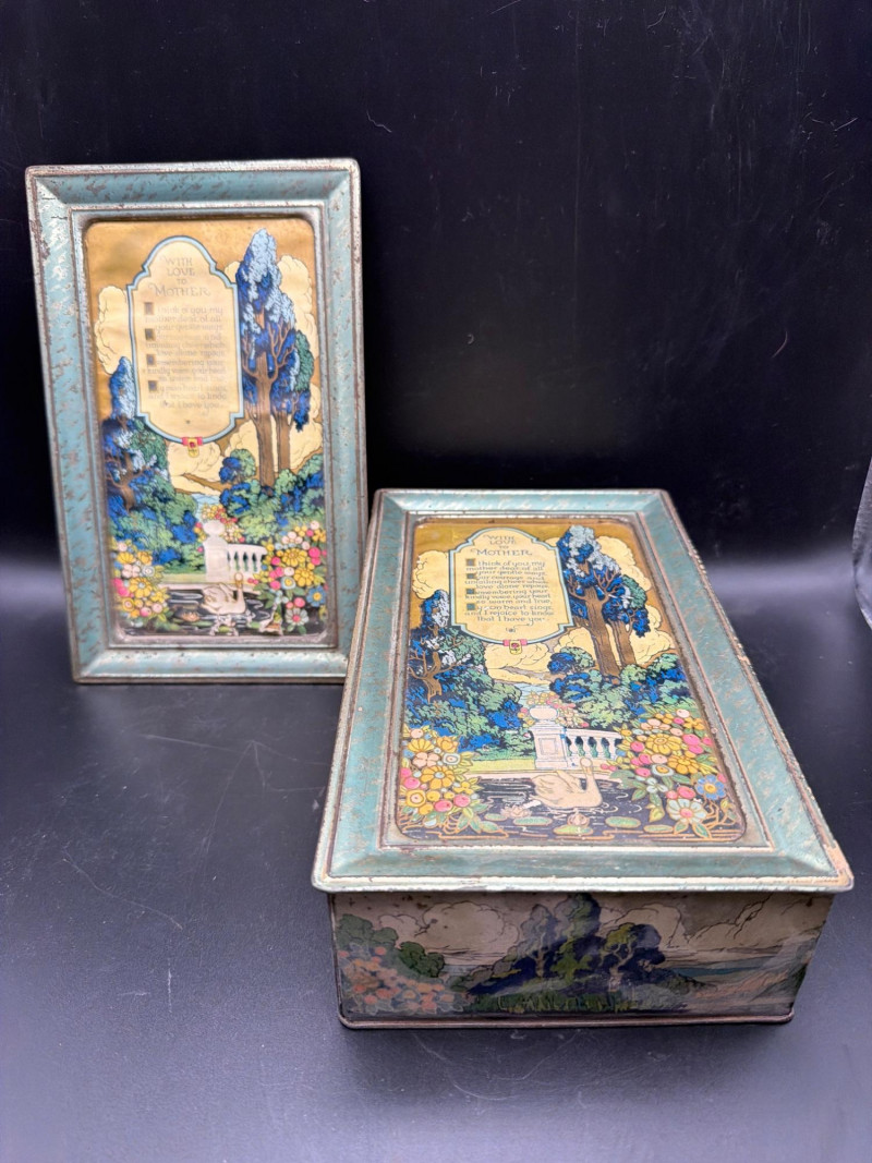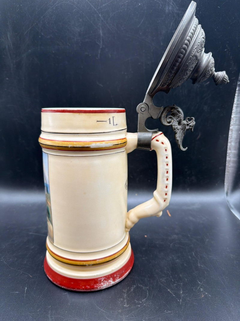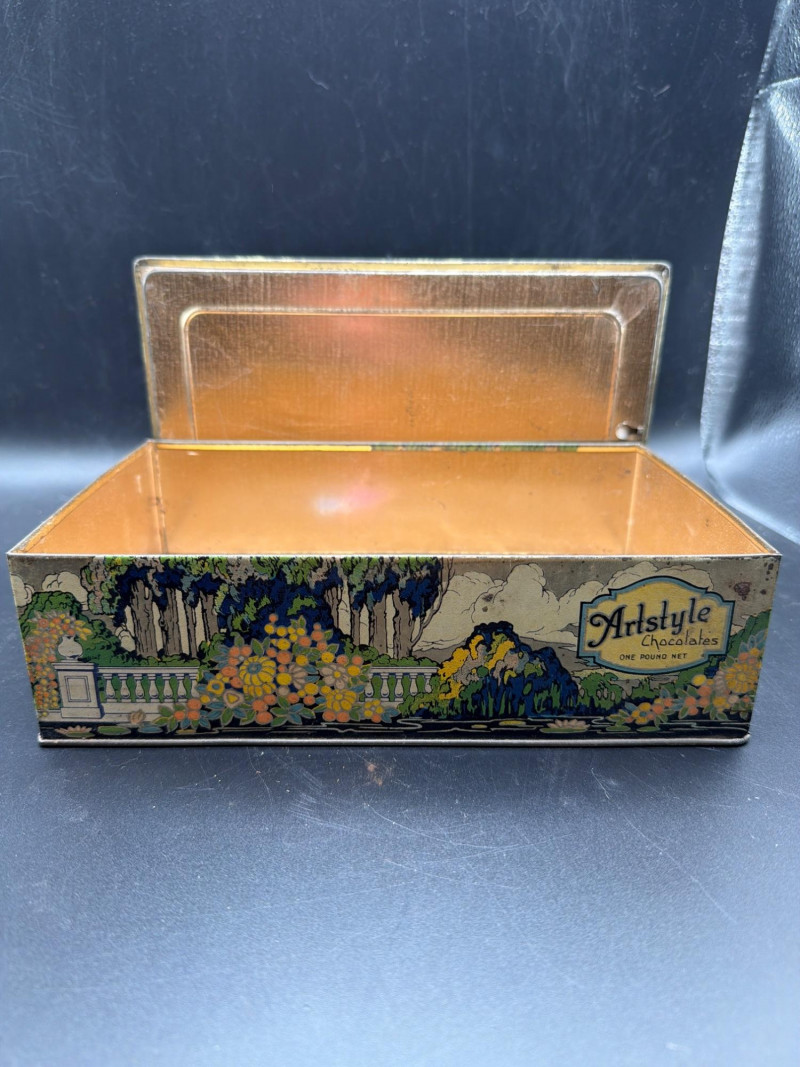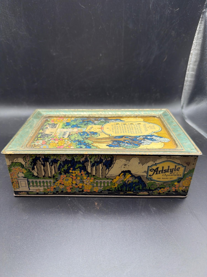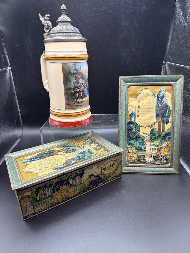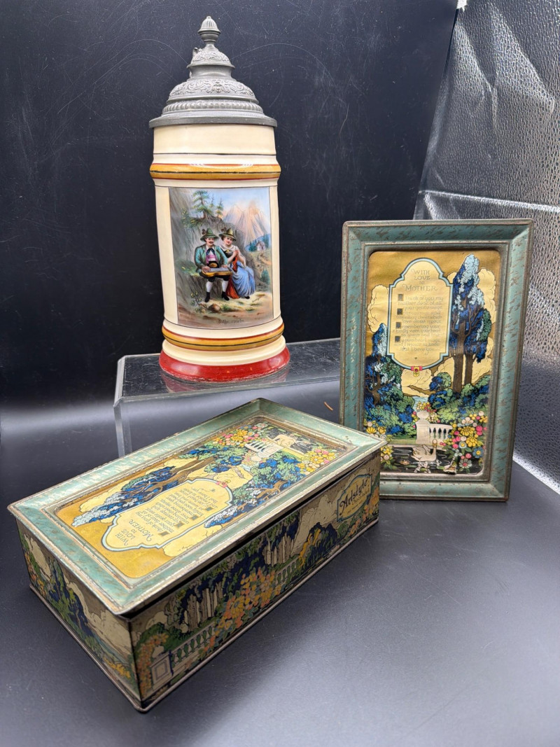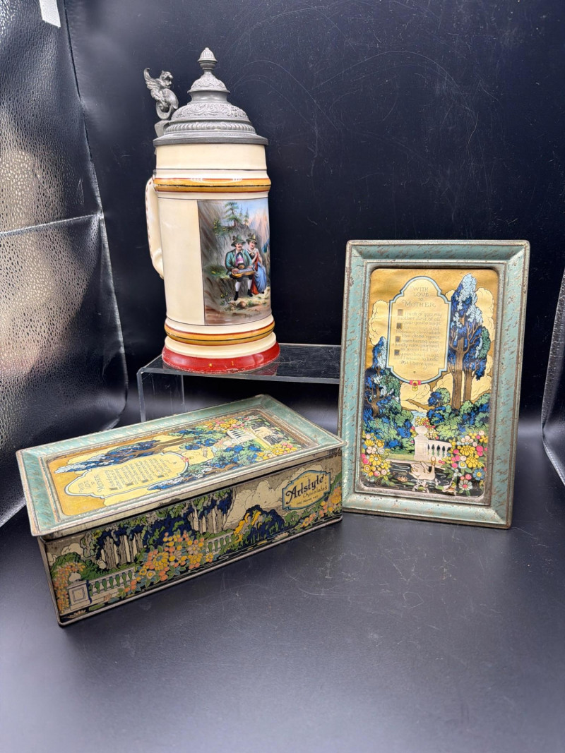 A charming duo of early 20th-century European-style collectibles. This lot features two distinct decorative pieces that showcase traditional craftsmanship and vintage artistry. The lot includes: Artstyle Chocolates Tin: A beautiful metal storage container from the early 20th century. Traditional German Beer Stein: A classic ceramic or stoneware mug featuring a functional metal hinged lid. Condition: Good Vintage Condition. * Tin: Shows a wonderful aged patina with minor surface scuffing and light oxidation consistent with its 100-year history. Stein: The ceramic is free of major chips, cracks pictured, and the hinged lid operates smoothly. SHIPPABLE: Yes Please note: Shipping is charged separately from the auction. Once the auction invoice is paid, if you chose shipping, a second invoice for the exact shipping cost will be sent to the winner.Shipping