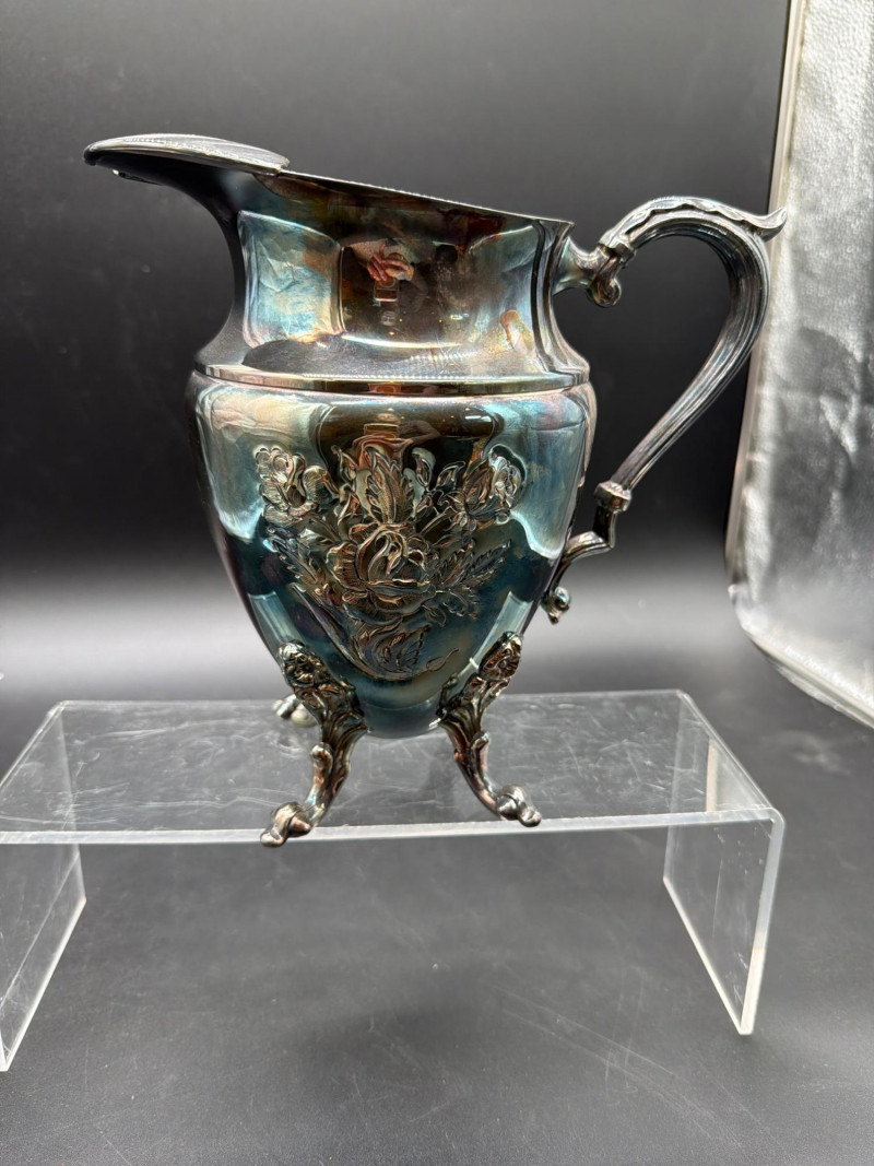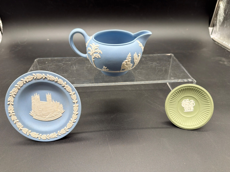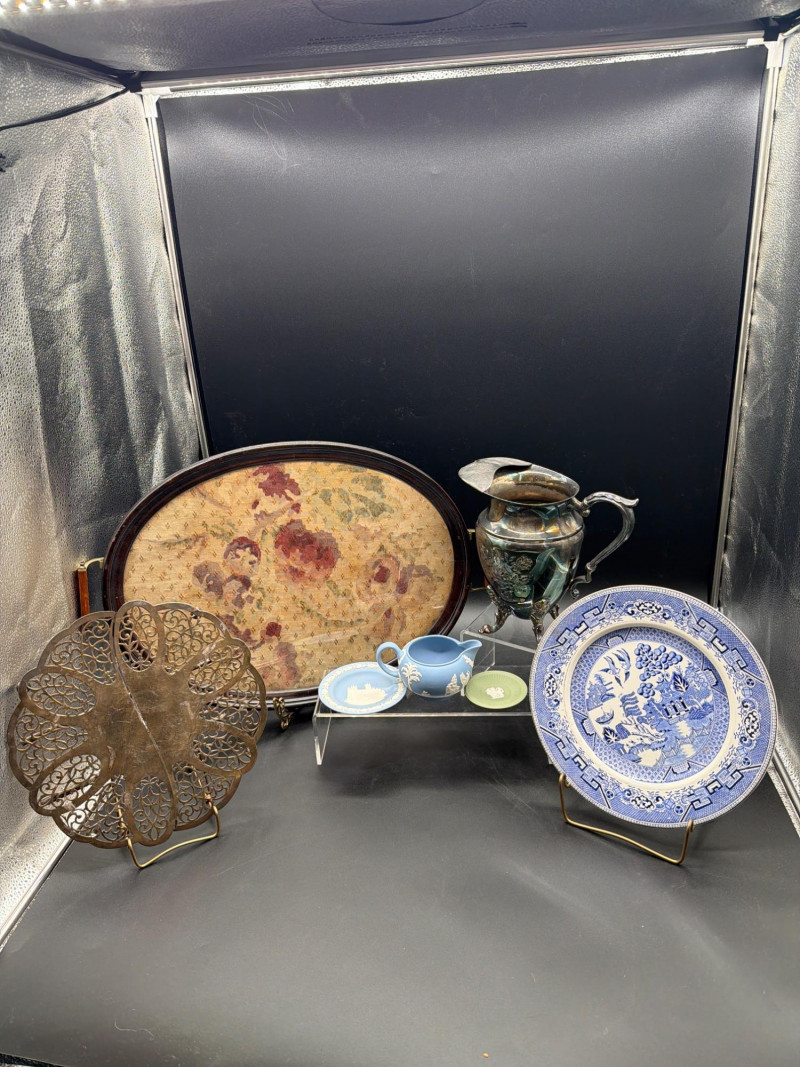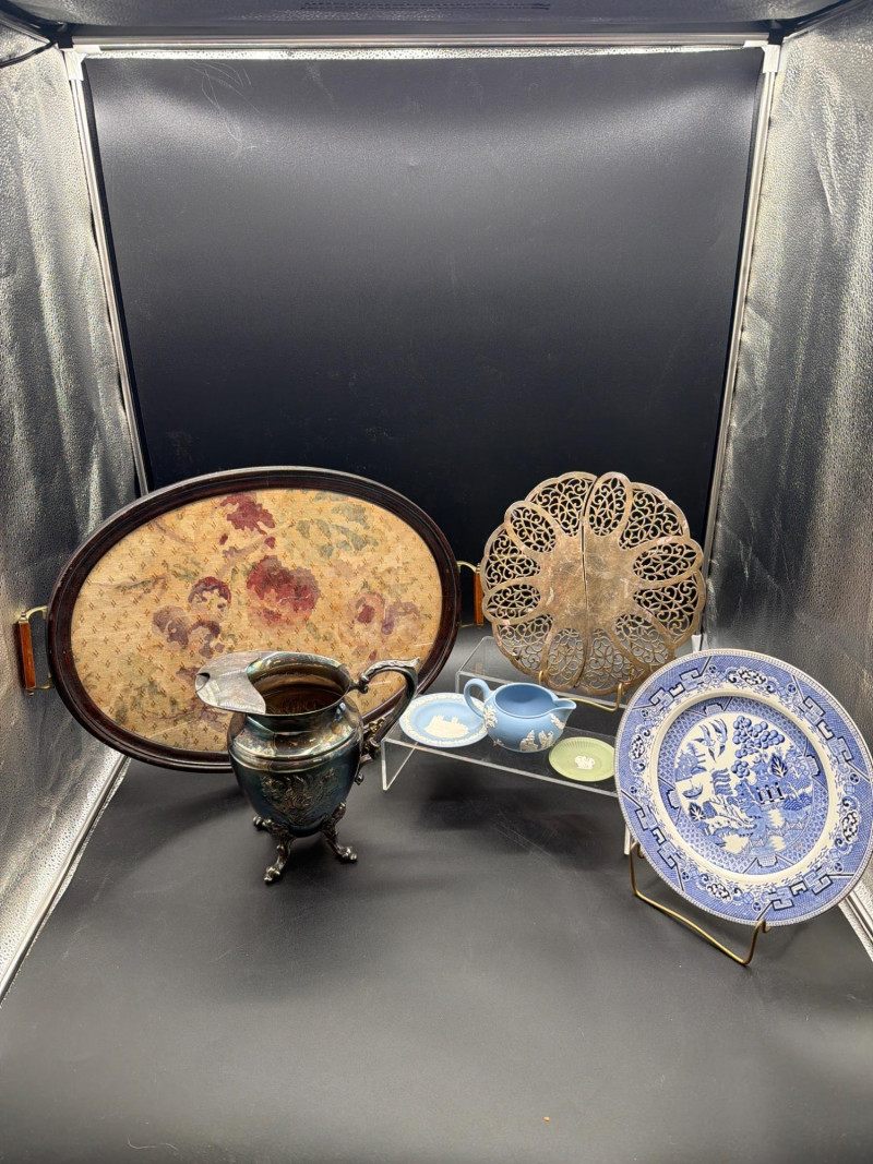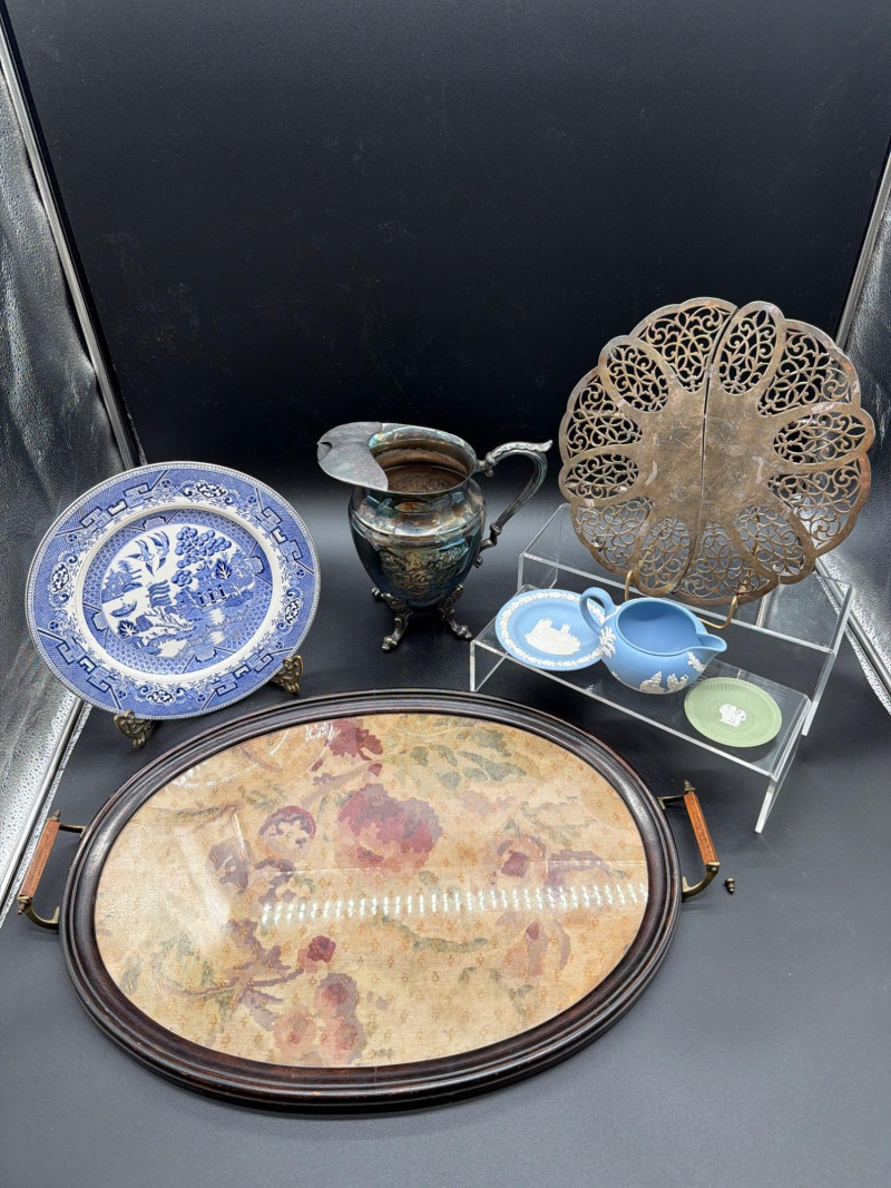 An elegant collection of vintage serving and tea-time essentials. This lot brings together the craftsmanship of Mid-Century Italian woodwork and the timeless prestige of English stoneware. The lot includes: Mid-Century Italian Serving Tray: A stunning oval wooden tray featuring intricate marquetry inlay. Wedgwood Jasperware Pieces: three small pieces of Wedgwood Jasperware. Featuring the signature matte finish and neoclassical white bas-relief figures, these are timeless collector's items. Silver-Plated Pitcher: A classic, polished silver-plated pitcher, perfect for water, cream, or as a decorative floral vase. Expanding Silver Plate Hot Plate: A clever and functional vintage "trivet." This silver-plated piece expands to accommodate various dish sizes, protecting your tabletop in style. Condition: Good Vintage Condition. The wood inlay on the tray is intact and vibrant. The Wedgwood pieces are free of chips or cracks. The silver-plated items show a bright finish with light, authentic patina that can be polished to a high shine. SHIPPABLE: Yes Please note: Shipping is charged separately from the auction. Once the auction invoice is paid, if you chose shipping, a second invoice for the exact shipping cost will be sent to the winner.Shipping