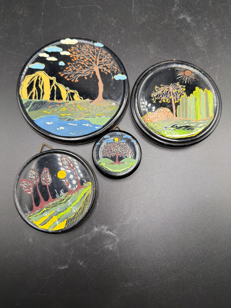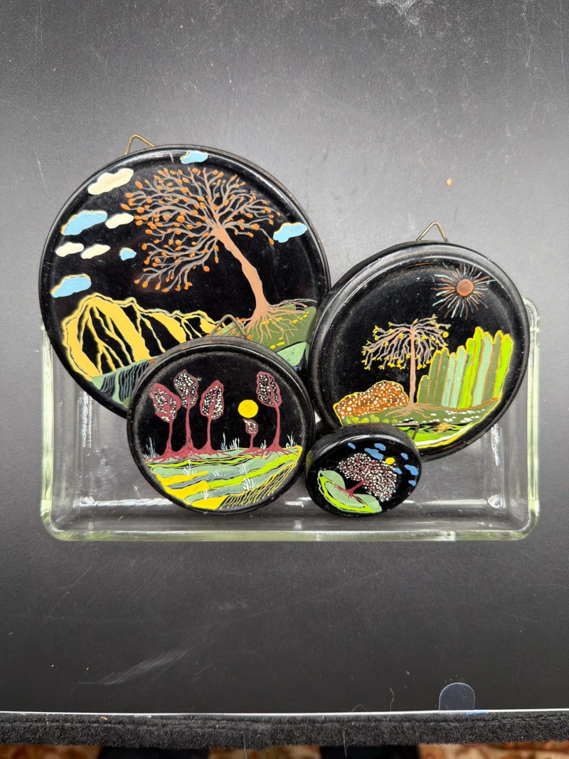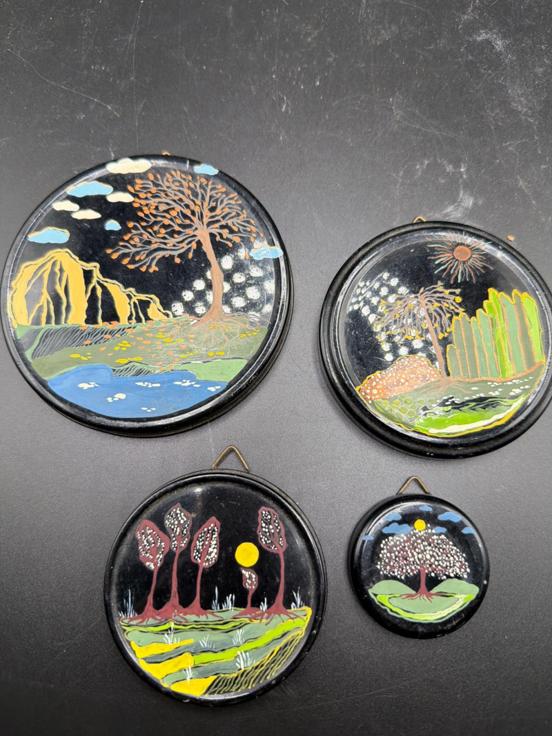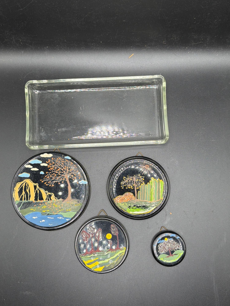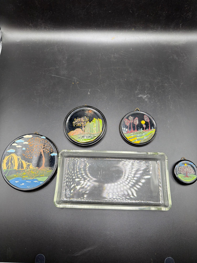 A designer-curated collection of decorative art and glass. This diverse lot blends the historical charm of a genuine antique tile with the vibrant colors of contemporary artisan ceramics. The lot includes: Antique Windmill Tile: A true standout piece. This square ceramic tile features a classic, time-honored windmill scene—a staple of traditional European cottage decor. It shows a wonderful aged character that only comes with time. 4 Hand-Painted Round Tiles: A "pretty" quartet of circular art tiles. These feature bright, meticulously painted pictorial scenes, perfect for use as decorative coasters, small wall hangings, or displayed on mini-easels. 3 Contemporary Accent Tiles: Modern square tiles that complement the set, adding variety in texture and design for a cohesive decorative display. Clear Glass Display Tray: A sleek, versatile glass tray that serves as the perfect base for grouping these treasures together or for serving small items with a touch of elegance. Condition: Good Antique/Vintage Condition. The antique windmill tile shows authentic age-related crazing that adds to its value. The newer tiles and glass tray are in excellent condition, with vibrant colors and no chips or cracks. SHIPPABLE: Yes