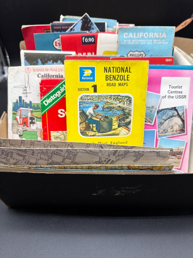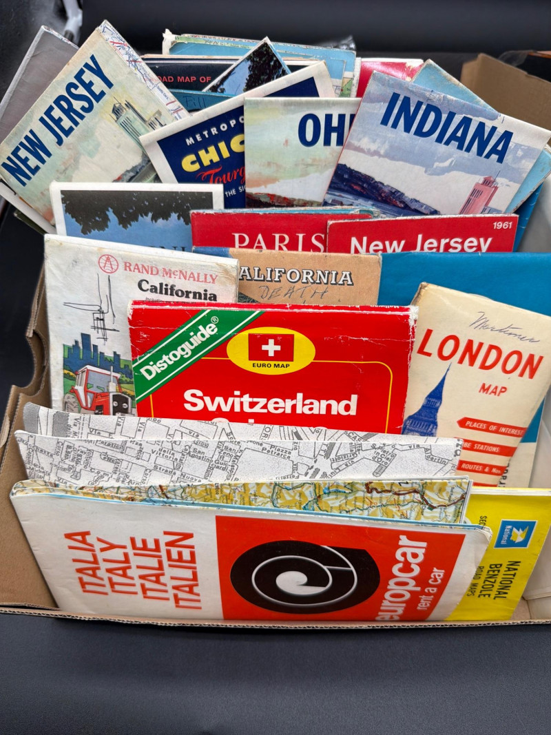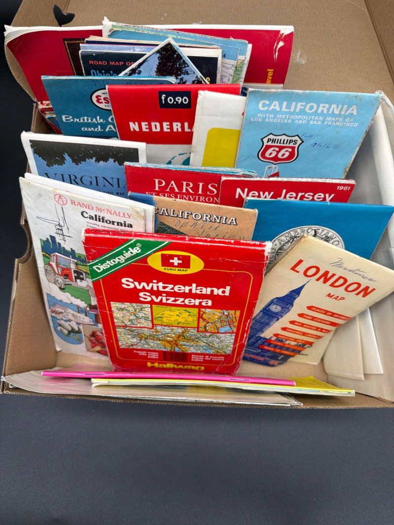A nostalgic journey across the globe. This curated collection of vintage paper road maps and travel guides captures a bygone era of "the open road." Historically distributed by iconic gas stations, tourist bureaus, and banks, these maps are now prized as historical artifacts and examples of mid-century graphic design. The collection includes: Oil Company Classics: Features maps from legendary brands like Phillips 66 and Esso. Global & Domestic Destinations: Includes regional maps for California and New Jersey, along with international travel guides for France (Paris) and Switzerland. Historical Geography: These maps preserve old highway systems, town names, and landmarks exactly as they existed decades ago. Graphic Appeal: Many feature vibrant cover illustrations and period-specific advertisements. Condition: Good Vintage Condition. The paper remains intact with typical age-related wear, including some minor edge fraying or light yellowing consistent with their history as a functional travel tool. Most remain crisp with original folds. SHIPPABLE: Yes.