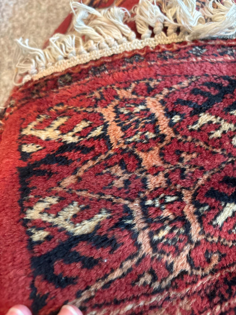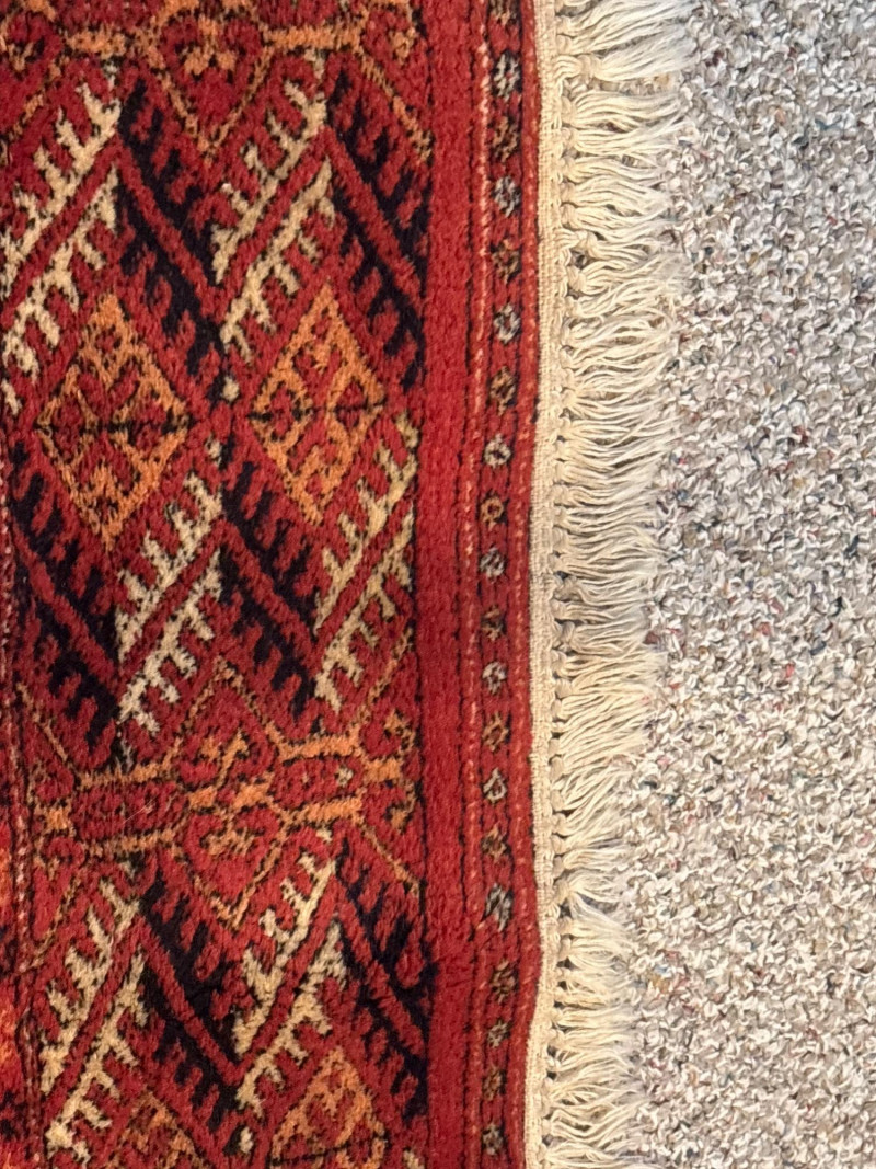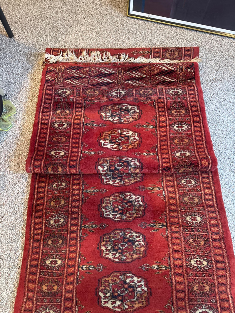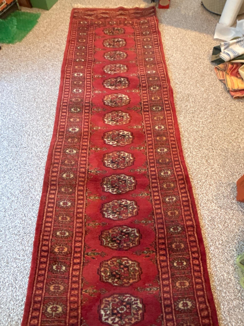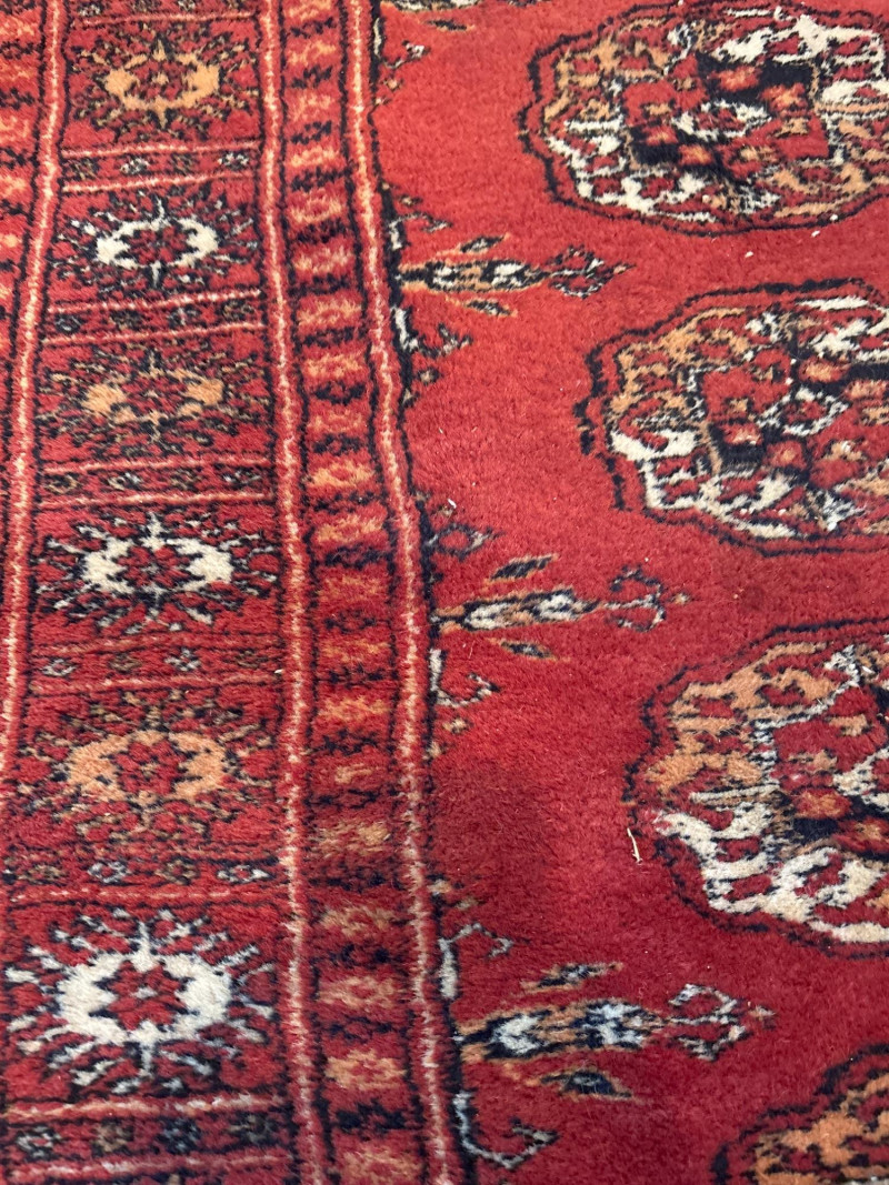 A luxurious and durable addition to any hallway or gallery. This hand-knotted Pakistani Bukhara runner is a masterpiece of traditional weaving. Known for their exceptionally soft, "silky" wool pile and classic geometric symmetry, Bukhara rugs are a favorite among interior designers for their ability to blend with both modern and traditional decor. The lot features: Iconic Pattern: Showcases the traditional repeating "gul" (medallion) motifs, often referred to as the "Elephant's Foot" pattern, set against a rich, saturated field. Hand-Knotted Quality: Meticulously crafted using high-quality wool, providing a dense, plush pile that feels incredible underfoot. Artisanal Dyes: Features the deep, lustrous jewel tones characteristic of Pakistani weaving, which catch the light beautifully from different angles. Versatile Format: The long, narrow runner shape is perfect for hallways, entryways, or as a bedside accent. Condition: Excellent Vintage Condition. The wool pile is thick and even throughout. The hand-tied fringes are intact and show minimal wear. As with all fine hand-knotted textiles, there are slight natural variations in the weave that confirm its artisanal origin. NOT SHIPPABLE: NO to largeShipping