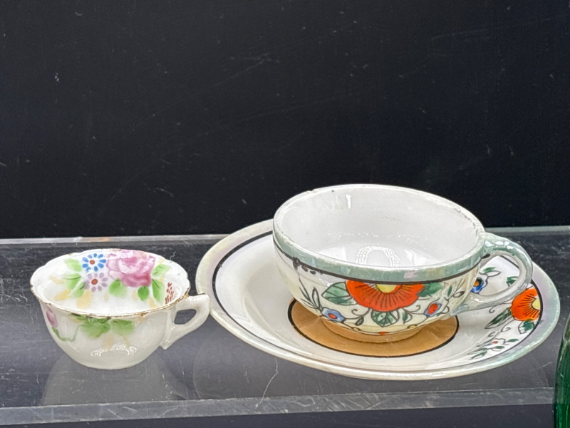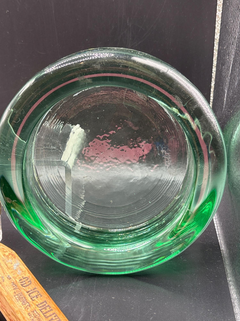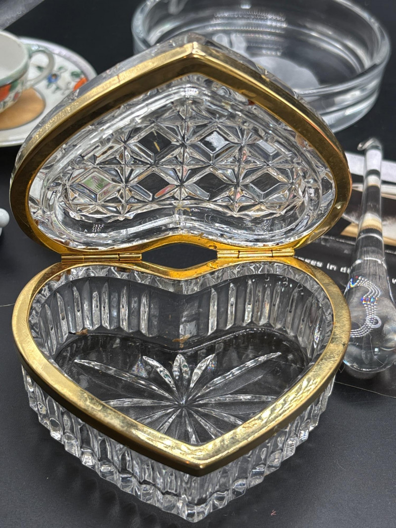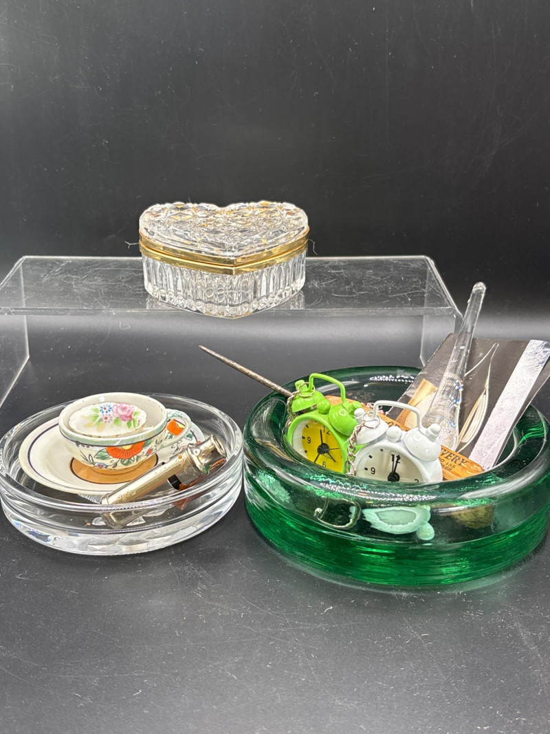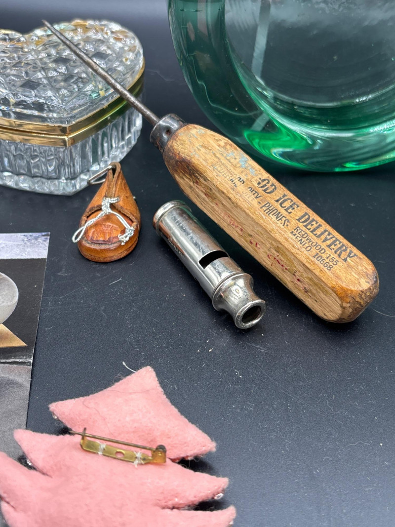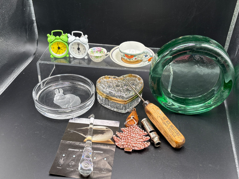 A premium collection of vintage art glass and boutique collectibles. This lot features a high-end mix of Japanese crystal, American art glass, and early 20th-century functional curios. The Glassware & Vanity Collection includes: Hoya Crystal "Rabbit" Dish: A beautiful shallow clear glass dish featuring a frosted etching of a rabbit. Attributed to the renowned Japanese manufacturer Hoya Crystal, known for its optical-grade clarity. Blenko-Style Green Art Glass: A heavy, vibrant green "catch-all" dish. Crystal Heart Trinket Box: A vintage 1950s hinged vanity box with a brilliant cut-crystal heart design and elegant brass-toned metal rims. Miniature Porcelain Tea Set: A delicate demitasse cup and saucer set featuring intricate [floral/bird] patterns, typical of fine vintage German or Japanese exports. The Specialty Tools include: Vintage Advertising Ice Pick: A classic early 20th-century promotional tool with a turned wooden handle. These were iconic giveaways from local ice and coal companies and are highly collectible today. Condition: Very Good Vintage Condition. All glass and crystal pieces are clear and vibrant with no chips or cracks observed. The porcelain set is intact. The ice pick shows an authentic aged patina on the wood and metal, consistent with its era as a functional advertising piece. SHIPPABLE: Yes Please note: Shipping is charged separately from the auction. Once the auction invoice is paid, a second invoice for the exact shipping cost will be sent to the winner. Shipping