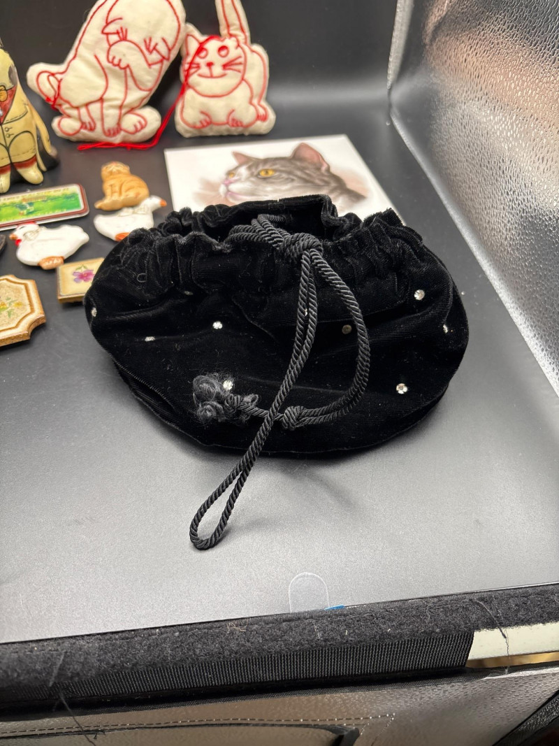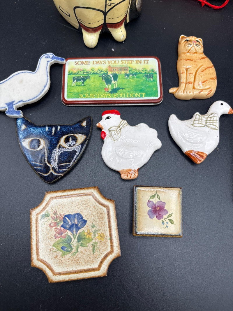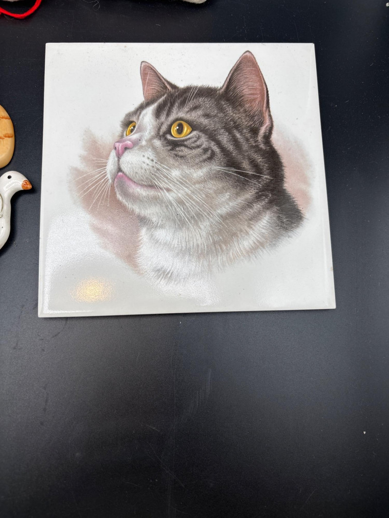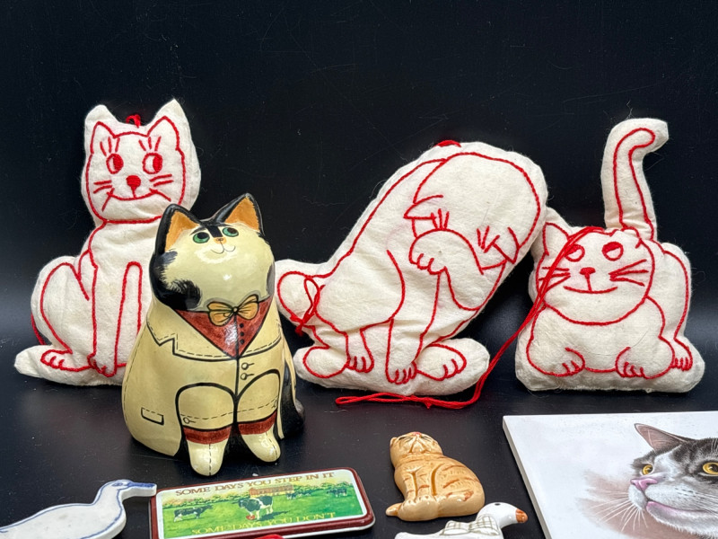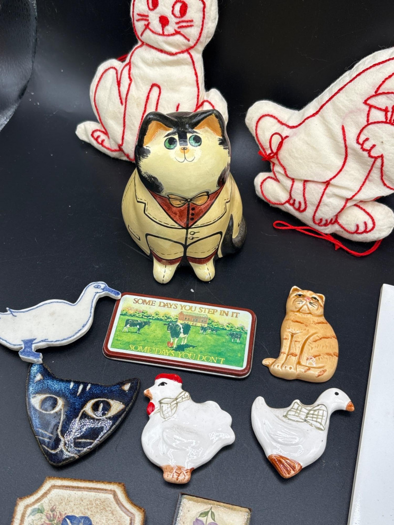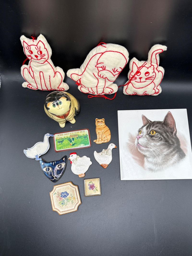 A charming "Meyow & Meadow" curated collection. This lot features a whimsical yet sophisticated blend of vintage cat-themed collectibles and high-end bird and floral decor, including pieces attributed to world-renowned makers. The Cat-Themed Collection includes: 3 Embroidered "Sylvester" Style Ornaments: Vintage-style white fabric plushies with intricate red folk-art embroidery. Hand-Carved Style Ceramic Cat: A round, seated figurine consistent with Kutani porcelain or Artesania Rinconada artistry. Large Tabby Cat Ceramic Tile: A high-quality realistic tile, likely of Swiss or European origin (Laufen or Villeroy & Boch style). Stylized Blue Cat Face: A unique vintage piece appearing to be a masquerade-style mask or oversized enamel collectible. The Bird & Floral Decor includes: Nao by Lladró Style Bird Figurines: Two elegant white porcelain figures with delicate blue and orange accents, characteristic of the famous Spanish porcelain house. Octagonal Floral Trinkets: Decorative pieces featuring patterns reminiscent of Wedgwood "Sarah" bone china or high-end 1970s resin trivets. Condition: Very Good Vintage Condition. All ceramic and porcelain pieces are free of major chips or cracks. The fabric ornaments are clean and well-preserved. Minor age-appropriate wear to the blue cat face mask adds to its vintage character. SHIPPABLE: Yes.