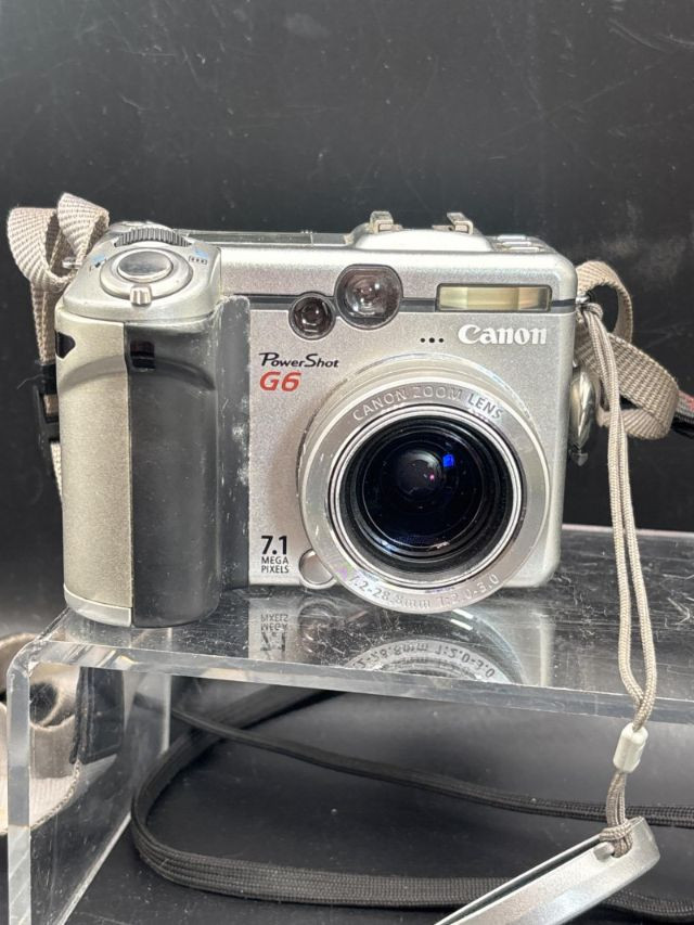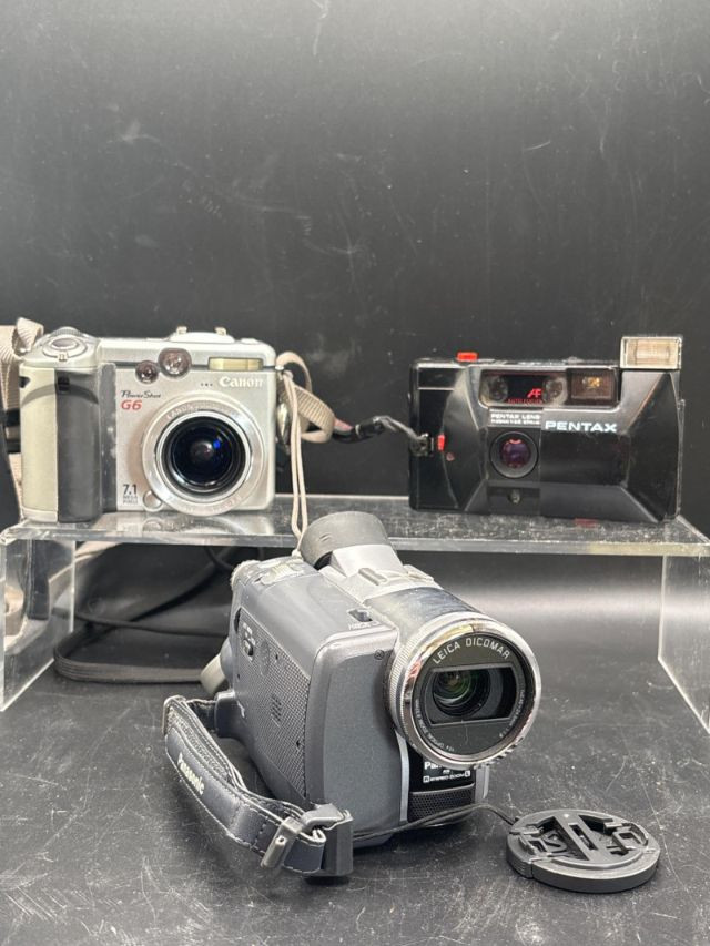 A "Time Capsule" collection of high-end vintage imaging. This lot features three powerhouse cameras from the transition era of film to digital. Whether you are a "digicam" enthusiast, a lo-fi videographer, or a film hobbyist, this bundle offers professional-grade optics from the industry's most respected brands. The collection includes: Canon PowerShot G6 Digital Camera: A legendary "prosumer" model featuring a 7.1-megapixel sensor and a remarkably fast f/2.0-3.0 lens. Panasonic PV-GS250 MiniDV Camcorder: A high-end video unit featuring a professional 3CCD sensor system and a world-class Leica Dicomar lens. Pentax Compact Film Camera: A sleek, pocket-sized 35mm point-and-shoot featuring reliable autofocus. Condition: Untested. All units are being sold in untested condition. Visually, the lenses appear clear, and the battery compartments are free of major corrosion. No chargers or cables are included unless pictured. These are excellent candidates for collectors or those looking to revive classic tech. SHIPPABLE: Yes Please note: Shipping is charged separately from the auction. Once the auction invoice is paid, if you chose shipping, a second invoice for the exact shipping cost will be sent to the winner. Shipping