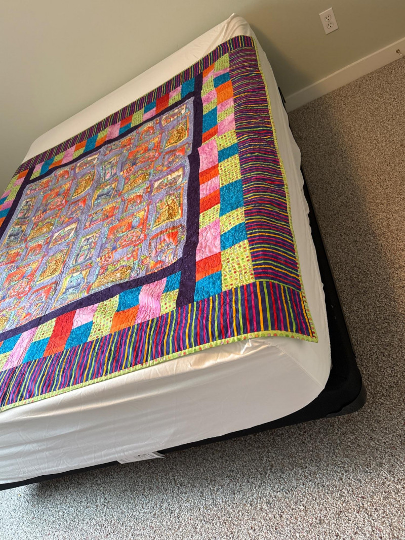 This vibrant patchwork quilt is a handmade piece incorporating iconic Laurel Burch fabric panels. The central design features a grid of colorful animal motifs, characteristic of Burch’s "Fantastic Felines" collections for Clothworks. Surrounding the central art panels are bright, multi-colored geometric borders in a "Magic Squares" or "Window Pane" layout. Given its proportions, this is a custom "crib" or "lap" size quilt featuring Burch’s distinct, stylized artistic style. Designer: Laurel Burch / Clothworks Fabric Pattern: Fantastic Felines / Felines & Canines Style: Handmade Multi-Border Patchwork Size: Lap / Crib / Wall Hanging Features: Iconic stylized animal motifs with bold geometric borders SHIPPABLE: Yes Local Pick Up: Available for this lot. Please note: Shipping is charged separately from the auction. Once the auction invoice is paid, if you chose shipping, a second invoice for the exact shipping cost will be sent to the winner. Combined Shipping: We offer multi-lot discounts! If you win multiple shippable items, we will combine them to save you money on your second shipping invoice.Product Details