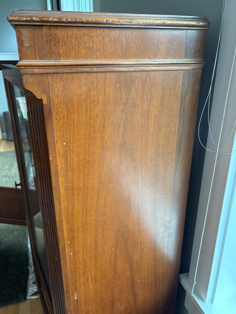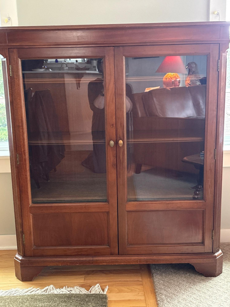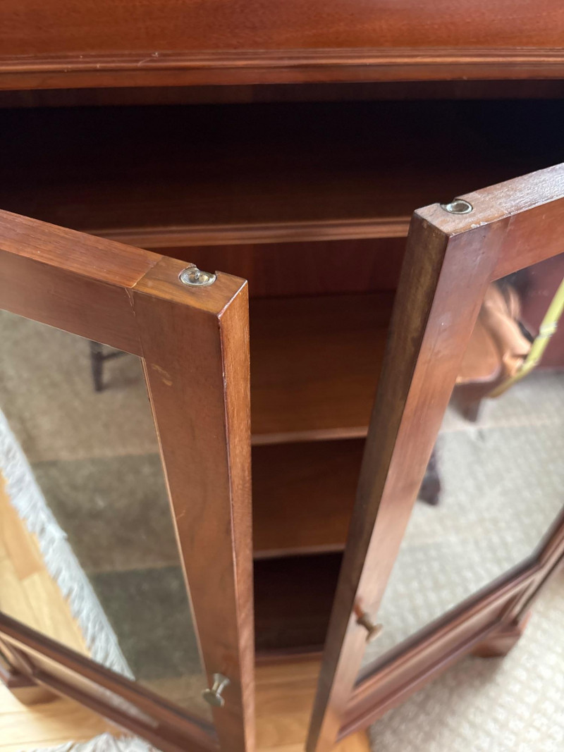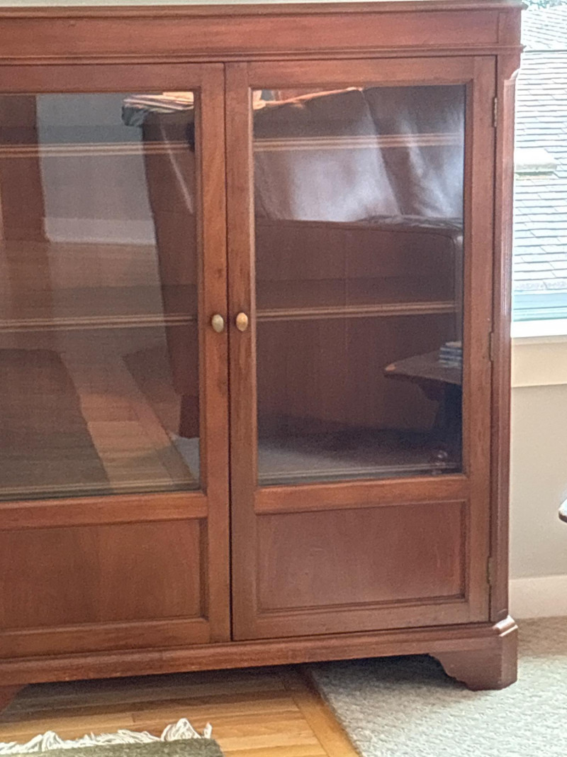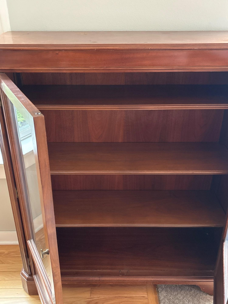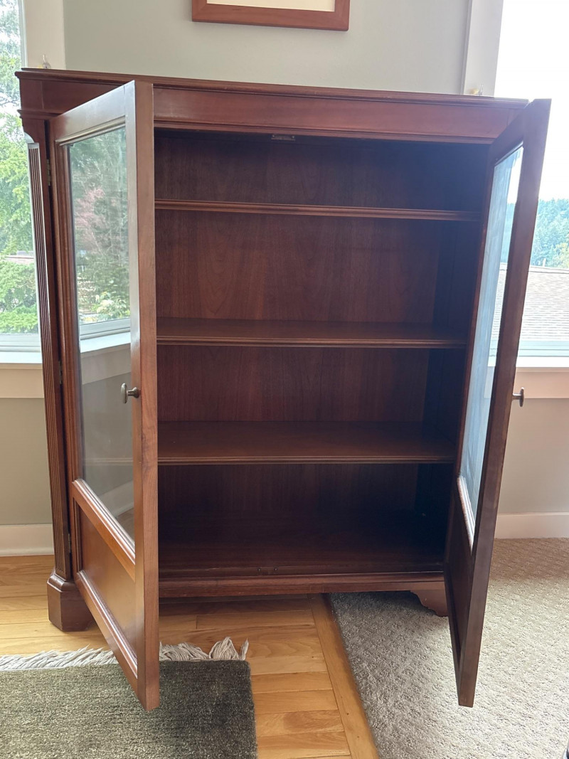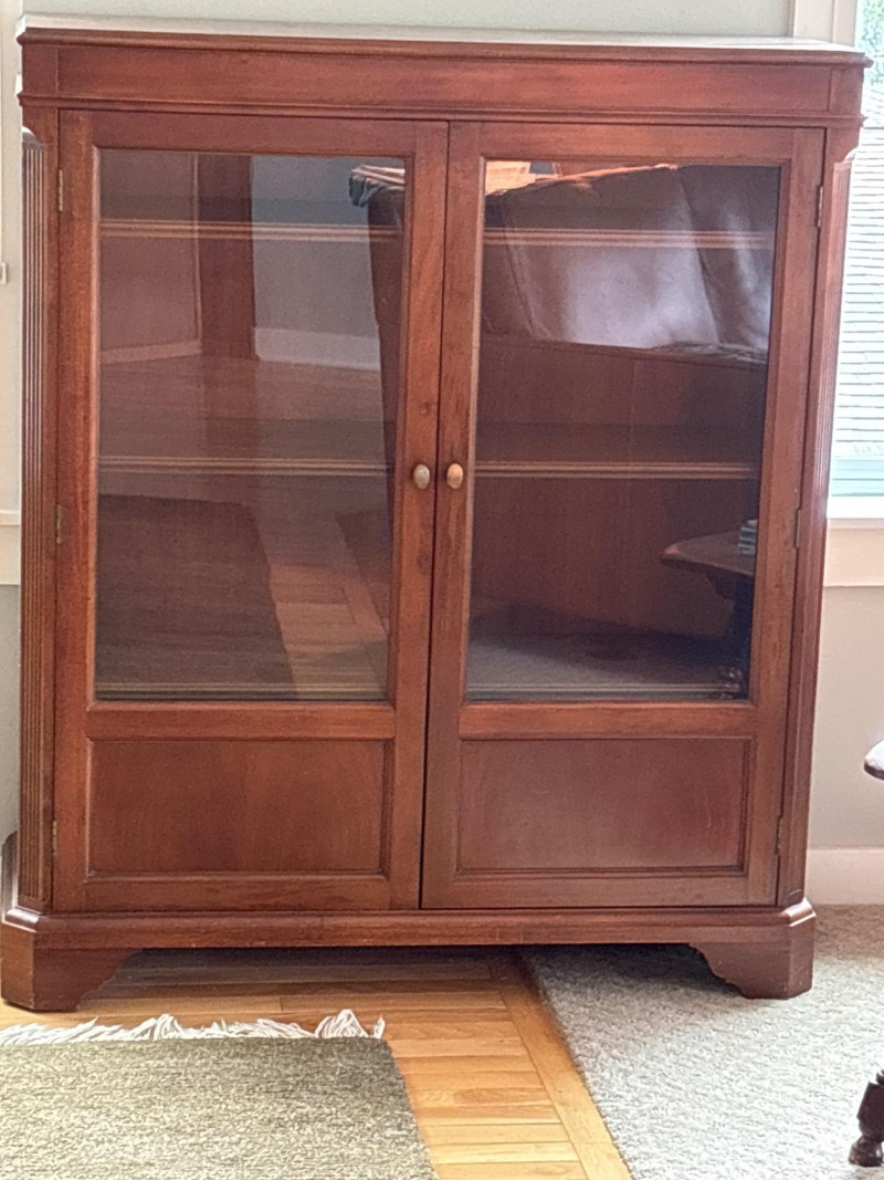 A magnificent example of 19th-century French elegance. This antique display armoire (or library bookcase) reflects the refined "Empire" style, characterized by its architectural presence and rich wood tones. Whether used as a high-end bookcase or a curio cabinet, this piece brings a sense of history and "Old World" luxury to any room. The lot features: Premium Materials: Expertly crafted with a lustrous Mahogany veneer exterior and a robust Solid Oak interior. This traditional "veneer-over-hardwood" technique ensures both beauty and structural longevity. Classical Design: Features two glass-front doors with miter-cut frames, allowing for a full view of your collection while protecting it from dust. Period Details: Includes original-style brass hardware and adjustable shelving to accommodate varying book sizes or display items. Historical Context: Consistent with the Louis Philippe or French Empire periods, known for merging functional utility with dignified, clean-lined silhouettes. Dimensions: Stands approximately 51" High x 42.5" Wide x 14" Deep. Condition: Good Antique Condition. The mahogany finish has developed a deep, authentic patina over the last century. The glass is clear and the doors hang level. As with all fine 19th-century furniture, there may be minor surface nicks or age-appropriate wear to the veneer, which confirms its antique status. SHIPPABLE: No (LOCAL PICK-UP ONLY) Due to the size, weight, and large glass panels of this antique armoire, it is strictly available for local pick-up only.Shipping
