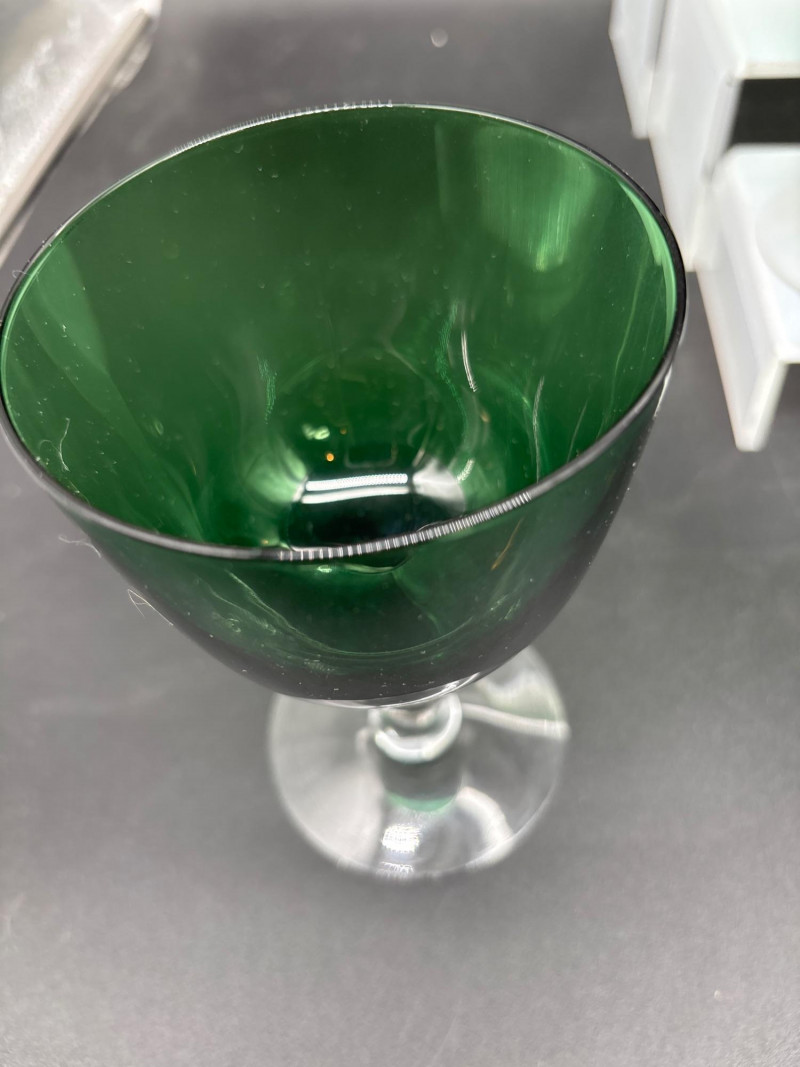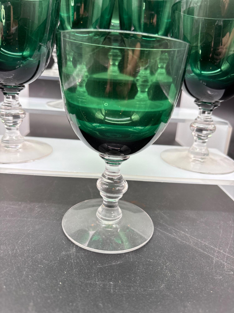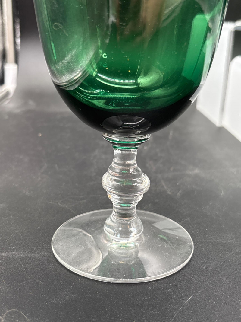 A "Jewel-Toned" masterpiece of American Mid-Century Glass. This set of vintage goblets features the sophisticated Killarney Green pattern by the Tiffin Glass Company. Known for its exceptional clarity and rich, saturated color, this pattern (Stem #17394) is a favorite among MCM collectors and high-end tablescapers. The lot features: Authentic Tiffin Craftsmanship: Produced in the USA during the 1950s and 60s, these pieces represent the peak of post-war American glassware. Dimensions: Each goblet stands 5.5 inches tall, the classic "water goblet" size for this stemware line. Striking Contrast: A deep emerald "Killarney Green" bowl is perched atop a clear, elegantly rippled stem, creating a beautiful play of light. Classic Silhouette: The #17394 stem is noted for its balanced proportions and timeless, sophisticated profile. Condition: Excellent Vintage Condition. The glass remains brilliant and free of clouding (sickness). No chips, cracks, or flea bites observed on the rims or bases. These have been exceptionally well-preserved. SHIPPABLE: Yes.