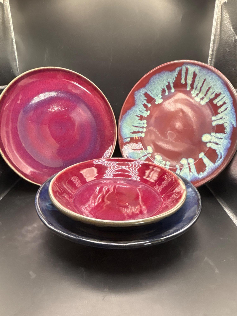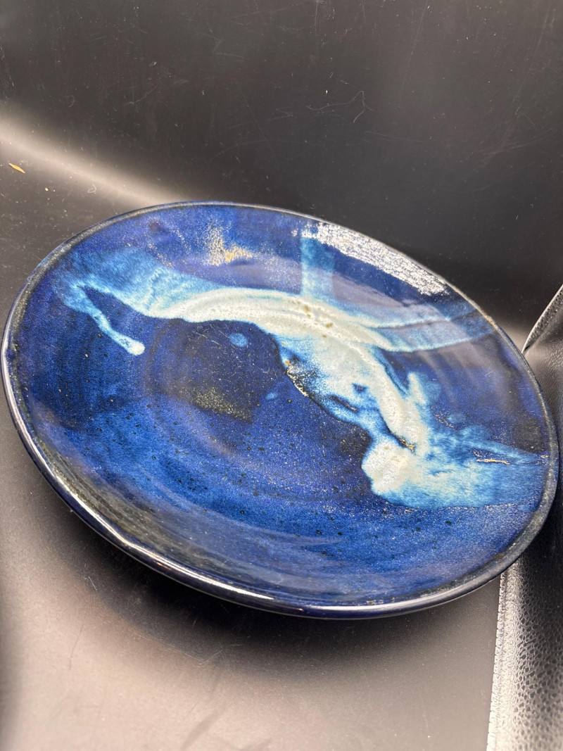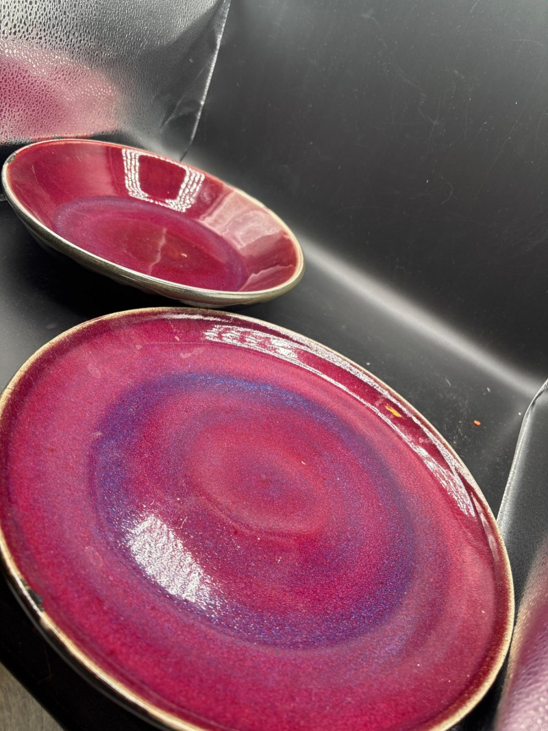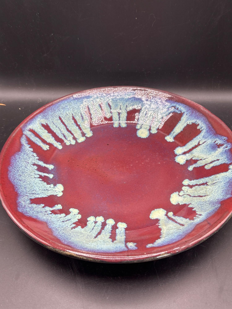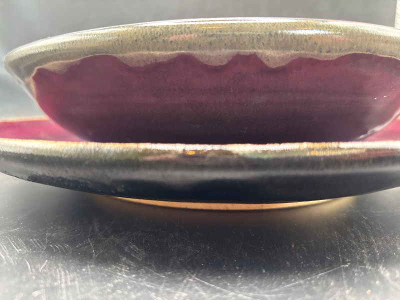 This lot features a stunning 4-piece set of handmade studio art pottery, perfect for collectors of artisan-made ceramics. The set includes one large bowl and three matching plates, all finished in a striking, high-gloss multi-layered drip glaze. The color palette transitions beautifully between deep plum/red and variegated blue and white tones, giving each piece a unique, one-of-a-kind appearance. These pieces serve as both functional tableware and sophisticated decorative art objects. Excellent condition with a vibrant, glass-like finish. Type: Handmade Studio Art Pottery Quantity: 1 Bowl, 3 Plates (4 pieces total) Dimensions: Bowl is 10" diameter; Plates are approximately 12" diameter Finish: High-gloss variegated drip glaze Colors: Deep Red, Plum, Cobalt Blue, and White SHIPPABLE: Yes