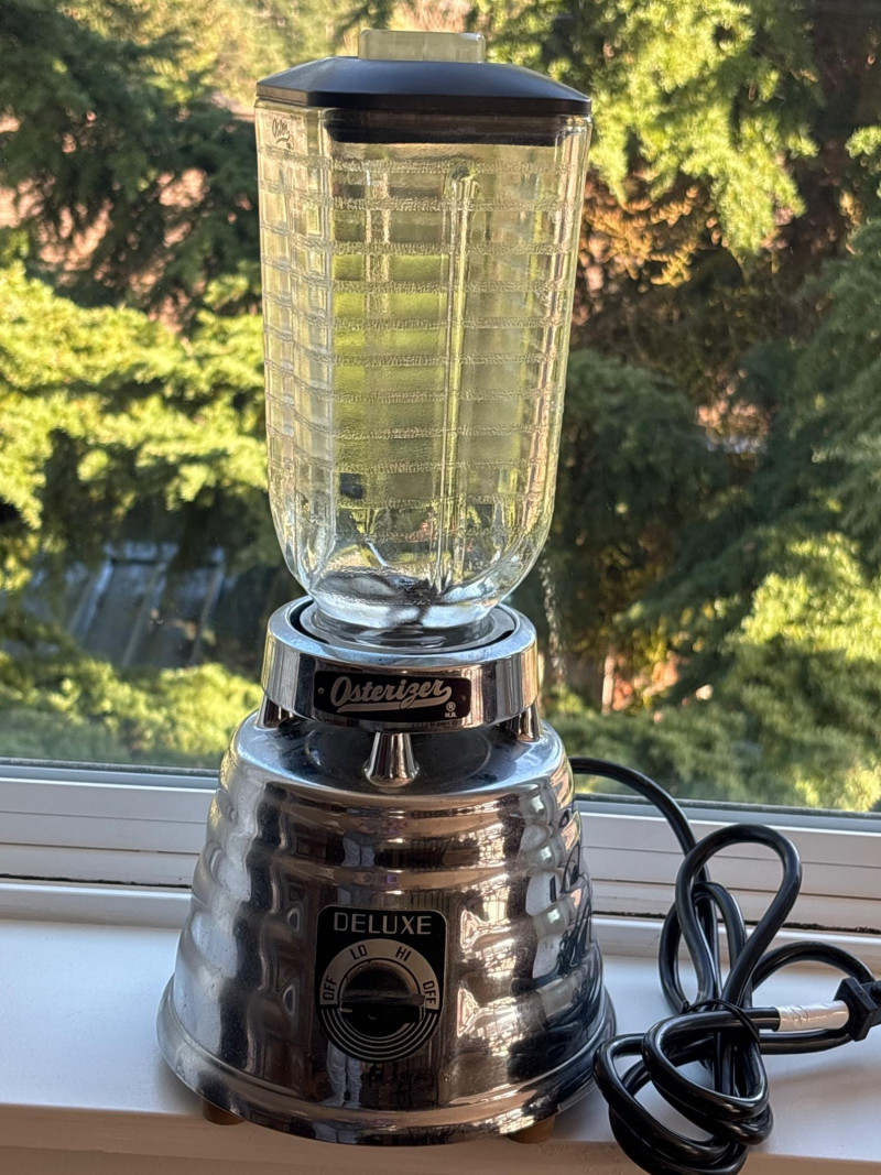 This lot features a classic Osterizer Deluxe "Beehive" blender, a quintessential piece of mid-century Americana. Known for its iconic ribbed chrome base, this Model 403 (or similar) from the 1950s/60s is highly sought after by collectors for both its retro aesthetic and its legendary durability. This unit features a heavy-duty ribbed metal base, a high-quality glass pitcher, and a simple, reliable two-speed rotary dial (High/Low). Tested and functional, it remains a practical kitchen appliance or a standout decorative piece for a vintage-inspired space. Brand: Osterizer Deluxe Design: "Beehive" Ribbed Chrome Base Era: 1950s / 1960s Condition: Tested and works Features: Glass pitcher and 2-speed rotary dial Style: Mid-Century Modern / Retro Decor SHIPPABLE: Yes