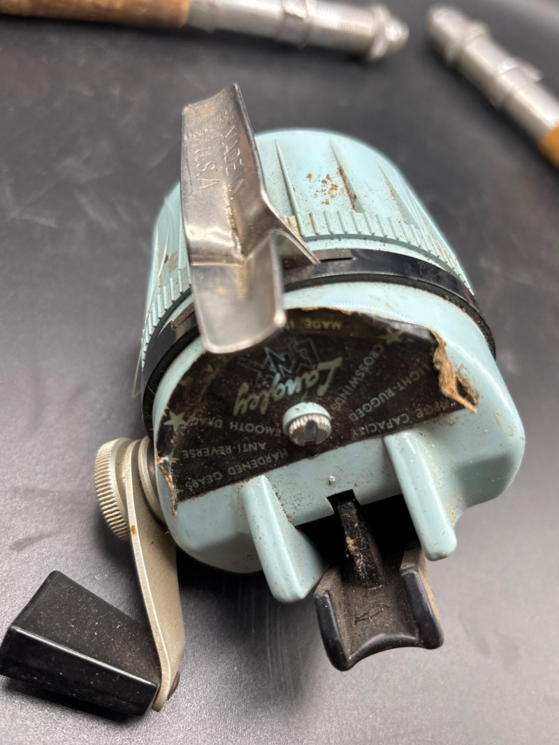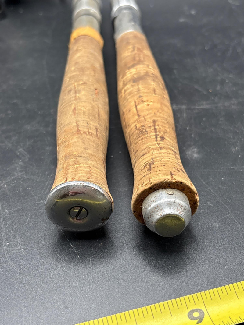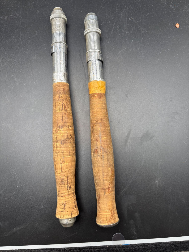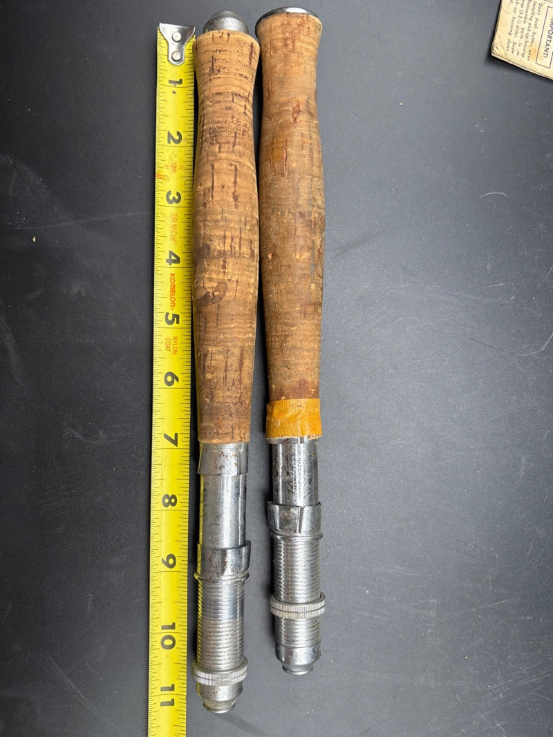 This lot features a prime collection of mid-century angling gear, perfect for collectors of vintage tackle or those looking for reliable, classic equipment. This set includes three distinct reels and two professional-grade rod handles, representing the durable engineering of the 1940s through the 1960s. The 3 Fishing Reels: Vintage Baitcasting Reel (Silver/Metal): A classic "knuckle buster" design, reminiscent of the Shakespeare "Thrifty" or Pflueger models. These were the standard for precision bass fishing mid-century. Garcia Abu-Matic Spincast Reel (Black & Red): A highly recognizable 170 series or Shakespeare 201 style. Known for its "backlash-free" operation and ease of use. South Bend Spincast Reel (Teal/Light Blue): A standout vintage piece consistent with the South Bend Model 77 or 88. Its vibrant color makes it a great display or functional piece. The 2 Rod Butt Sections: These authentic cork grip handles feature heavy-duty metal reel seats. Includes one "pistol grip" style (ideal for baitcasting) and one straight grip, typically paired with the high-performance fiberglass blanks of that era. Whether you're restoring a vintage setup or adding to a display, these pieces offer the heavy-duty construction and retro aesthetic that modern gear can't replicate. SHIPPABLE: Yes