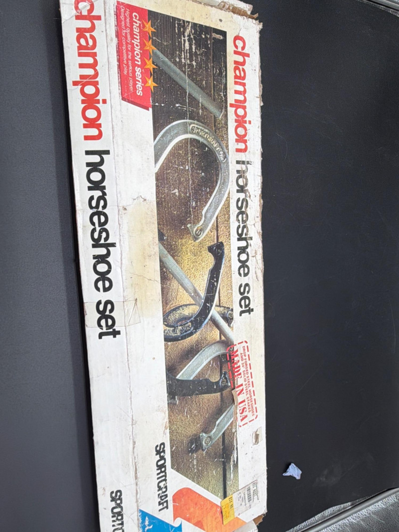 This lot features a complete, classic Horseshoes Game Set, ready for your next backyard gathering or competitive tournament. This heavy-duty set includes the traditional iron shoes and the essential ground stakes required for play. While the set has been previously enjoyed and shows characteristic signs of use, it remains in solid, functional condition. It comes in its original storage box, making it easy to transport and organize between games. This is a durable, "built-to-last" set that offers the authentic weight and feel of a professional-grade horseshoes game. Contents: Complete set of horseshoes and ground stakes Condition: Used / Solid functional condition Storage: Includes original manufacturer's box Material: Heavy-duty cast iron construction SHIPPABLE: Yes