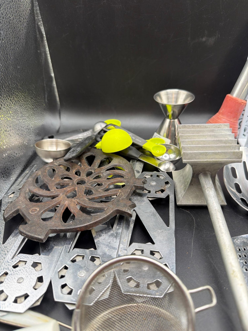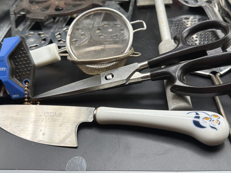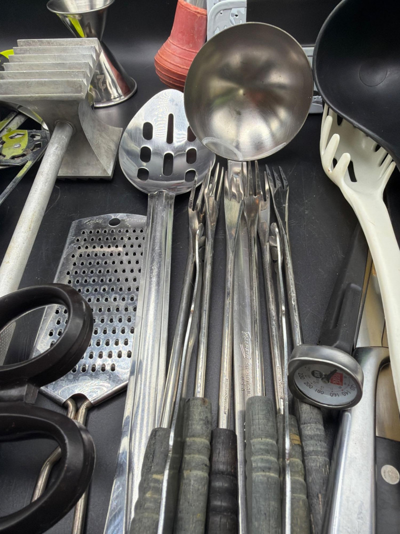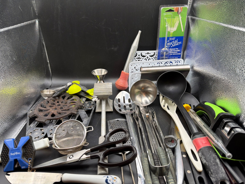 This is a huge, diverse collection of professional-grade kitchen tools and specialty gadgets, perfect for the home chef, entertainer, or vintage kitchen enthusiast. This high-value lot features a deep variety of precision maintenance tools, heavy-duty preparation aids, and premium serving utensils. Premium Maintenance & Precision Tools: DMT Crystal Saver: A professional-grade diamond file (325-mesh) specifically designed to smooth jagged or chipped edges on fine crystal, ceramics, and glass. Made in the USA. AccuSharp SharpNEasy 2-Step Sharpener: A reliable pull-through knife sharpener featuring pre-angled ceramic rods for both coarse sharpening and fine honing. Professional Preparation & Serving Aids: Large Assortment of Utensils: Includes premium Calphalon slotted spoons, heavy-duty stainless steel ladles, and versatile serving tongs. Specialty Prep Tools: Featuring a classic metal meat tenderizer, a vintage aluminum turkey baster, and various fine-mesh strainers and infusers. Specialized Service Set: Includes tongs and forks consistent with high-end seafood or escargot service. This expansive lot offers an incredible variety of functional, high-quality tools that are built to last. From high-end crystal repair to professional meat preparation and elegant serving, this bundle has everything you need to fully kit out a gourmet kitchen. SHIPPABLE: Yes