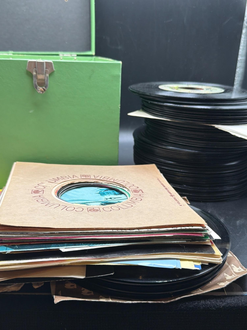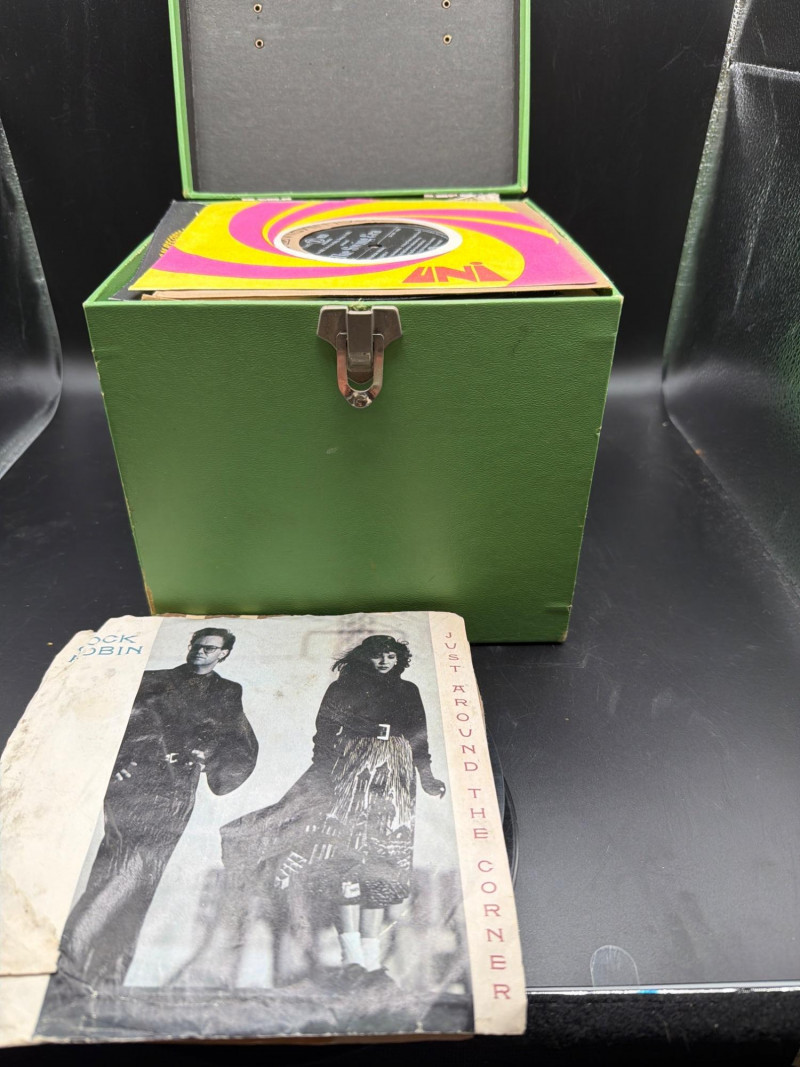 The Collector's Bundle: Authentic Disk-Go-Case: Features the classic "twist and lock" handle mechanism that keeps your collection secure. These cases are famous for their vibrant colors and durable, lightweight plastic design. Large Record Lot: Includes an expansive collection of 45s. While some remain in their original paper sleeves, many are stored directly on the center spindle of the Disk-Go-Case—just like they were at a '70s dance party! High Variety: This lot offers a deep dive into the golden age of the 45 RPM single, perfect for jukebox owners, DJs, or anyone looking to discover classic hits. Whether you're looking for the nostalgic "click" of the Disk-Go-Case or a ready-made vinyl library, this lot is a standout addition to any music collection. Storage Capacity: The Disk-Go-Case holds approximately 60 records. Condition: Authentic vintage condition. Records range from sleeved to unsleeved. Special Interest: Mid-century modern (MCM) music culture and retro portable storage. SHIPPABLE: Yes Please note: Shipping is charged separately from the auction. Once the auction invoice is paid, if you chose shipping, a second invoice for the exact shipping cost will be sent to the winner. Combined shipping is available for winners of multiple shippable lotsGemini said